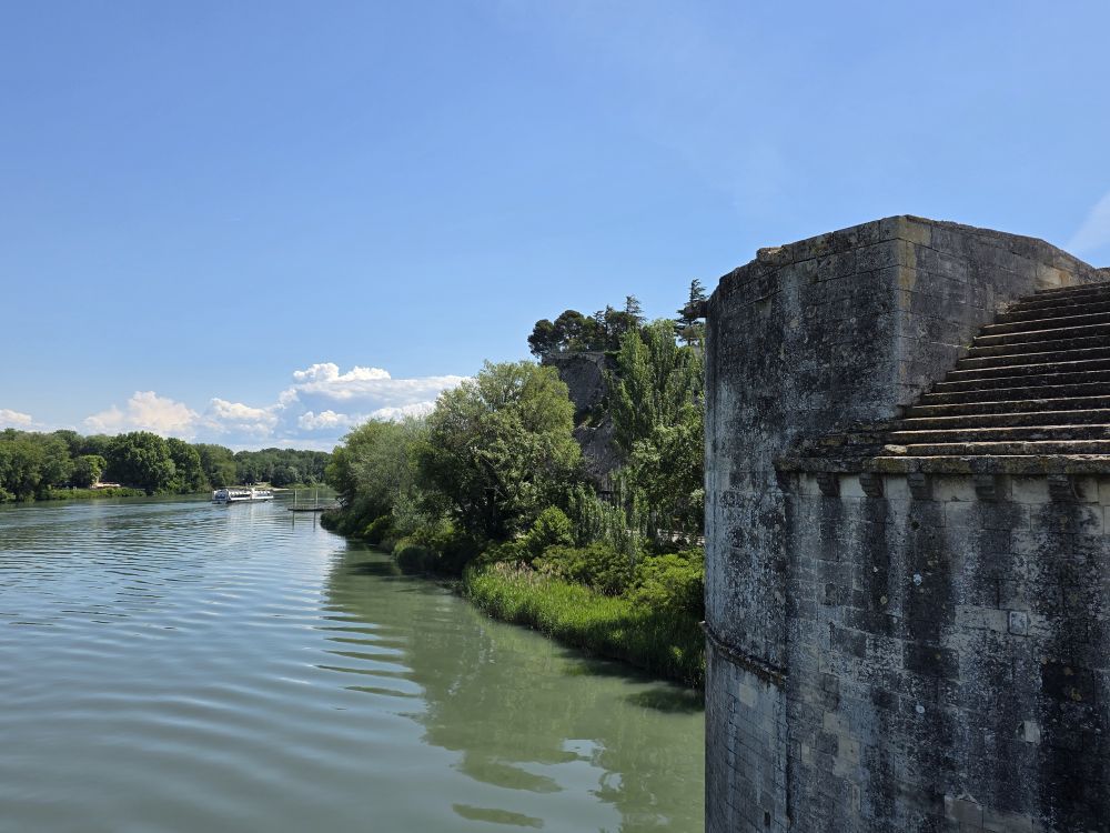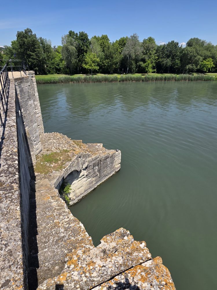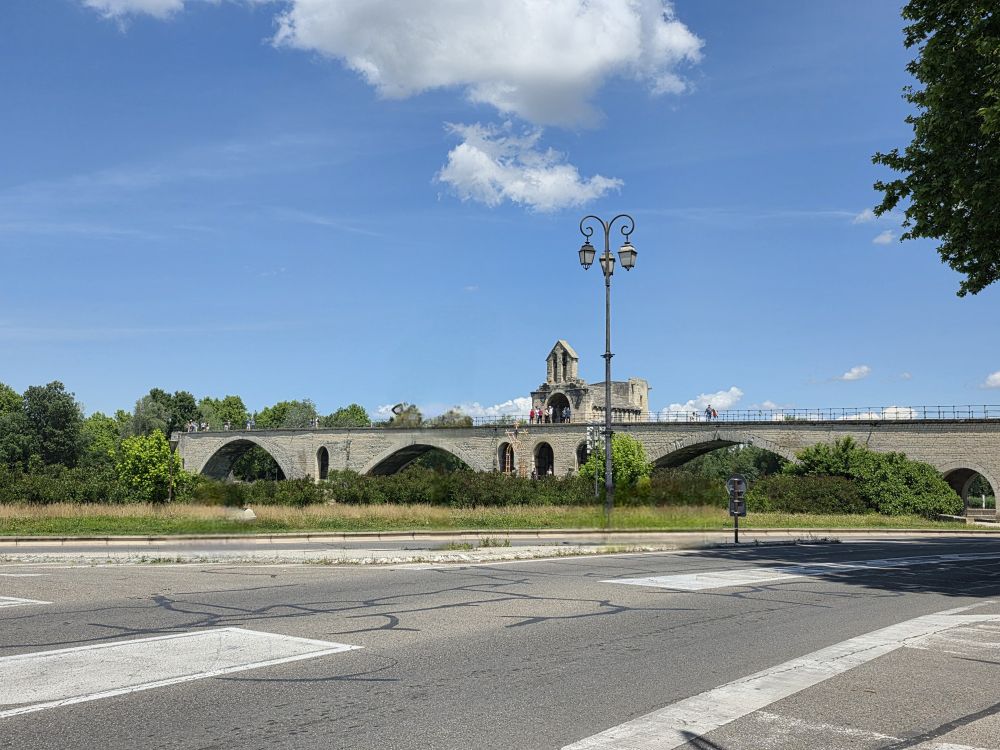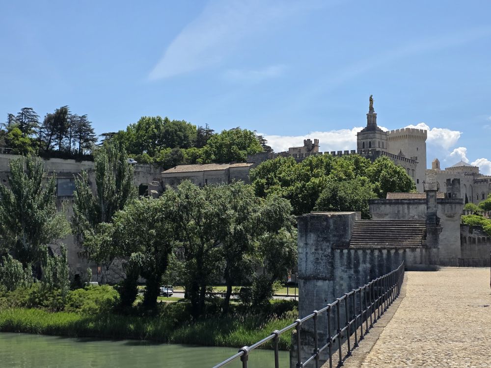 Originally built of wood in the 12thC, destroyed in a siege, then rebuilt in stone with 22 arches that spanned the Rhone river connecting Avignon to Villeneuve-les-Avignon, the bridge was abandoned in the mid-17thC because the arches would collapse each time the Rhone flooded and it was extraordinarily expensive to maintain. Today only 4 arches and the gatehouse of Pont d‘Avignon remain, making it look like the bridge to nowhere. Although a very picturesque bridge to nowhere with views across the water on one end and across the old city on the other.