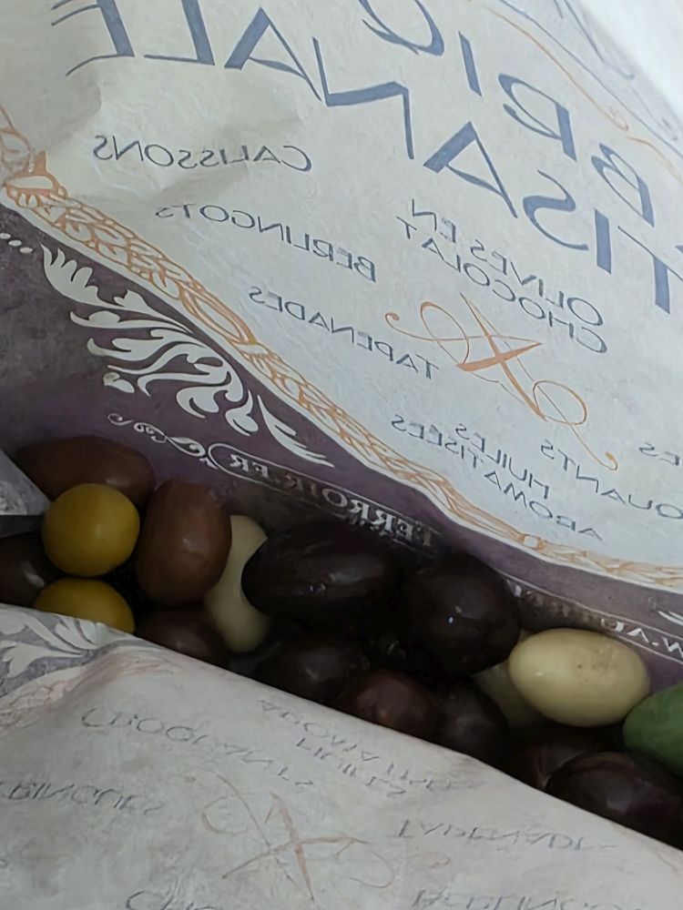 Nearing our meeting time, we head back into town, wander a bit down the shopping street, stopping at Autrefois, a local artisanale sweets manufacturer where we bought some wonderful chocolate candies filled with all different sorts of ingredients – olive (they were green, but were actually chocolate covered almonds!), caramel, crème brulee. Plus an assortment of caramels for snacks later (on the bus, excellent little treats), then met the group on the Place and clip-clopped our way back to the bus.