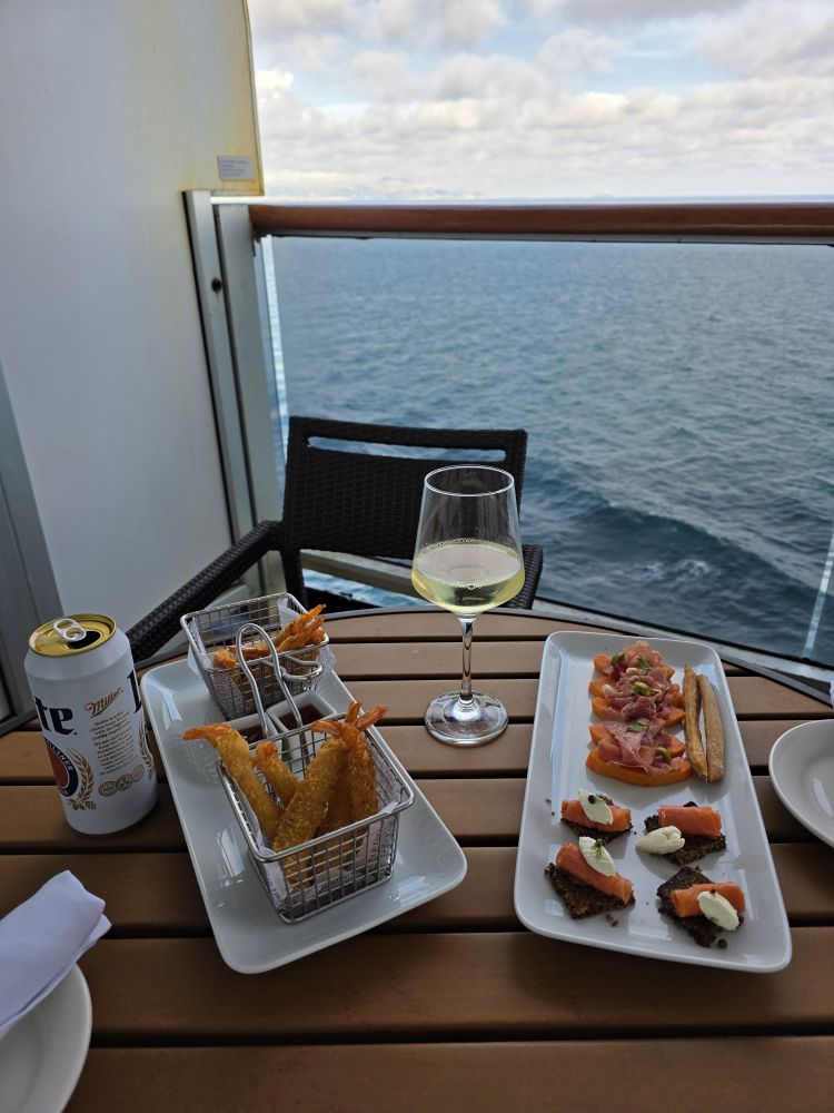 Planning ahead this morning, when we saw the weather was going to be nice this evening, and not wanting to hassle with the dining room or buffet, we decided to have snacks for dinner, pre-ordering the “suite hors d’ourves” – tempura shrimps, prosciutto and smoked salmon and cream cheese. So very good and so perfect on the balcony enjoying the coastal scenery as we sailed.