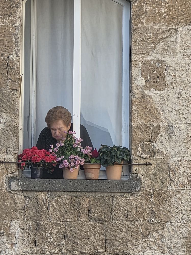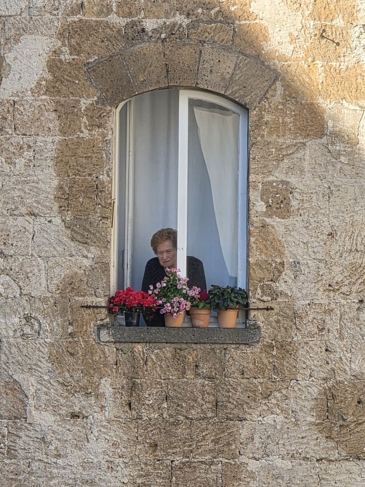 This morning is all peace and quiet in our wonderful villa. Coffee in the kitchen – too chilly for the patio this morning – and fun taking pictures of the old woman across the piazza tending her flowers. She stands in the window so still that we thought she might be a painting! She is quite alive though, just obviously patient and slow moving.