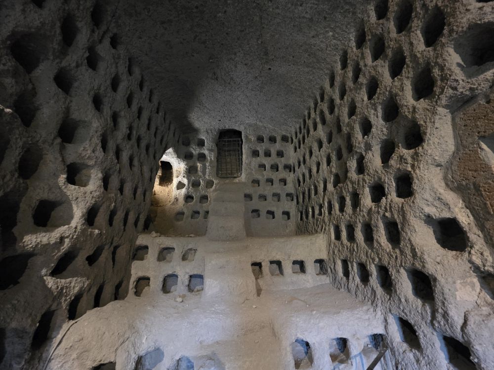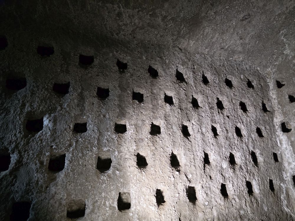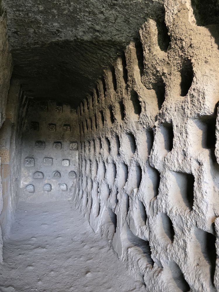 Entering into another tunnel/cave, Jessica shows us these holes in the walls and asks for guesses as to what they were used. We’ve no idea – and we’ve been here before! They are pigeon farms. People used to have pigeons here, they could fit 2 in each little hole where they would harvest the eggs, and breed them, to then later eat them. Pigeon – or Piccione – is a specialty here in Orvieto. There are a lot of holes down here, there must have been a whole heck of a lot of pigeons in the day!