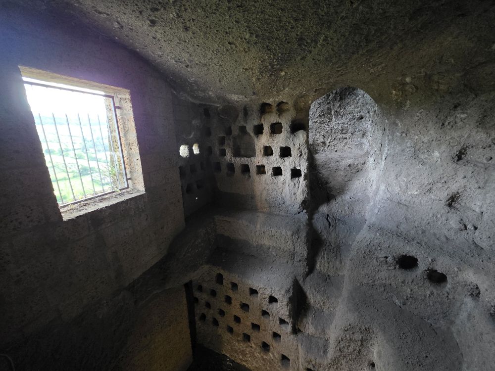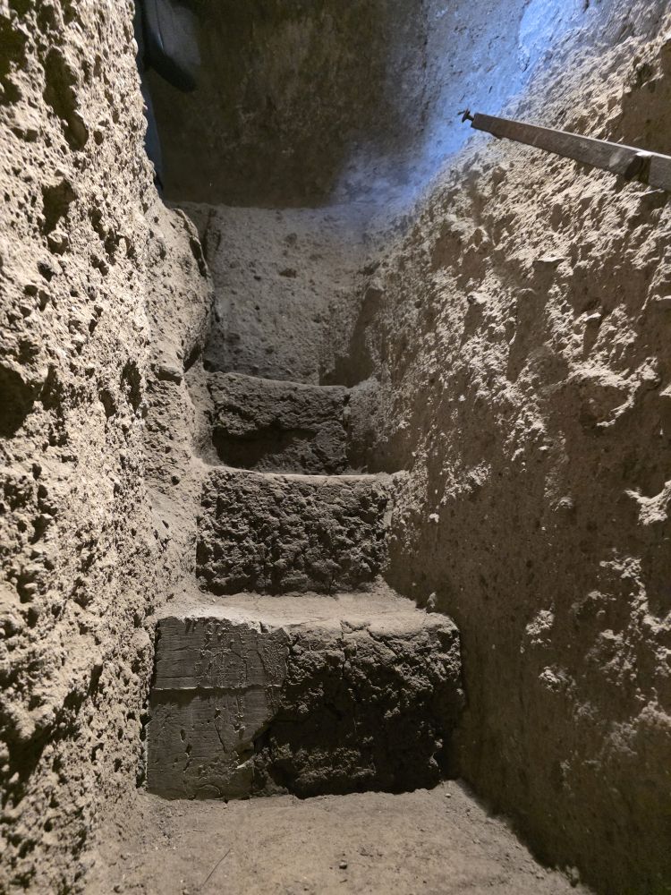 Then we are called for the tour. Unlike our first tour years ago, when it was just the 2 of us and the guide, this tour has lots of people, and an adorable guide, Jessica, who gives us so much information and is such a joy. Just an excellent experience, and to be honest, we didn’t remember a thing from the first tour! We learn all about the tunnels, how the Etruscans first built them, by hand, mostly for water access. They built footholds into the side of well to climb down and then up again with a water bucket. The caves were repurposed over the years as cellars or for pottery or olive oil processing, even as safehouses during the war years.