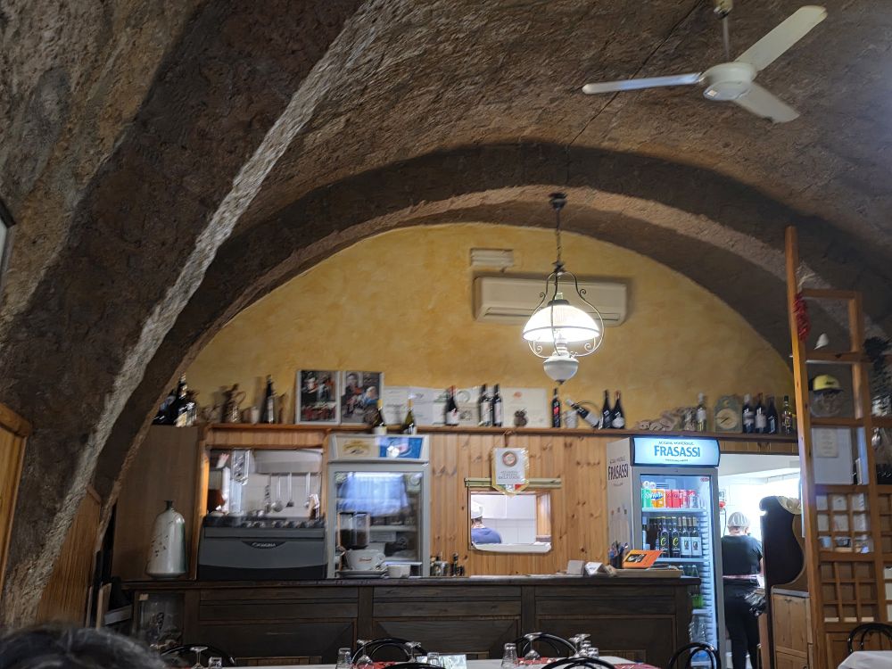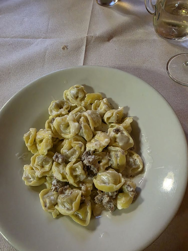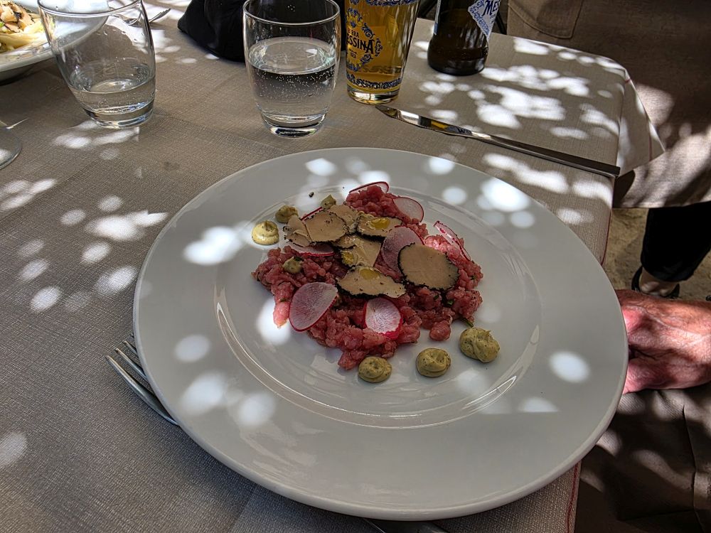We of course are getting a bit peckish by this point, and we land on a great restaurant called La Cantina di Arianna with a fantastic garden patio in the back. Commandeering a table in the shade, we sit down to a lovely meal of Strigoli con Asparagi, Guanciale e Tartufo (short pasta with asparagus, bacon and truffle) for G&S, Battuta di Carne Locale Tartufo e Maionese al Pistacchio (beef tartare with truffle and pistachio mayo) for Ed and what turned out to be Eggplant stuffed with sheep cheese sauce for me (I had wanted the Carciofi – artichoke – prepared the same way, but they didn’t have it today, only eggplant, so I figured what the heck? I’m game!). Lovely meal all around (except the wine, which Sigis and I shared – that was not good wine. Great pitcher. Not great wine!).