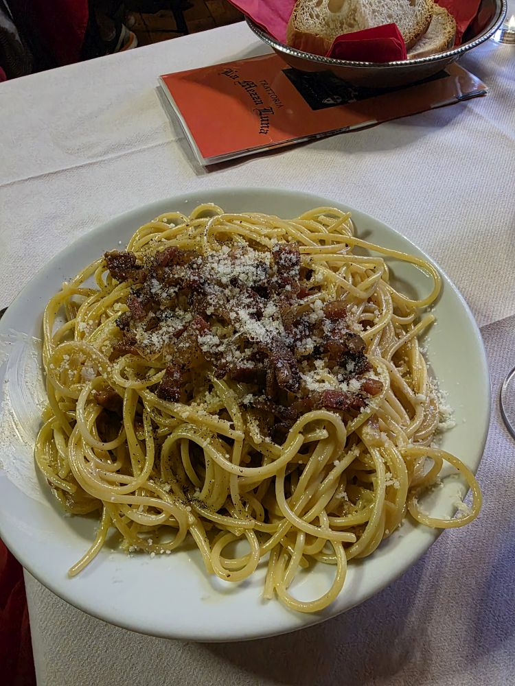 Pulling ourselves away from his magnetic personality, we walk around the corner for dinner at Meza Luna. Unfortunately, when I went in to ask for a table, every one had a reserved sign on it. Pooh. I asked the guy at the counter anyway and he muttered “4 personas, 4 personas,” and started scratching names off a list he had on the counter, then put 2 tables together for us! Perfect! And because Mezza Luna is famous for their Carbonara – that’s what we ordered. Well, Gaby, Sigis and I ordered it. Ed stuck with his Tortellini ala Norcina (i.e., cinghiale). Excellent dinner. An excellent night capping an excellent day.