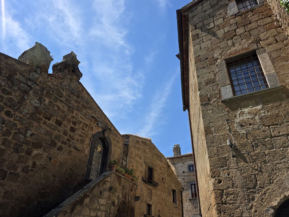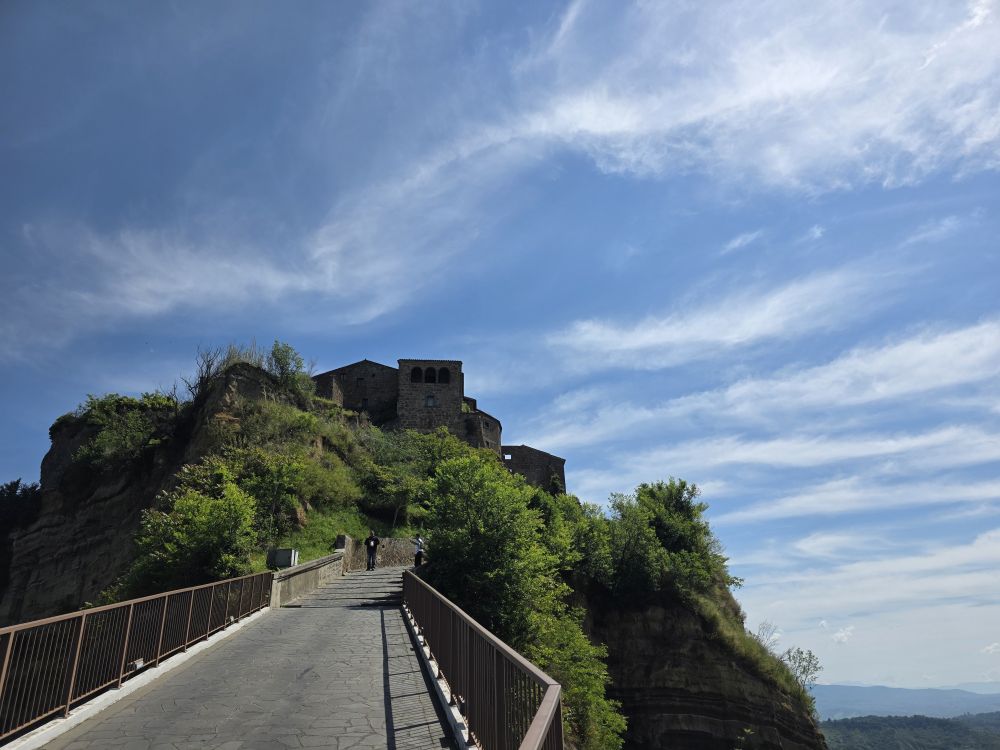 The long walk down – meaning a long walk up – hasn’t changed, nor have the sights. The surrounding landscape is equally gorgeous, all green and lush. Civita appears magically, just as it always has, rising above everything with the narrow, now manmade, bridge built in 1965 that attached the town to the “mainland” for lack of a better term. Gaby says it reminds her of the Great Wall of China – and we all have to agree. It definitely has that feel.