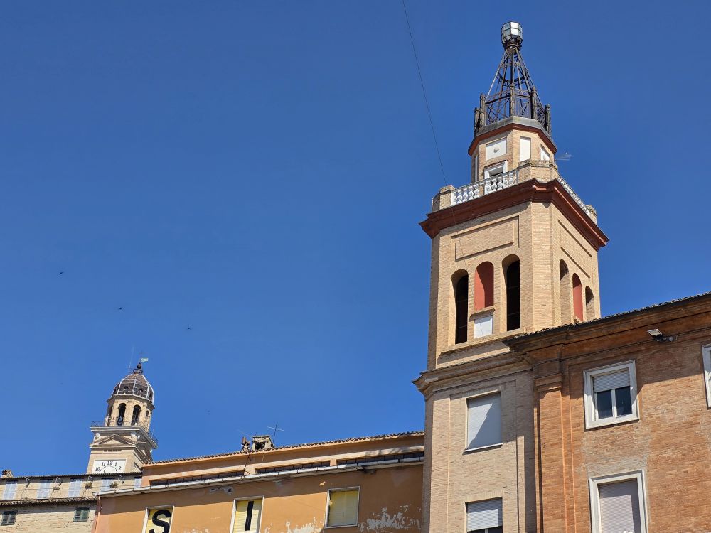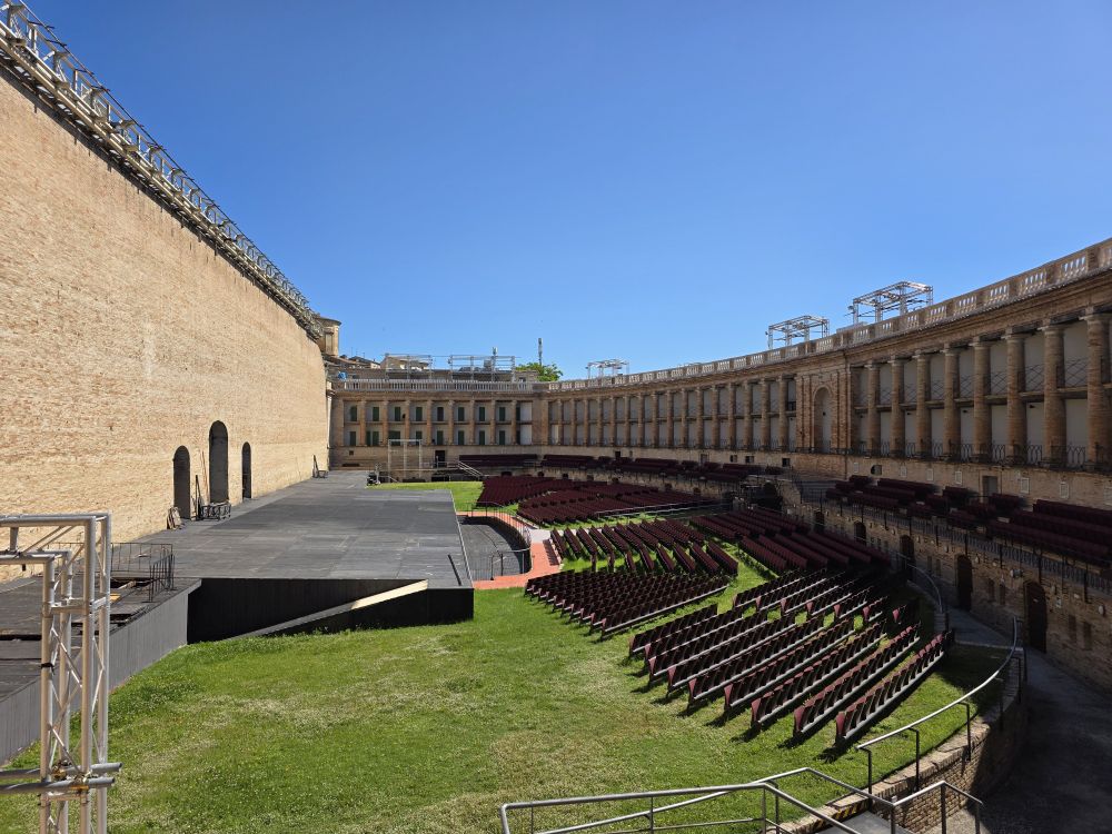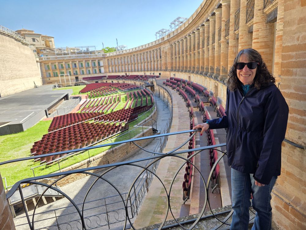 Eventually we just take a couple of turns around the walking track, then head back to the apartment to freshen up for our explorations. First stop: The Sferisterio,all the way across town (a whopping 17 minute walk). Built at the request of a group of citizens of in Macerata “to embellish the town and for public amusement” in 1829 it is one of the biggest open-air theaters in Italy. Originally designed to host the Palla al Barcciale, one of the oldest games in Italy. Similar to tennis, the Palla, or “Ball and Bracelet” as it is also known, involved hitting a ball back and forth across a court using a weird wooden “bracelet” with spikes that was worn on the forearm. Over the years, though, the game’s popularity declined in favor of soccer or actual tennis, and the arena was used for many other disparate functions: military parades, political meetings, festivals, circuses, bullfights. But in 1921 an opera – Aida – was staged here for the first time. The incredible acoustics and visibility led the Sferisterio to become one of Italy’s main opera theaters – not to mention performance stage for all sorts of international musicians and singers. (In a bizarre twist of “small world,” Gaby and Sigis are coming here in August for the Opera Festival held here every year!)