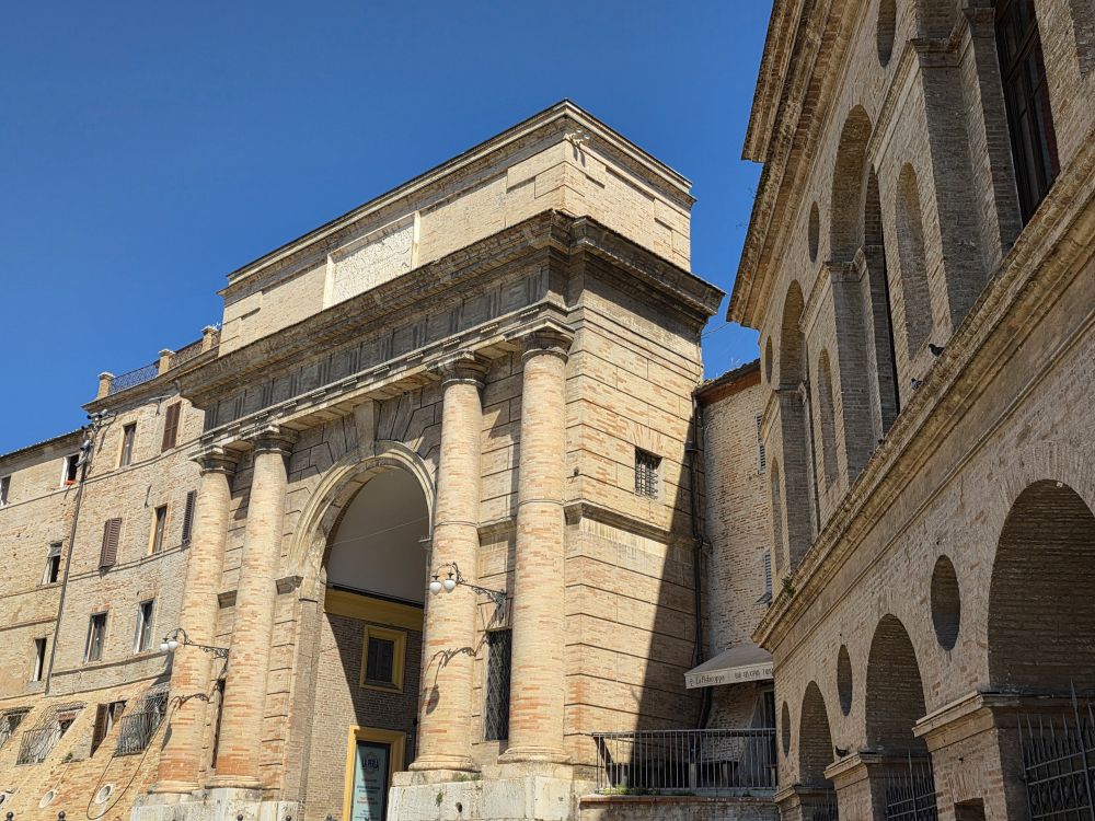 Back out on the street, we walk around the traffic circle for better photos of the Sferisterio’s exterior, and the adjacent Porta Mercato gate …