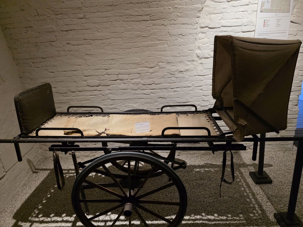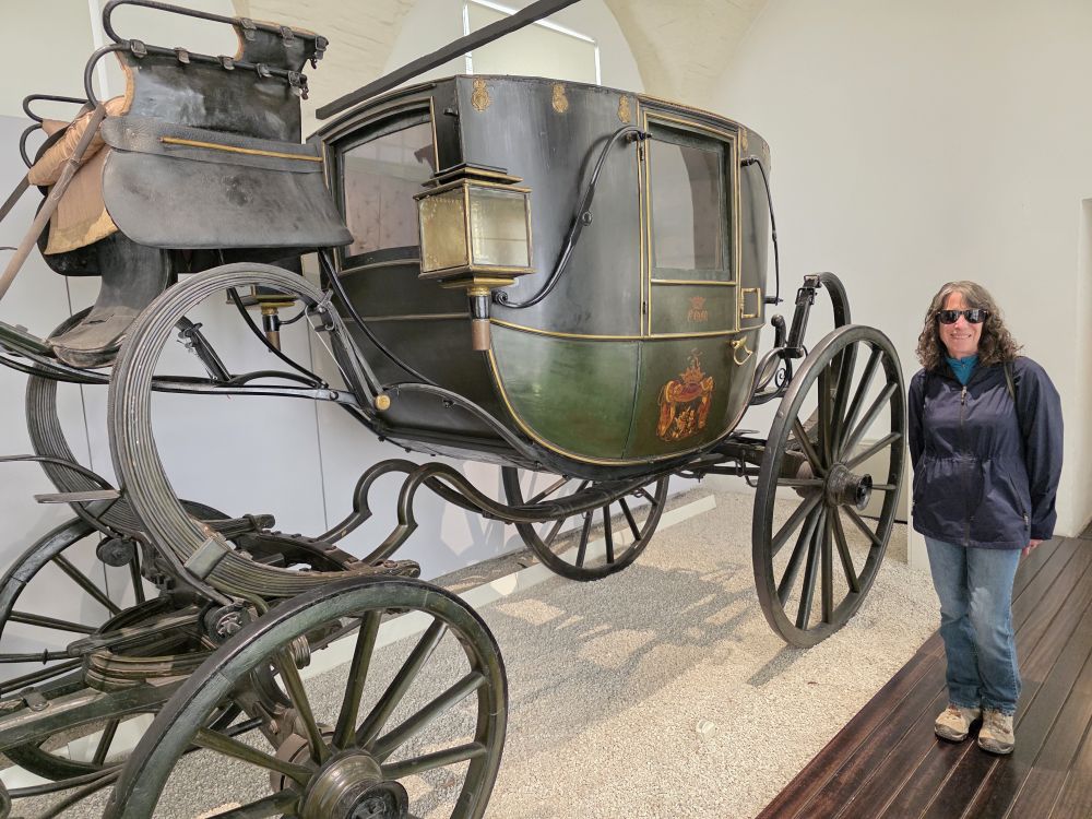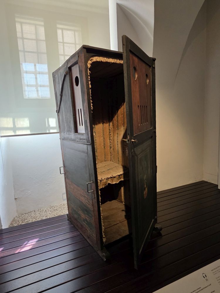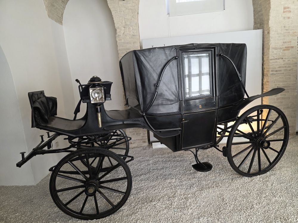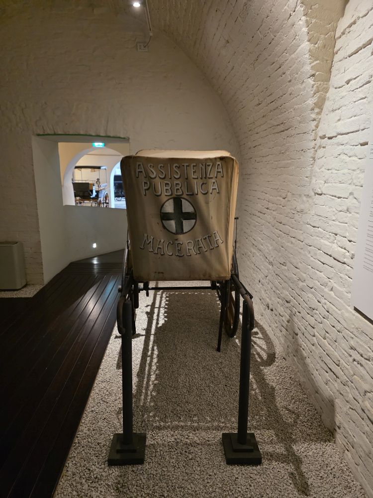 We begin in the basement with the Museo della Carrozza, the Carriage Museum. This is a collection of 24 carriages owned by the Count, originally scheduled to be burned when he died. A close friend suggested he donate the carriages to Macerata for a municipal museum – thus the creation of this amazing display. Everything from a late 18thC “sedan chair” to a hand-carried stretcher to more modern prototype of the first motorcoach is displayed along a winding path through the basement. There is also a display of luggage – and an explanation of how it had to be in pre-determined shapes to fit inside the carriage – as well as other accoutrements that would be found in the carriages of the day. Really interesting.