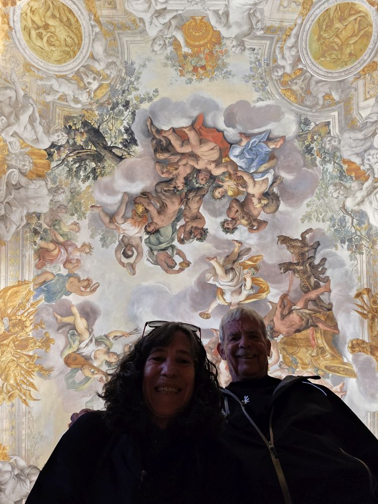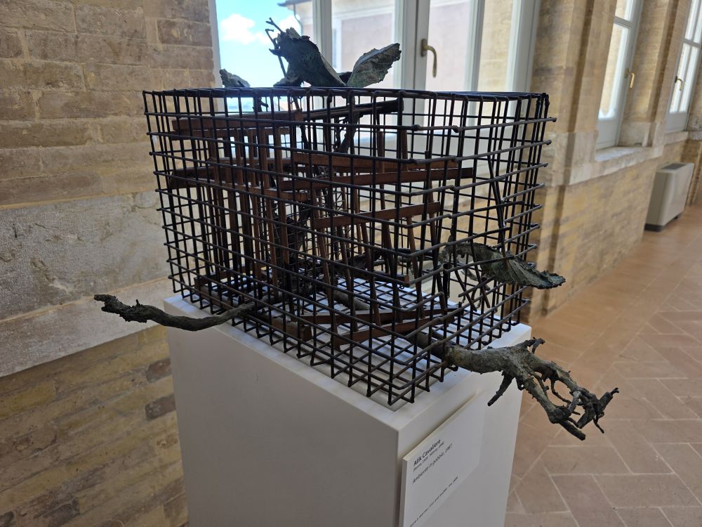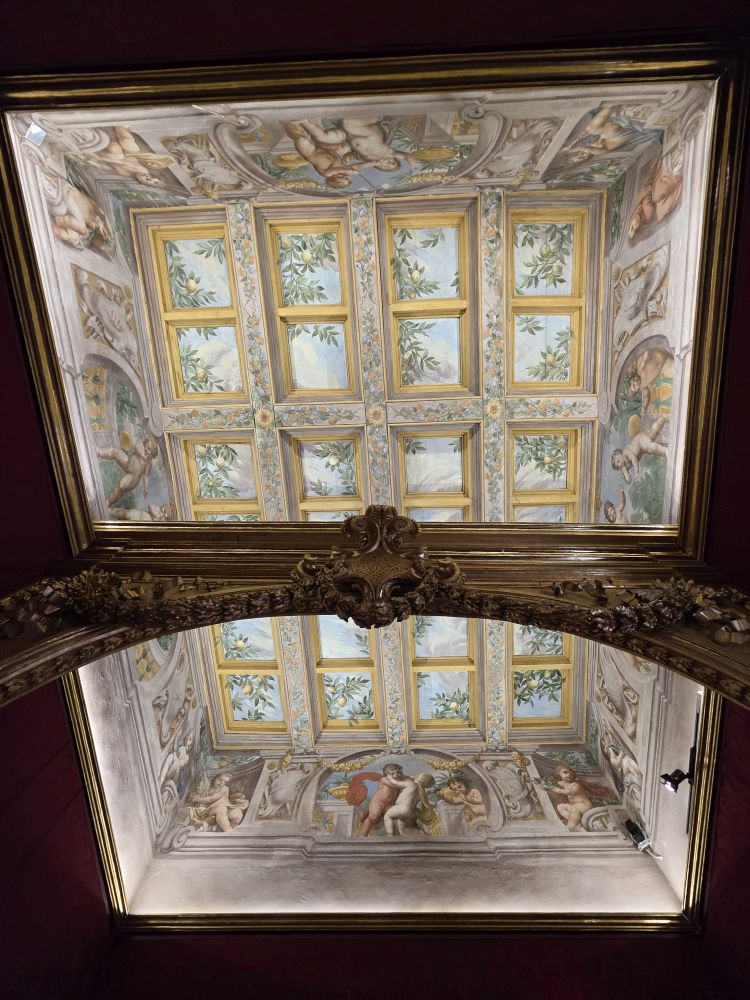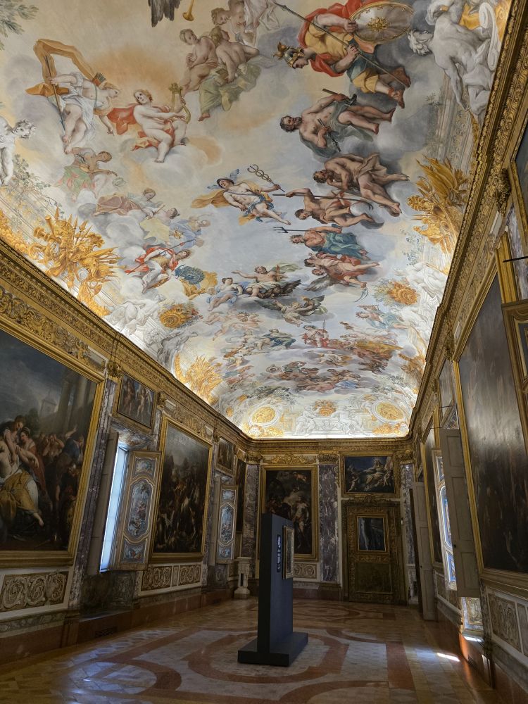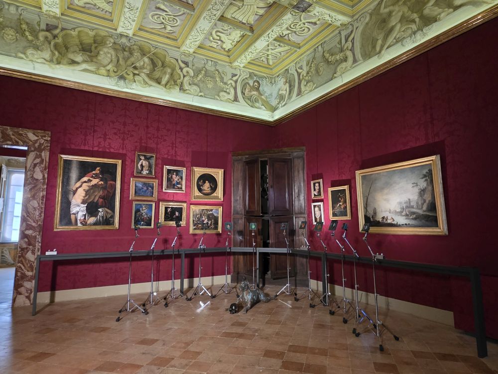 Back upstairs, we head all the way up to the top floor for the modern art collection, which is a very interesting juxtaposition of modern art against the background of old classics. It is a little confusing and jarring, but nonetheless interesting. Modern metal art beneath a domed frescoed ceiling. An odd steel/iron cage, called “caged environment”, filled with strange items placed near windows where we can see the gorgeous patio/garden and surrounding countryside. And frescoes, frescoes everywhere.