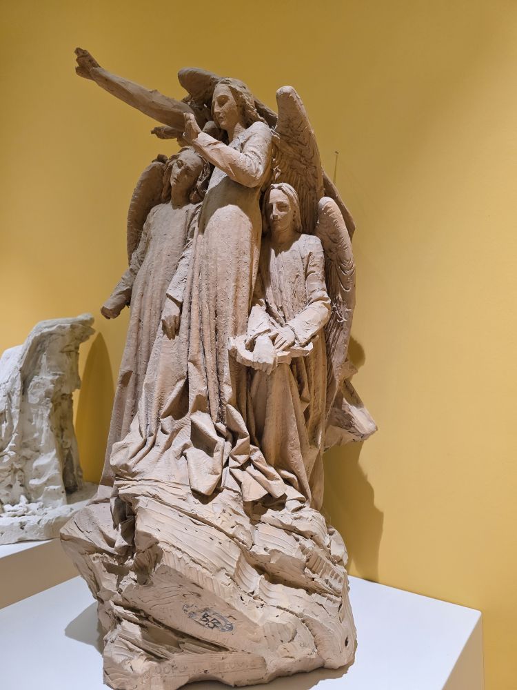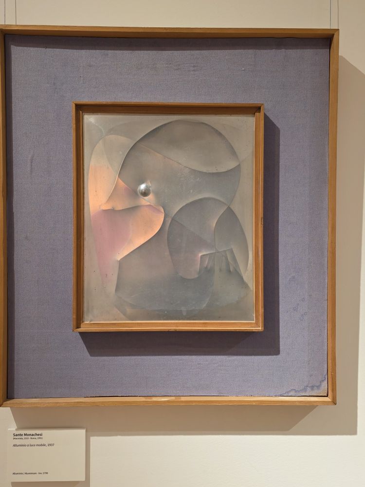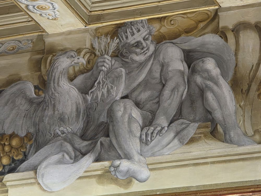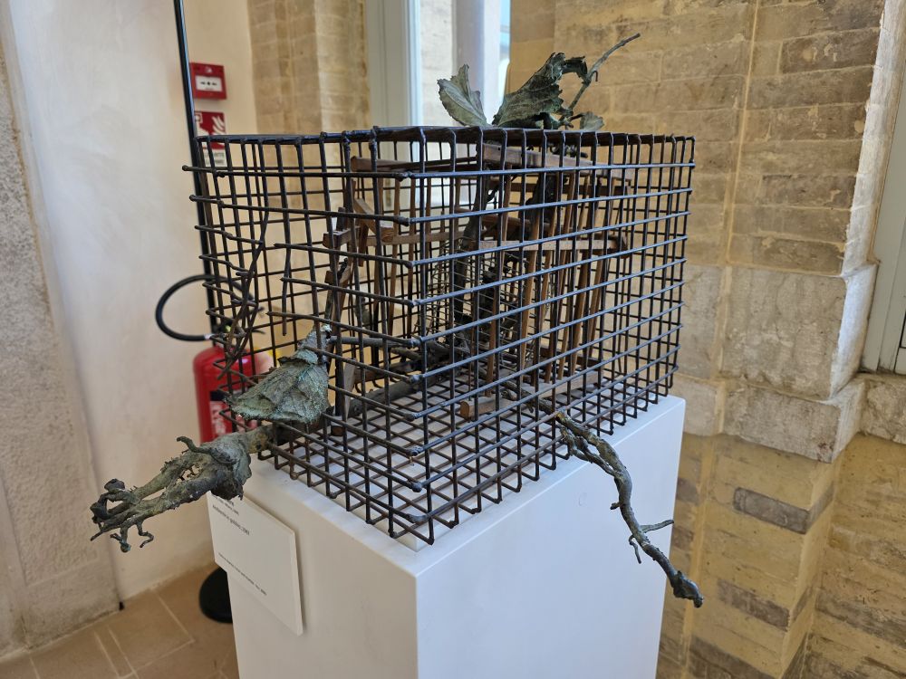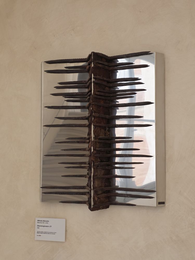 Back upstairs, we head all the way up to the top floor for the modern art collection, which is a very interesting juxtaposition of modern art against the background of old classics. It is a little confusing and jarring, but nonetheless interesting. Modern metal art beneath a domed frescoed ceiling. An odd steel/iron cage, called “caged environment”, filled with strange items placed near windows where we can see the gorgeous patio/garden and surrounding countryside. And frescoes, frescoes everywhere.