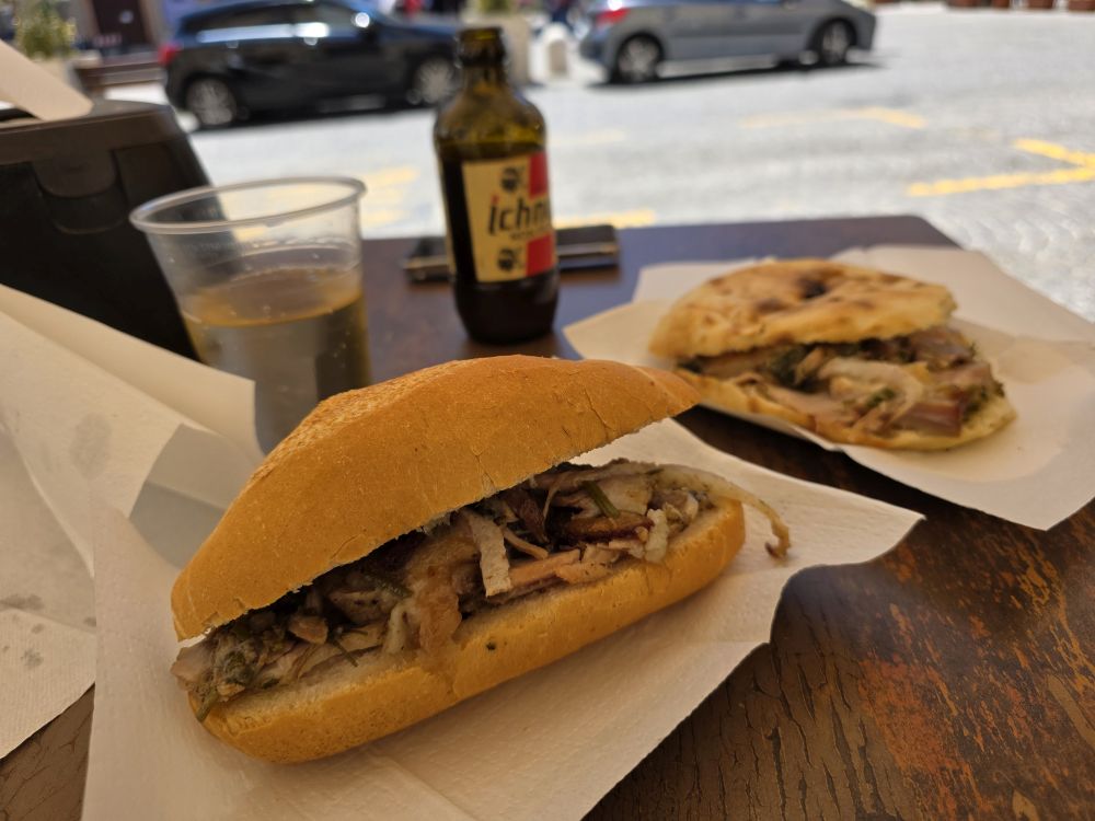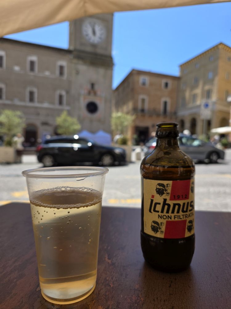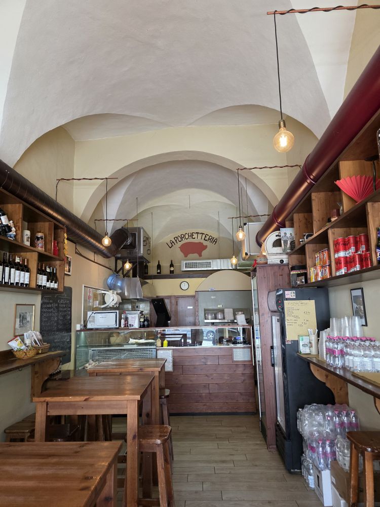 Stopping quickly on the first floor for the Ancient art gallery, we make short work of those displays, then make our exit back out onto the old town streets. It’s lunch time, and we are in very near the Piazza della Liberta, the main square of the town where the Torre Civica is located (and our afternoon excursion). That being said, we had spied the perfect lunch place on our reconnaissance yesterday: Porchetteria Centrale. Oh yeah! This may be our last chance at Porchetta and we are not blowing it. Essentially a little deli style restaurant, we order from the counter inside, opting for a traditional Panini and a Crescia (the traditional type of bread here in Umbria and Marche), then take our beer and wine (yes, that plastic cup full of liquid is my wine!) outside to a lovely, shaded table across from the tower to watch the goings on around the Central square. Perfect!