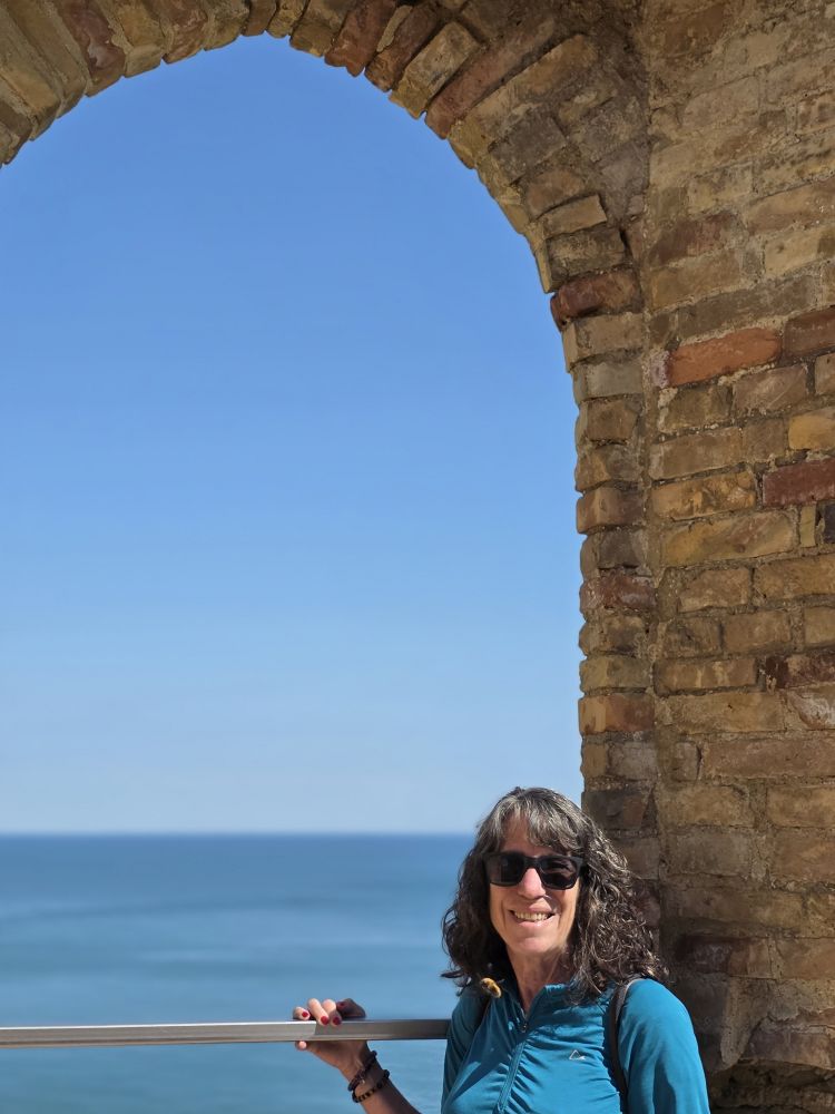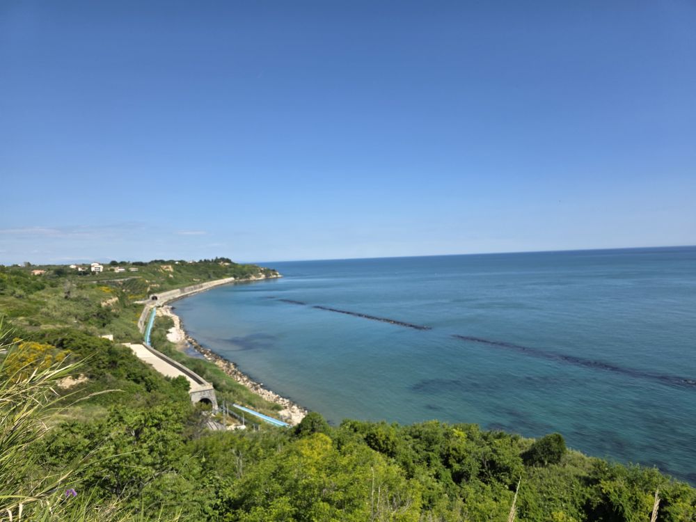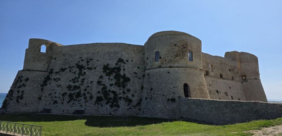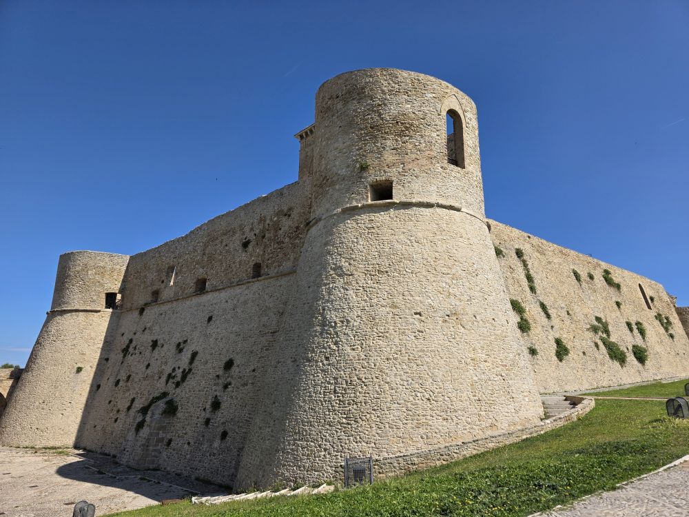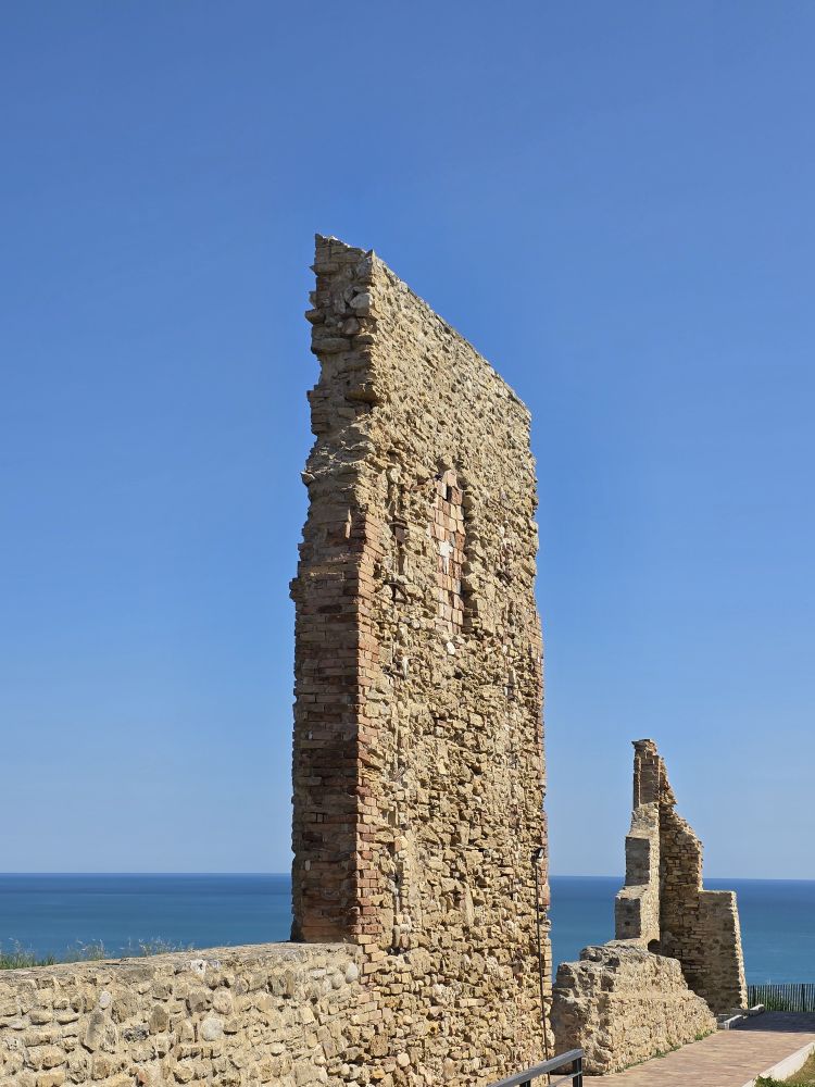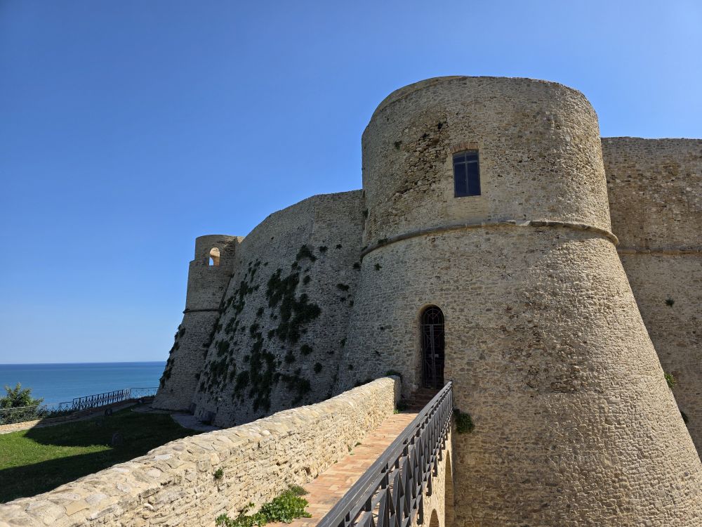 We had chosen a midway point to stop for explorations before we knew we could get into the house early, but we still needed to stop for another picnic lunch, so we continued on to Ortona and the Castel Aragonnes as planned. Built in 1492 as a defensive castle unto the 17thC when it was converted into a noble residence, the castle still stands today on the coast of Ortona. In 1943, the castle being used as a gunpowder store, was bombed and blew up, then in 1946 a landslide destroyed almost half of the castle. Today, only the perimeter wall and towers remain, but it is still a fun place to visit – even for a quick visit as it were.
