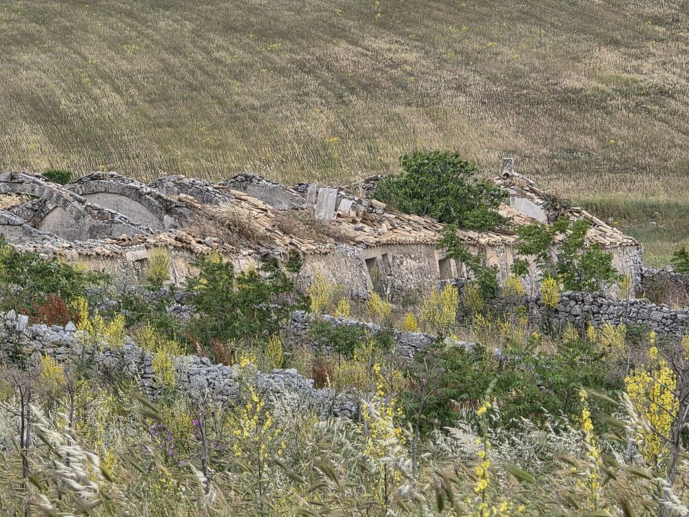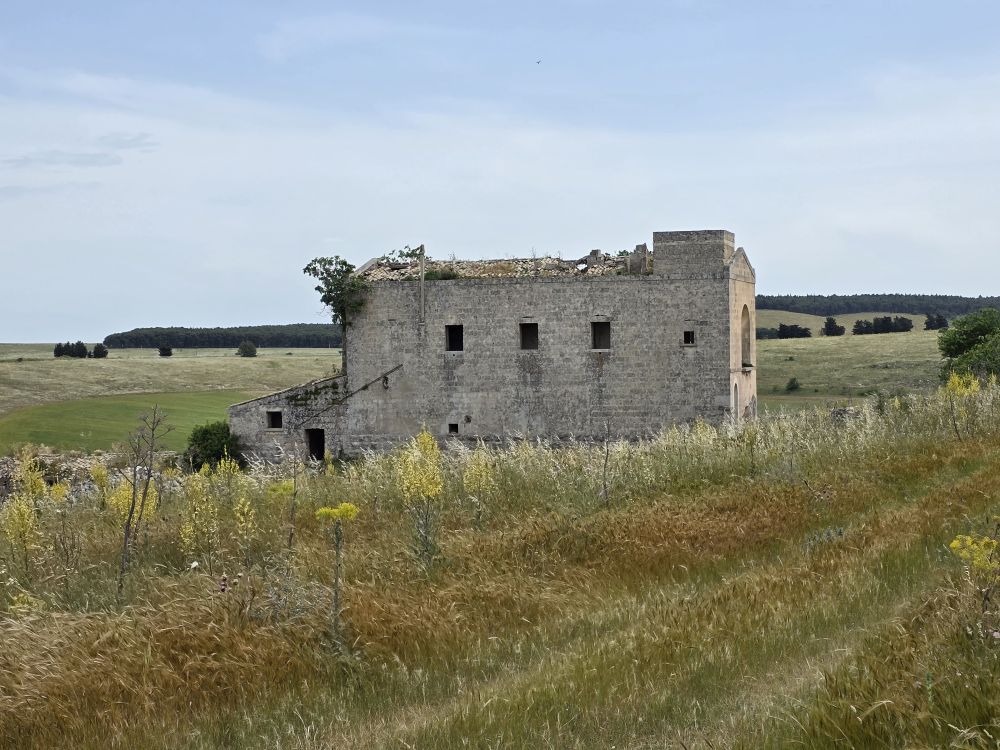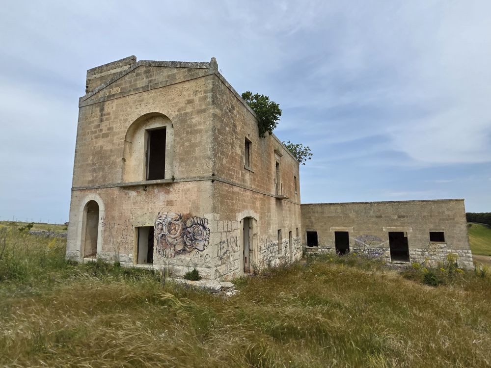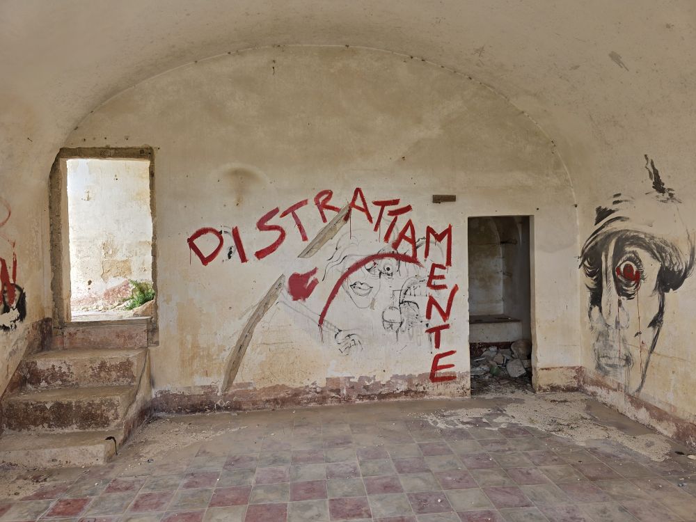 In researching this hike, we had also found what was reportedly a ghost town. Yes! And it is right across the hillside from the path. You can sort of see it when we round the bend of the forest. You know we are exploring that. After our hike is complete, we head over there, slowly navigating up this 2 track road through the fields to Masseria Guarlamanna – an abandoned farmhouse and village from the early 1960s. A little more modern than our normal ghost towns, but fascinating nonetheless.