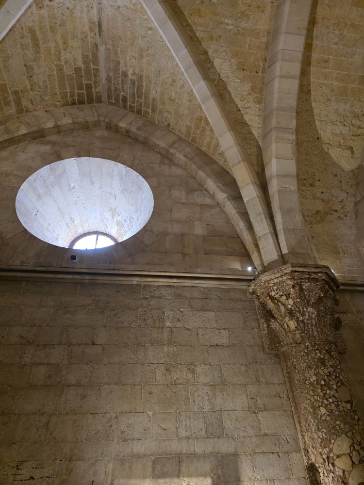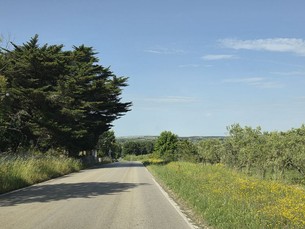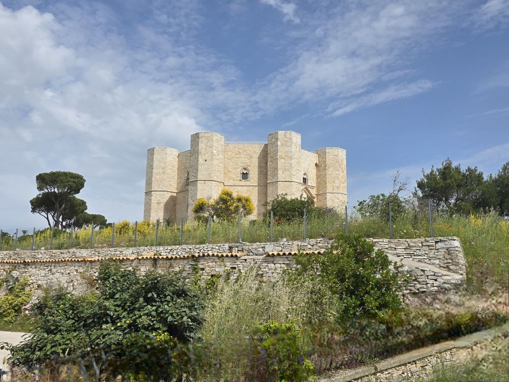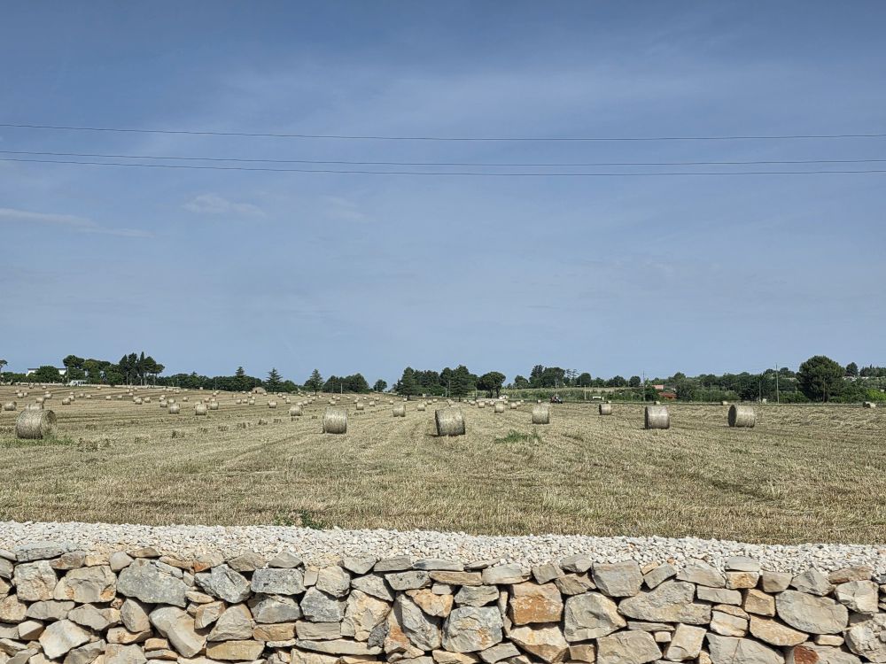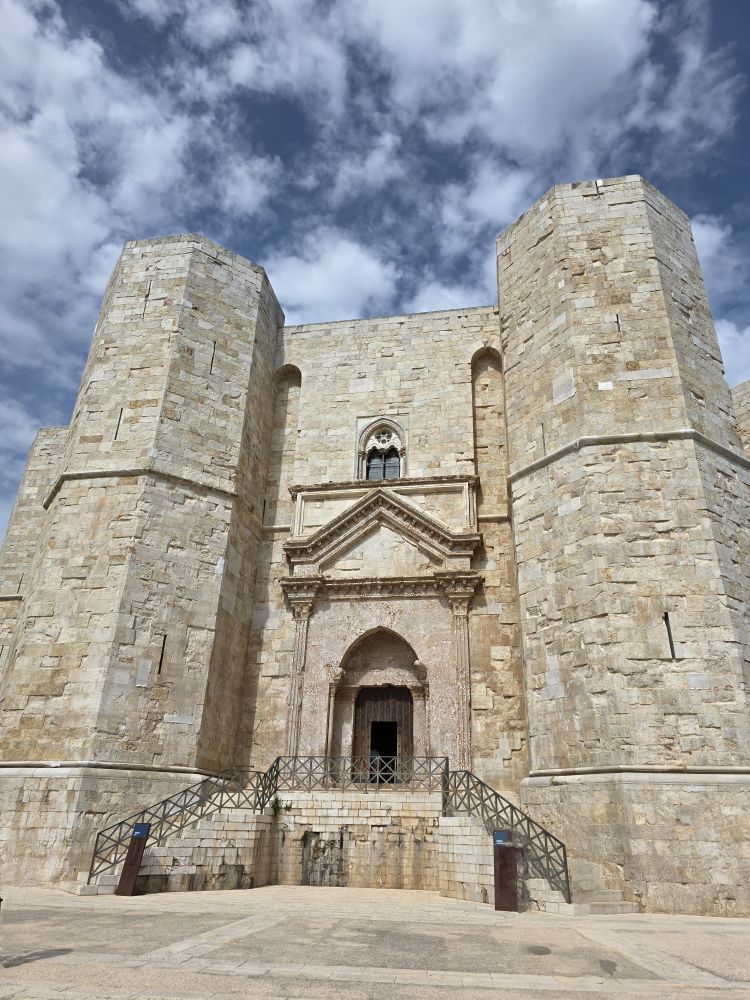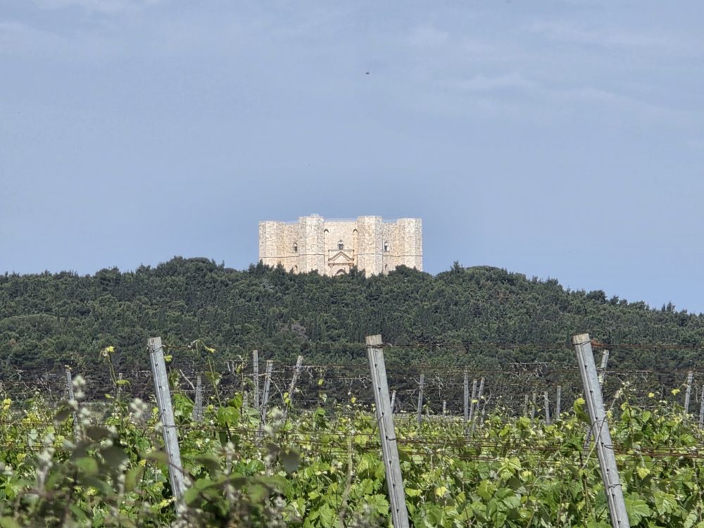 Our 2nd land/sea day will be filled with wanderings through the Alta Murgia national park, a massive park that covers over 168,000 acres across the hills, forests and farmland here. After a rather leisurely morning – we slept in a bit because of a stupid bird that sounds just like an alarm chirping at 3am – we strike out on the narrow lanes from the house toward our first destination: Castel del Monte, or Castle on the Mont. A relatively easy drive on empty roads, through farmland full of freshly harvested hay, passing these wild looking beehive shaped huts we think might be for olive harvesting, we arrive at the lower parking lot for the castle (following AllTrails directions) to find we are the first car there. Nice! TIE (Timing is Everything).