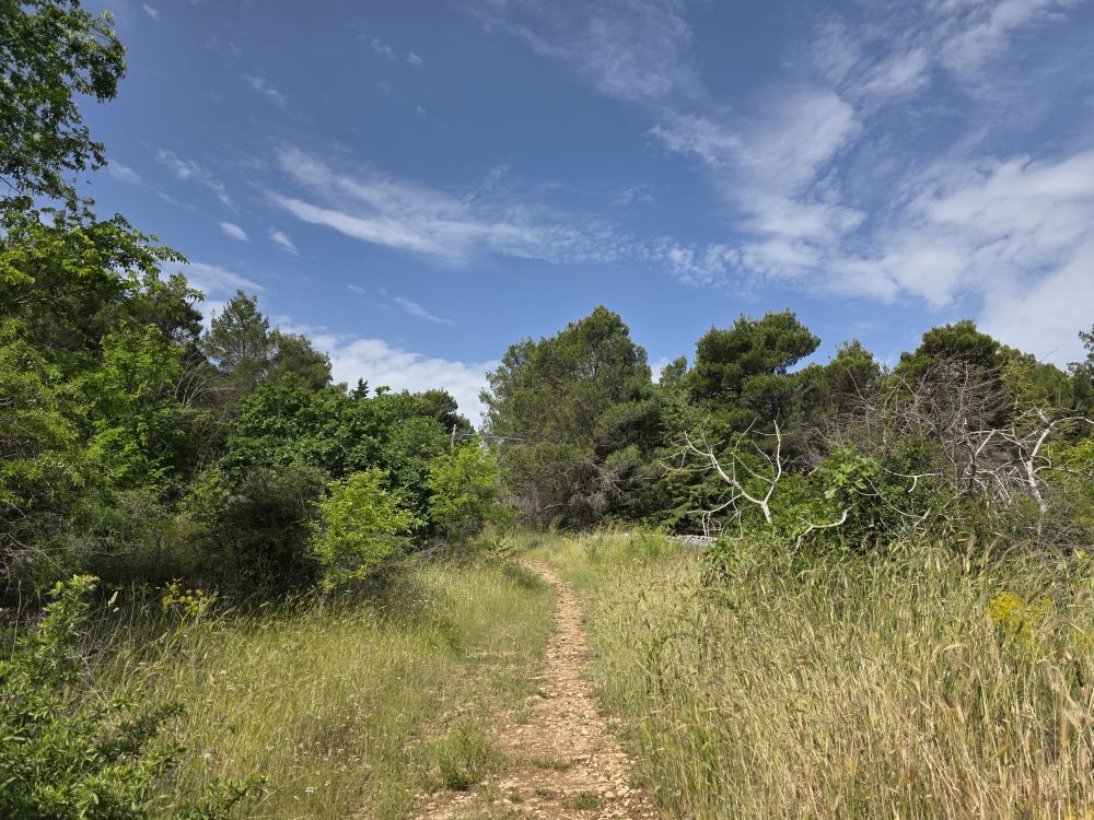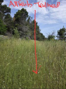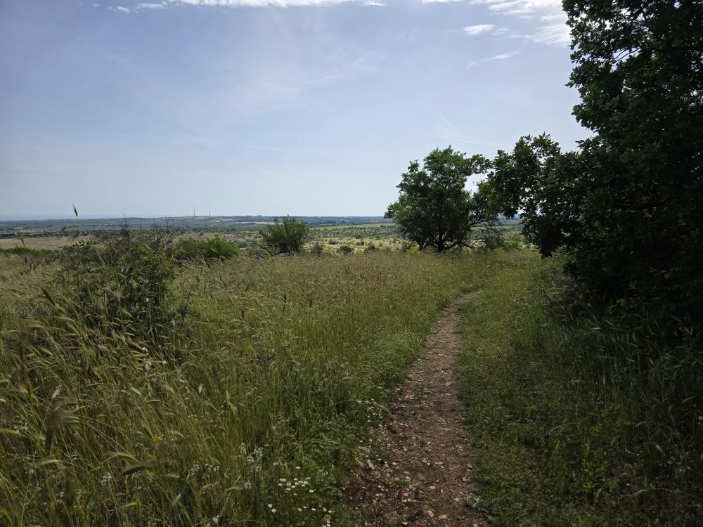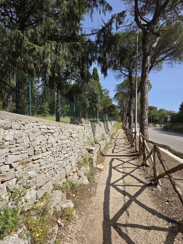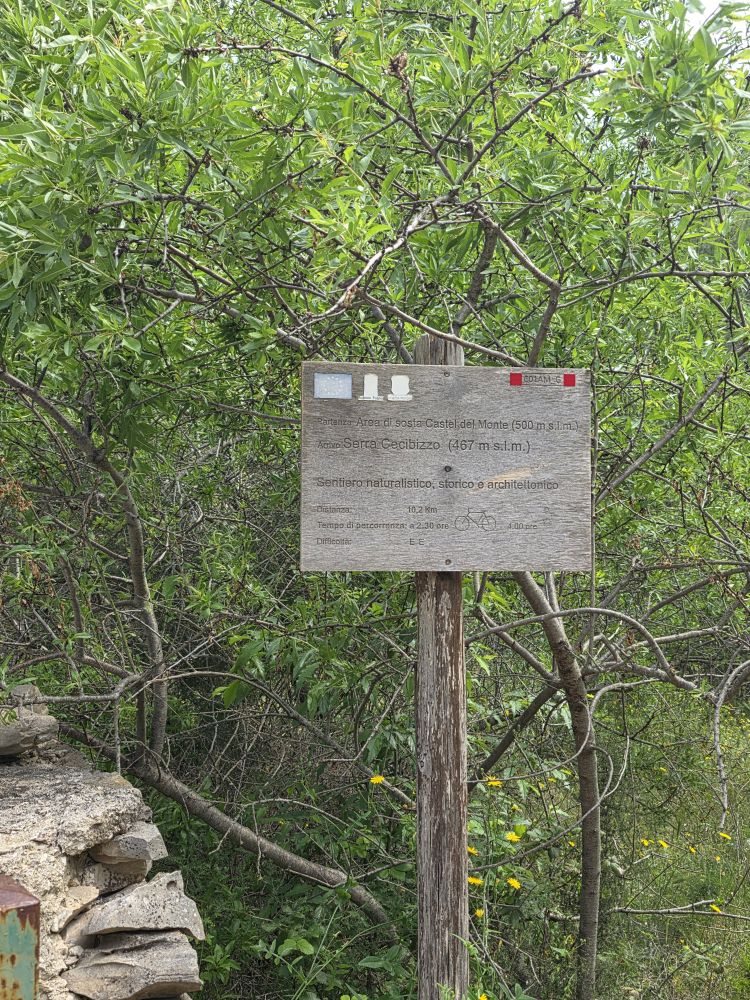 Parking paid, we begin our AllTrails Castel del Monte loop hike up the dirt paths that line the road until we reach the trailhead. Figuring we’ll do the hike first, then visit the castle, we follow what looks like the trail but turns out to be another trail which is part of a much longer biking/hiking that takes us away from the castle and down toward Corato and the sea. Hmmm….backtracking while following the AllTrails map, we arrive at the trail turn off shown on their map. Nope. Not happening! That trail totally overgrown and inaccessible, if it even is a trail. It looks like it follows a stone wall through the weeds, but we aren’t going to find out, no way in shorts. No way in long pants really – who knows what is living in those weeds and plants! Fail.