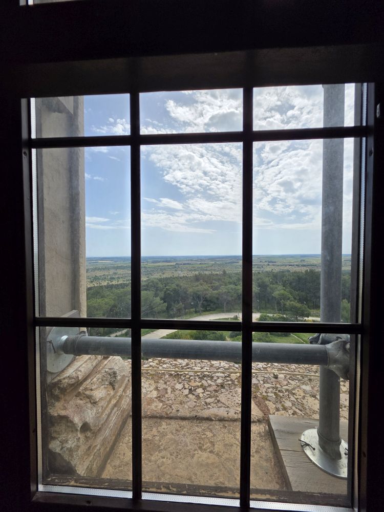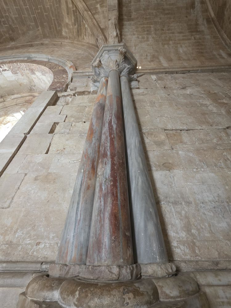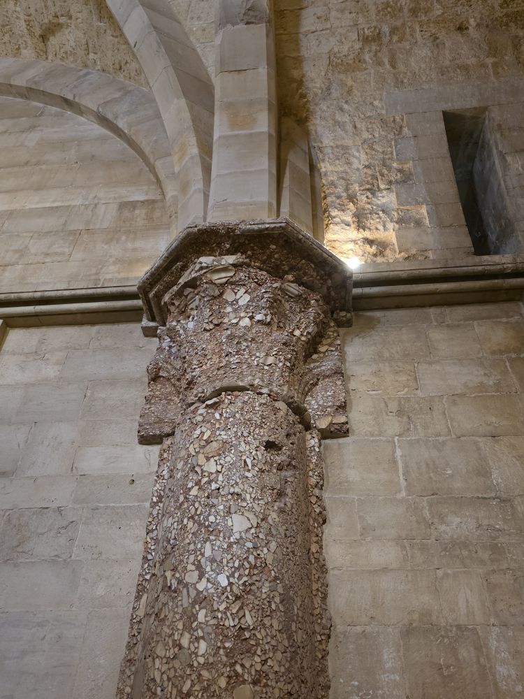Next we visit the upper level which is brighter due to all the windows that look out across the countryside as well as down into the courtyard. Here there are more stunning views, as well as multiple fireplaces (or at least the carvings where the fireplaces once stood, and information on the “spoilation” of the castle (love the translations!). It is here we learn that many marble columns were taken from this castle to decorate the Royal Palace of Caserta, which we will be visiting in a few days. So the royals looted each other – even when they were on the same side? Who knew?