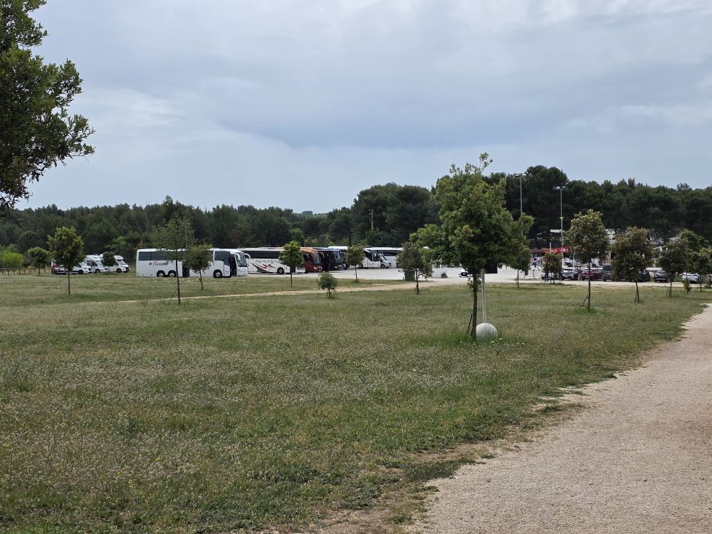 We are still interested in hiking down the hill, but once again, the trail that is listed in AllTrails looks a little overgrown and sketchy to us so we demur, reversing our walk through the fairy tale woods, then down the road to the parking lot…..which is now jam packed with 30+ buses and about 40 cars! Wow! We timed this whole visit absolutely right.
