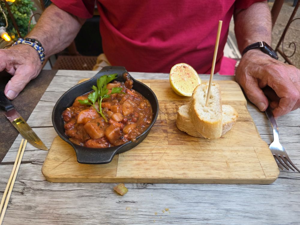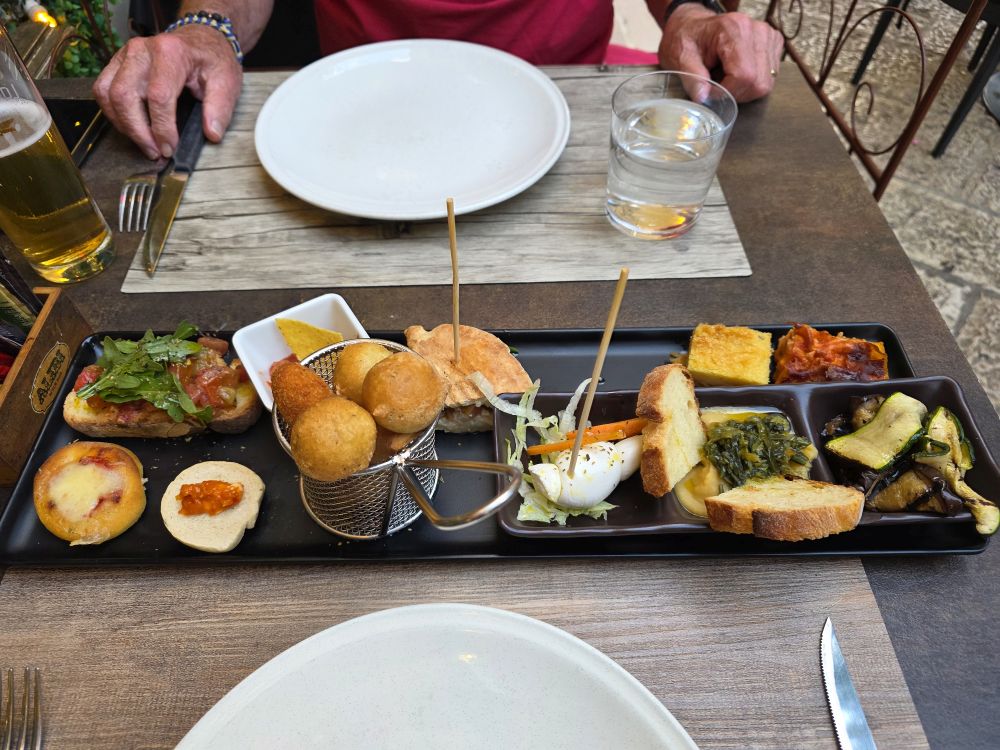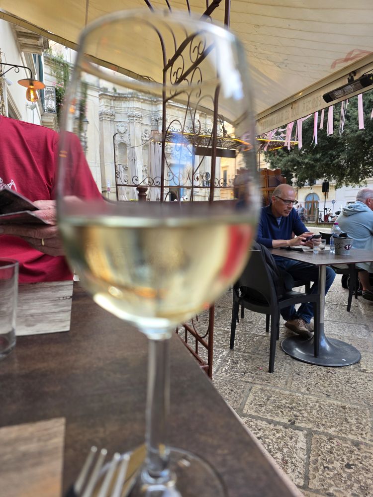 Tonight we are dining at Alibi, another restaurant on the Piazetta that Luigia suggests. It is a cute, quirky place – packed. We made a booking so we get a great table in a little trellis seat. Cute. As always we order way too much food – but we can’t resist he Apertivio Salentino with all the typical Salento dishes – puccia (the local sandwich), bruschetta, friselle, mini pizza, pittule. Tons of food, but oh so good. For our mains I fortunately have a small dish of tonno rosso (excellent seared tuna), while Ed goes with the Polpo Alla Pignata – octopus with tomatoes. Excellent meal – even if we are stuffed at the end!