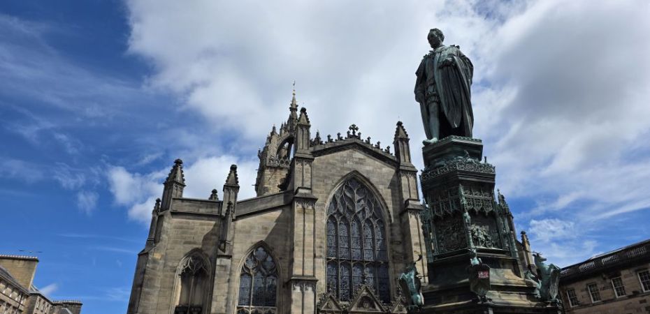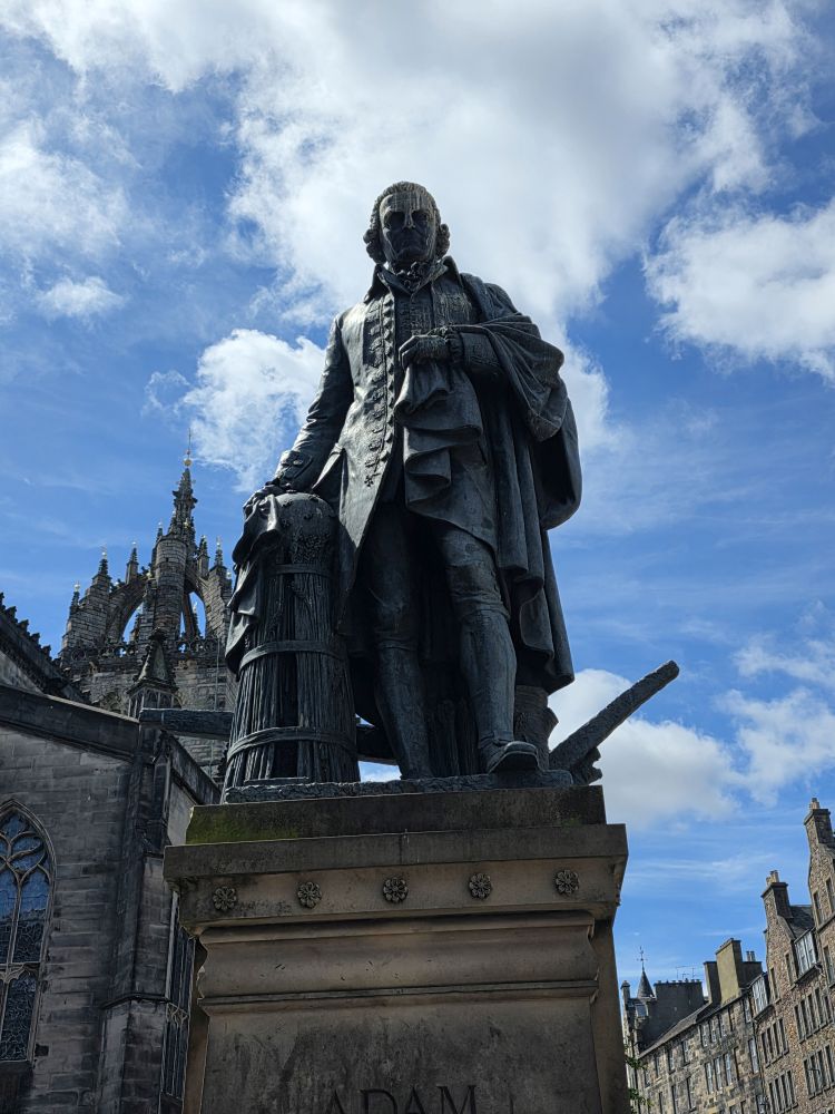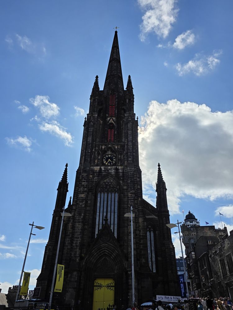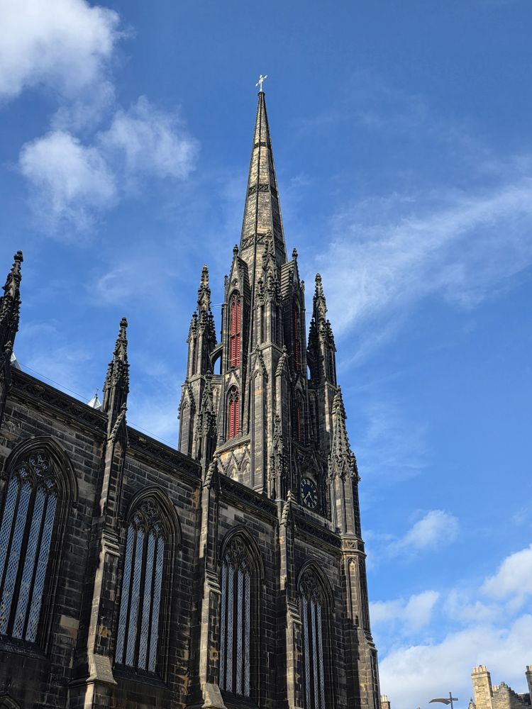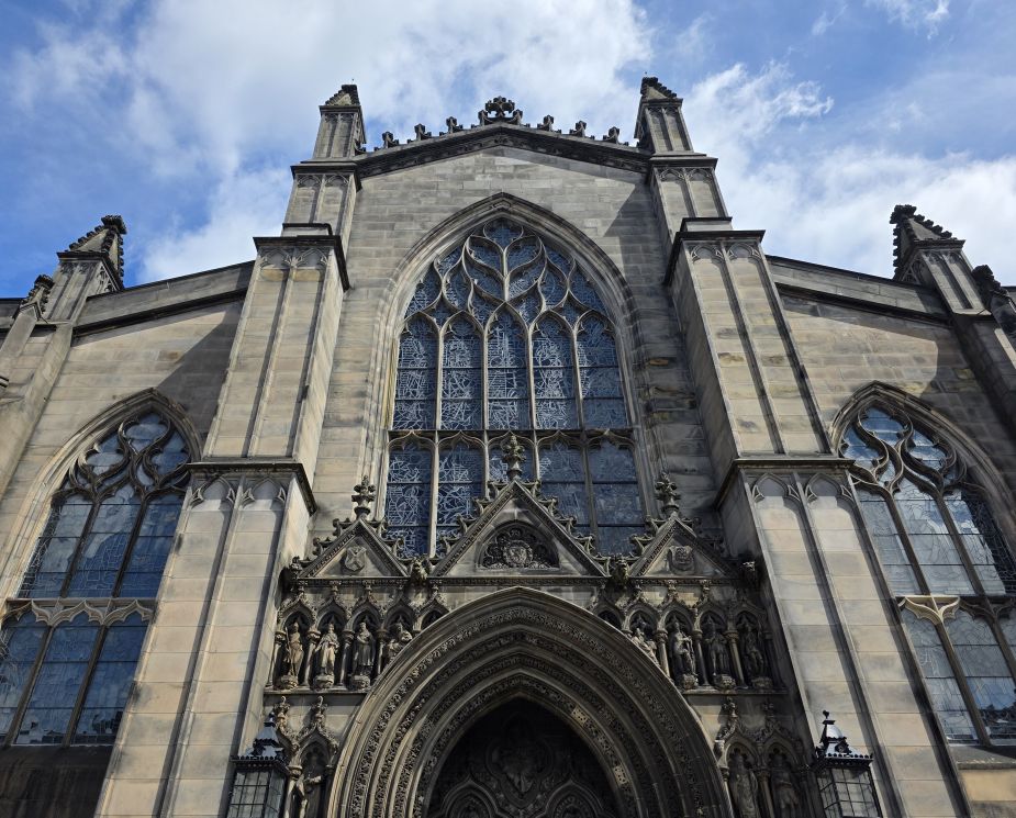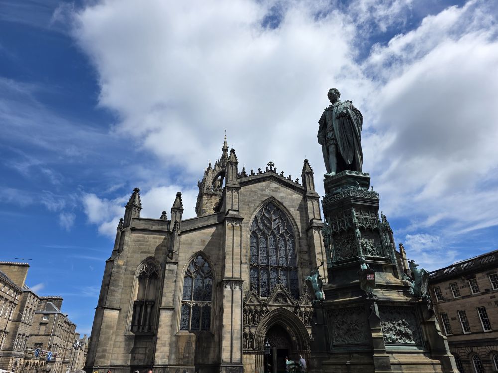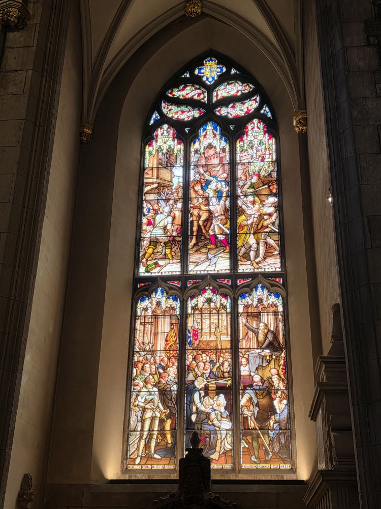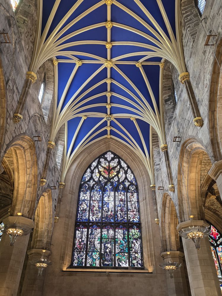 Reversing up the Royal Mile, we make a stop at St. Giles Cathedral, one of Scotland’s most important medieval church buildings, begun in the 14th Century. It is as magnificent as one would expect, with soaring arched transepts and gorgeous stained-glass windows.