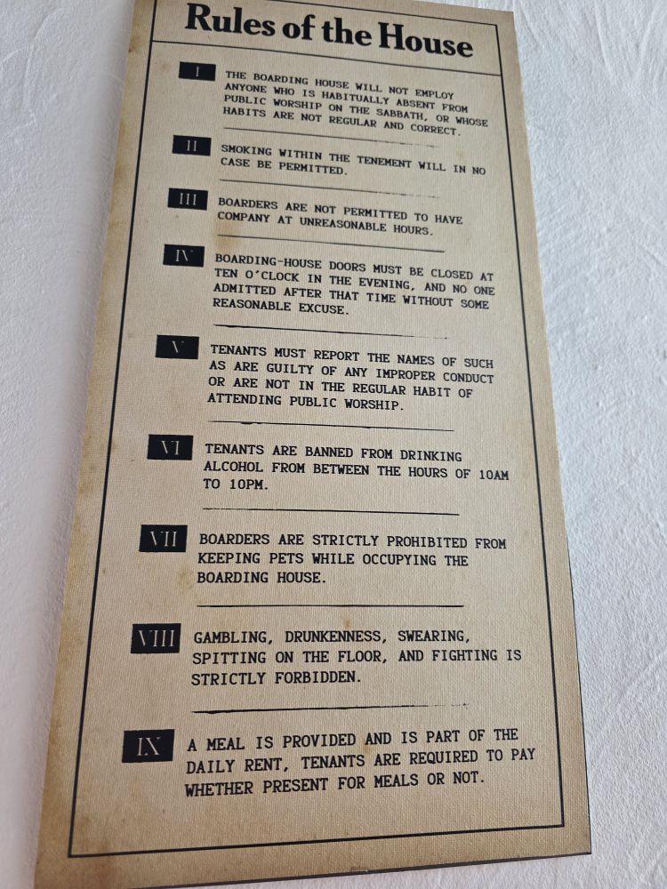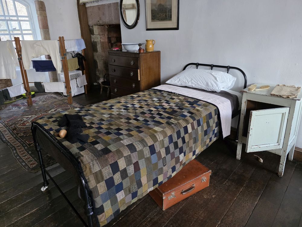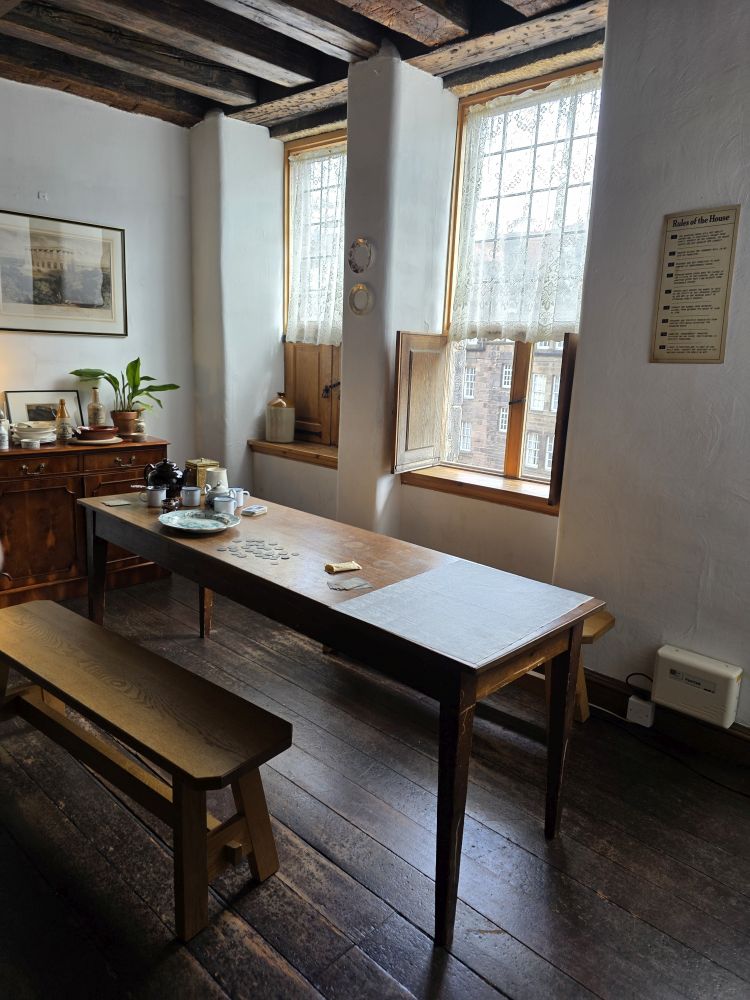 After the wealthy decamped to New Town, Gladstone’s Land declined over the years, becoming a boarding house in 1911 – which is the period of furnishings and info we find here on the 3rd floor. There are house rules posted on the wall (no alcohol between 10a and 10p, one must not be habitually absent from public worship on the sabbath, no company at unreasonable hours, etc.) and the rooms have been divided into 2 smaller areas to accommodate 2 people.
