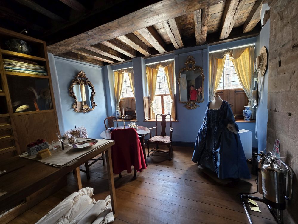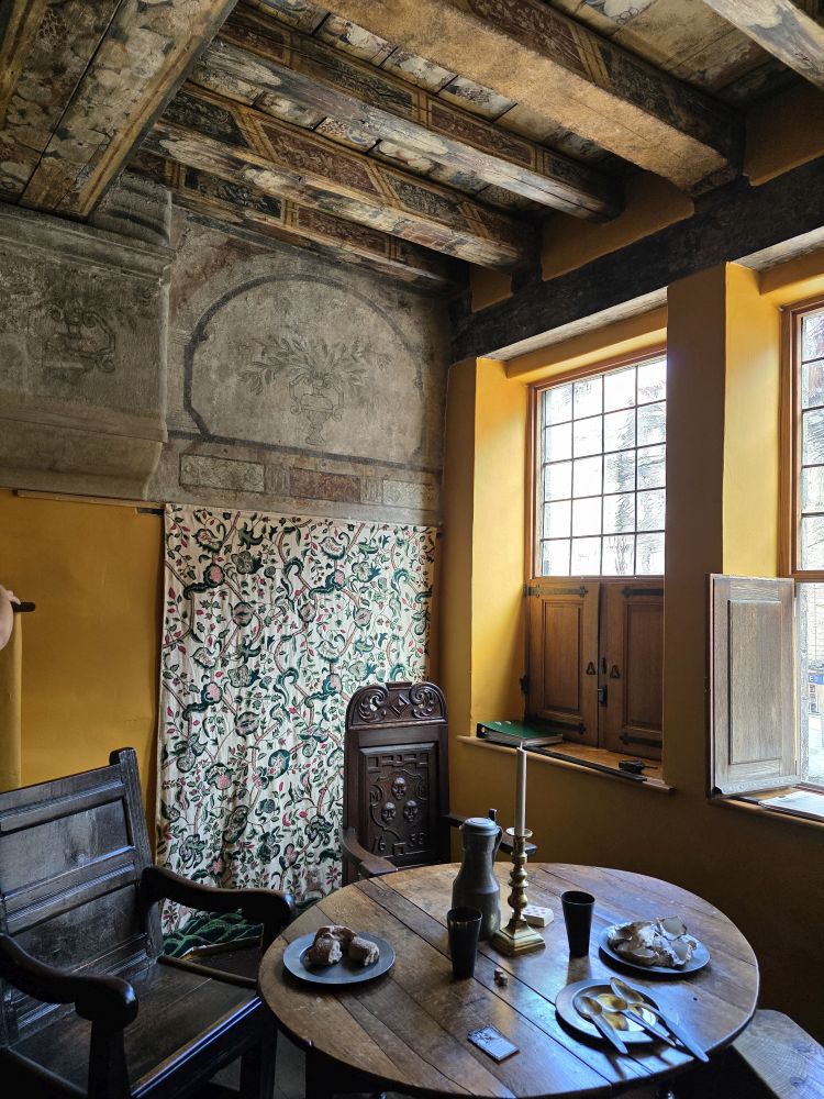 The building was purchased in 1617 by Thomas Gladstone and his wife Bessie, who set about creating a rental home for the wealthiest tenants. The top floor of the home held one apartment – which is outfitted in typical 1700’s furniture with adorable little features like the wooden mouse under the bedside table – but the main attraction are the painted ceilings. Truly amazing artwork created in 1620 that depict fruit which didn’t typically grow here – pomegranates, oranges, grapes – birds and flowers; these painted ceilings were considered the ultimate status symbol of the wealthy. Footnote: It is absolutely amazing they still exist and were not painted over or covered with plaster during all these years – and are the original ceilings, not repainted.
