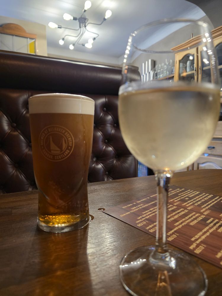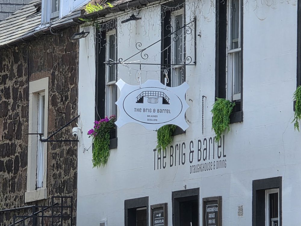 Unfortunately, our timing won’t allow us to take a tour, but we do get to visit the great bottle shop and merch store where we succumb to a cool t-shirt for Ed (in the best of Belhaven Football Club style) and a cute little bottle opener, just because. We wanted to buy some beer but didn’t want to haul it around with us all day long. After a nice long chat with the guy manning the shop, we walk back up to the main road to wait for The Brig & Barrel to open, our choice of lunch spot.