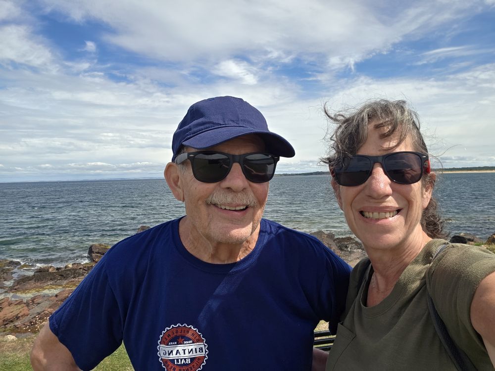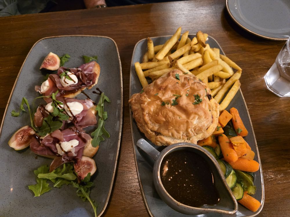 The Brig & Barrel is a cute local pub, that fills up quickly, making us glad we were here right at opening. We don’t know hold old the building is, but the current owners bought it and renovated in 2018, which apparently was quite the job because it took them almost a year to open – they left a space open in the paneling to show the stenciling they found on the wall under 5 layers of wallpaper! Eek. You can see the original “Belhaven Bill” with his winning beer trophy. The menu is as cute as Belhaven Bill, with items like Pig and Goat crostini – how can we resist that? Essentially prosciutto, goat cheese and fig jam, it makes a great starter with our wine and – yes of course – Belhaven beer. We split a Steak and Belhaven Best pie, which was excellent and just the right amount of food to fortify us for our upcoming cliff walk.