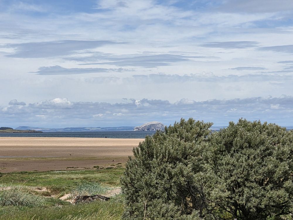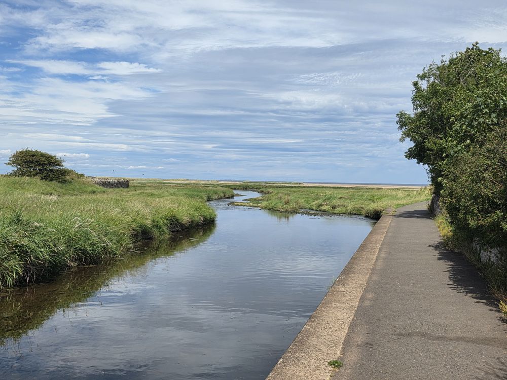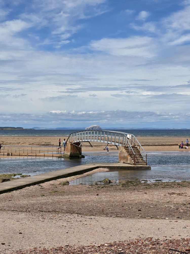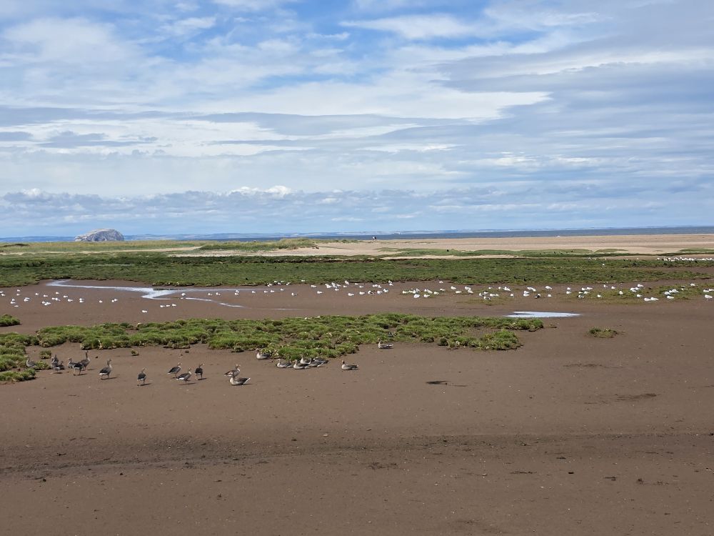 Out into the now sunshine, we walk over to Belhaven Bay, walking the trail toward Biel Water and Seafield Pond, with the saltmarsh and mudflats on one side, the pond on the other (which at one time was the pits – used for clay extraction and brickworks before being made over into the Seafield Pond we see today) and tons of birds everywhere you look. There is also a great long view of the Bridge to Nowhere at low tide (at high tide it looks like the bridge has been built in the middle of the sea).