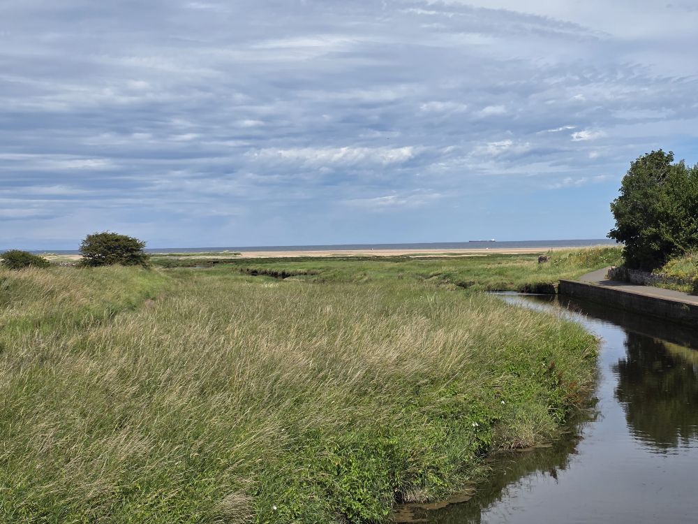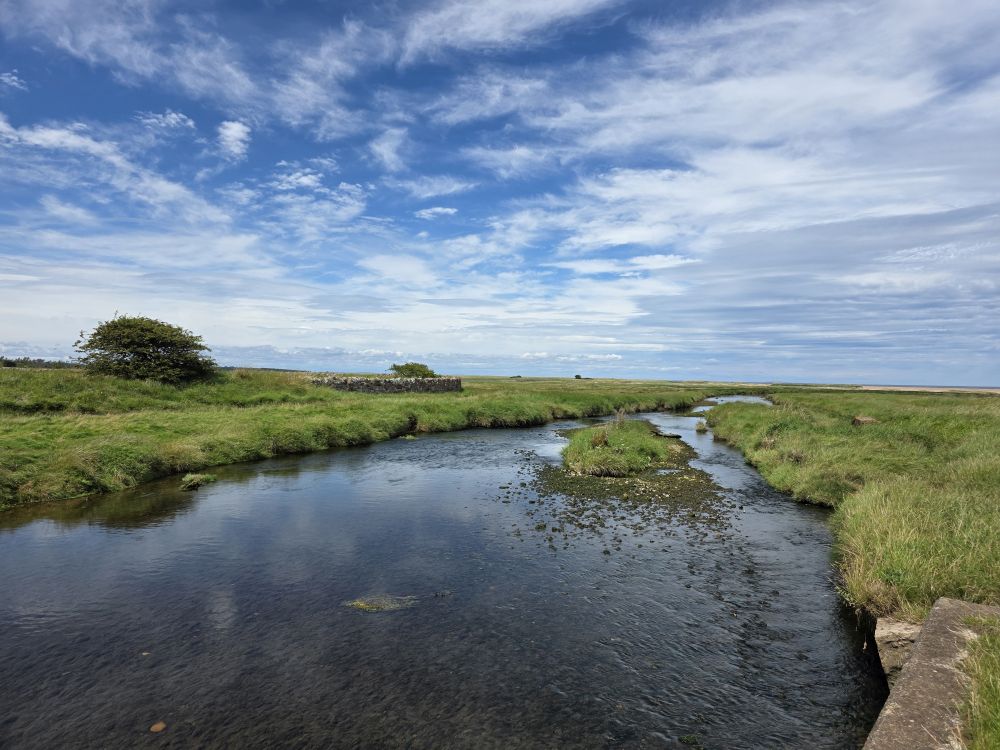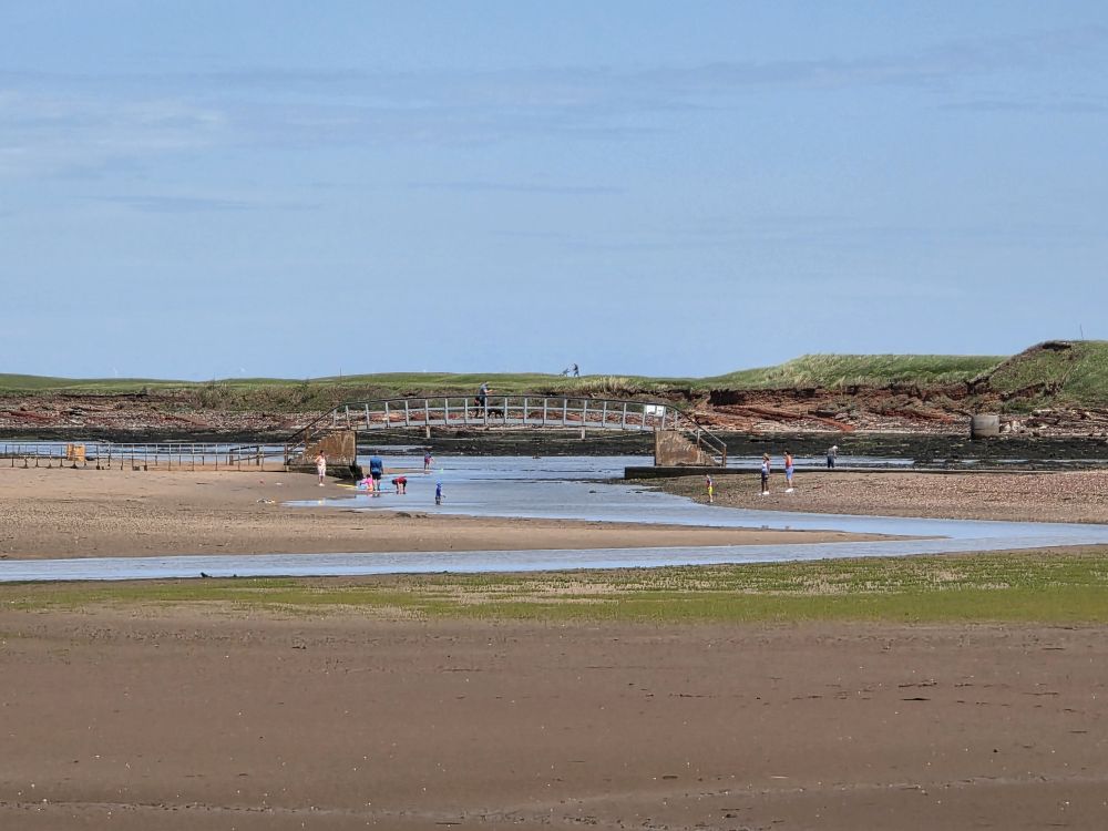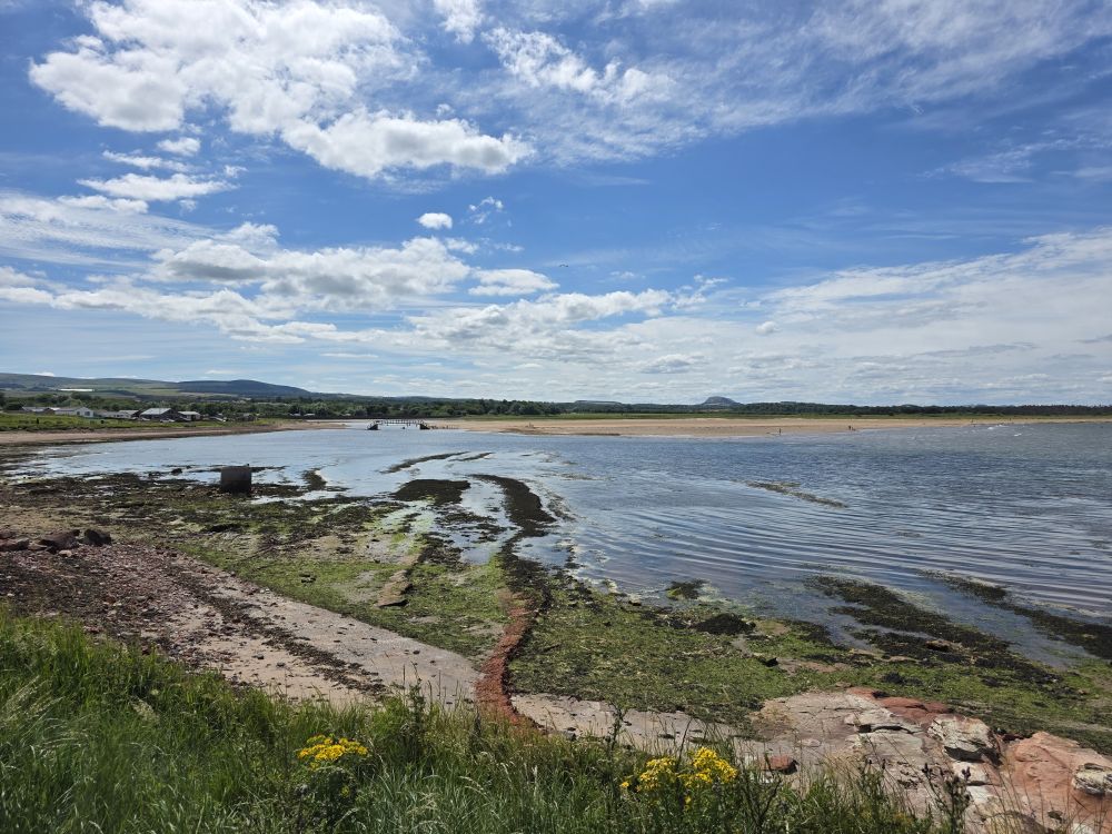 Making it out to the Biel Water bridge, we hang out there – letting the landscaping guy pass us on his lawn mower – enjoying the gorgeous views down the river that flows from the lower slopes of the hills behind us, feeding fresh water into the sea creating the brackish estuary where the mudflats form.