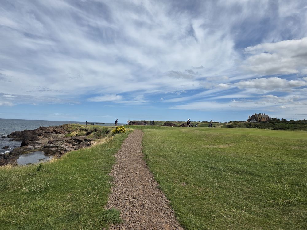 Circling around the bay, we get a closer look at the Bridge to Nowhere, wishing we could be here at high tide, then move on around the coast, past the Winterfield Golf Course – where you seriously have to keep your head up to watch for stray golf balls heading your way (as one actually did further along on our walk!).