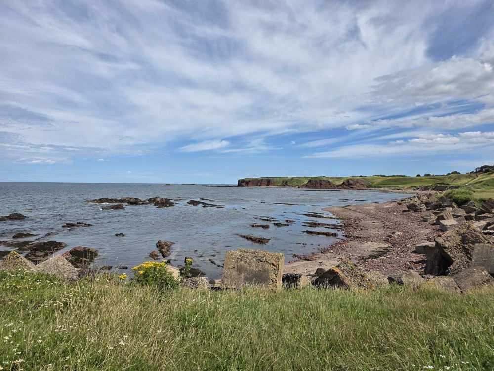 Closing in the ruins of the Dunbar Castle, we carefully pick our way around the eroded trail over top the Dunbar beach access, overlooking quite a few people enjoying the sun and the water. And also the couple that has managed to swim out to and climb up on Doo’s Rock! Crazy kids! Looks pretty treacherous to us, but they seem to be thoroughly enjoying themselves sunning on the top of the rock.