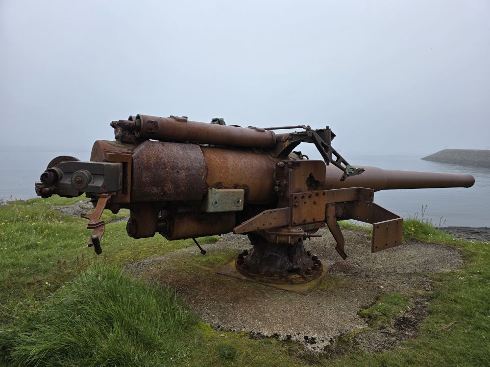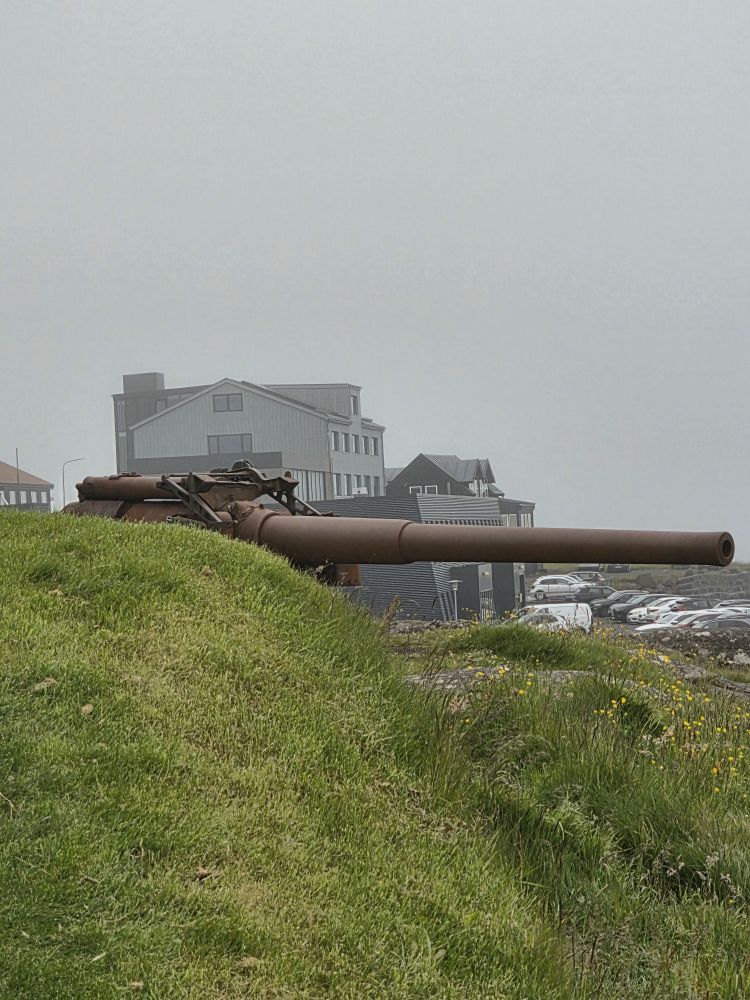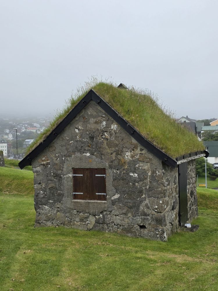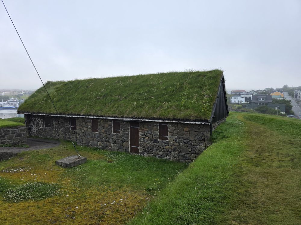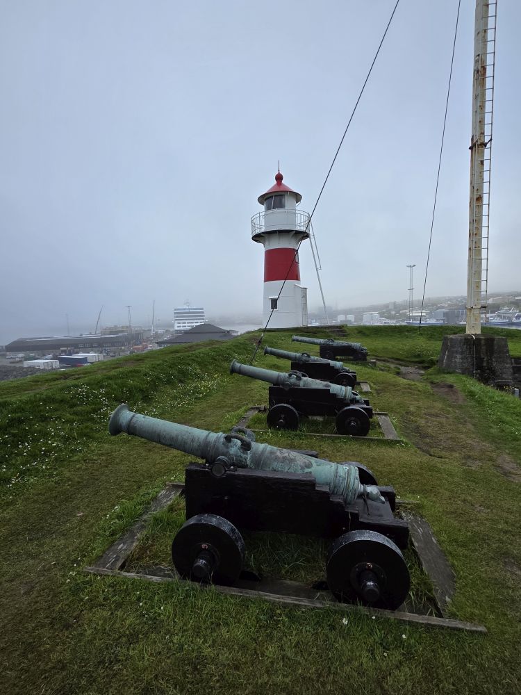 Our first stop is the Fort of Torshavn, right outside the harbor. Perched up on a knoll for easy lookouts, the fort was built in the 1630s to protect the Royal Trade Monopoly houses on Tinganes (the parliament peninsula where we will go next). Reconstructed in the 1780s, the fort still has 4 guns from the 17th and 18th centuries and 2 larges guns from WWII. The 335 to 40 soldiers that manned the fort became a police corps in 1865 when the fort was decommissioned. Now, it is a quiet and pretty place to walk around with the green grass, lighthouse, old guns, viewpoints and the sod roof houses – probably barracks – surrounded by dark black rock walls.