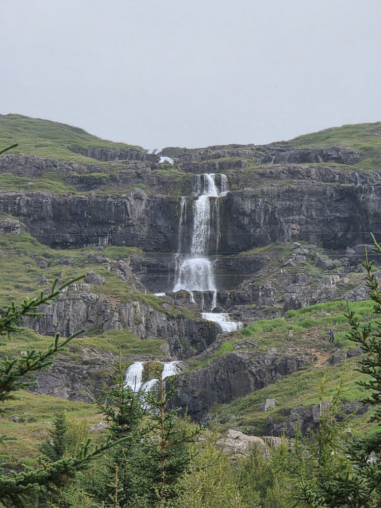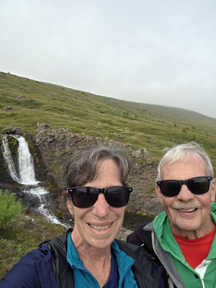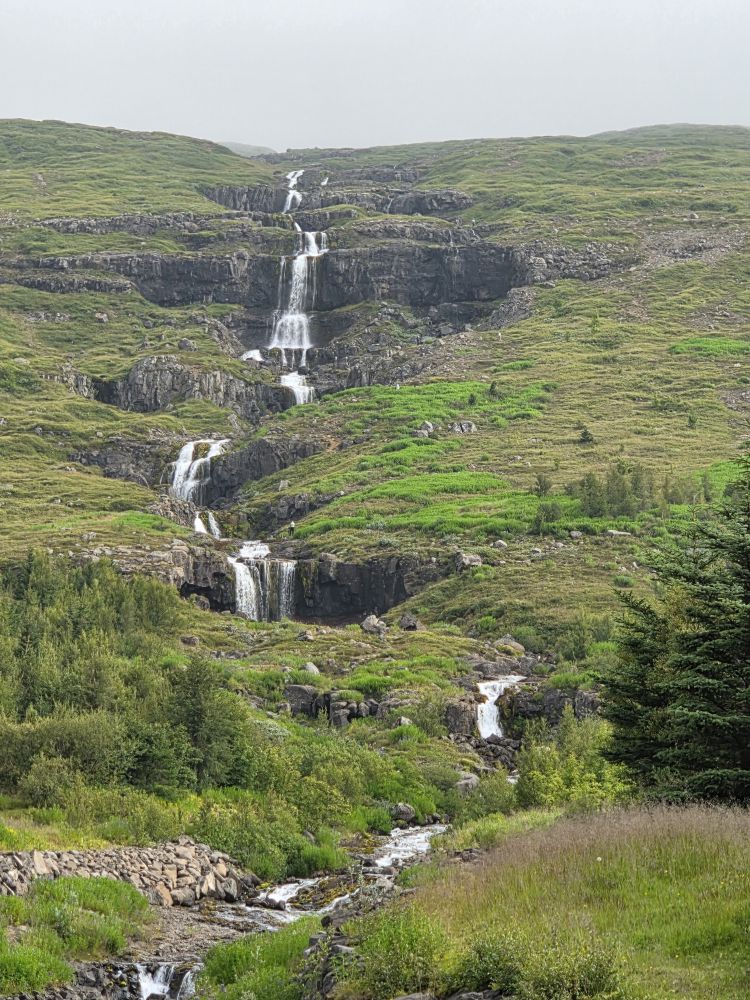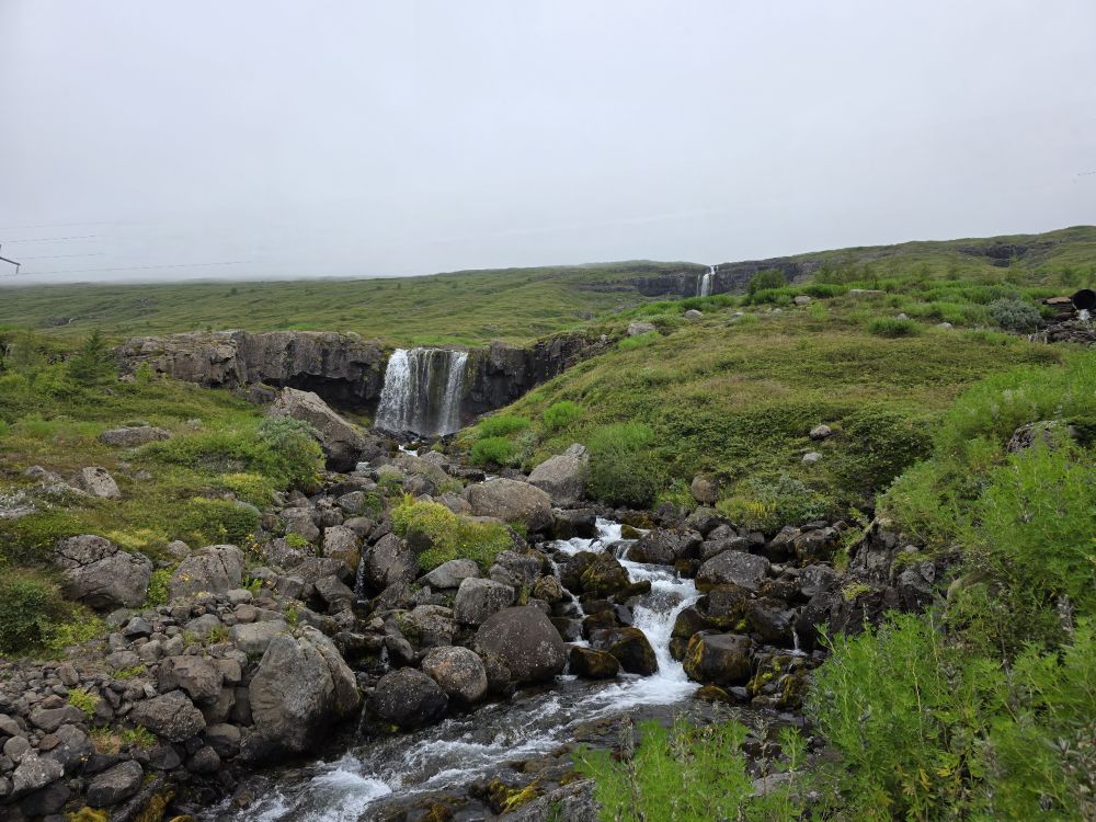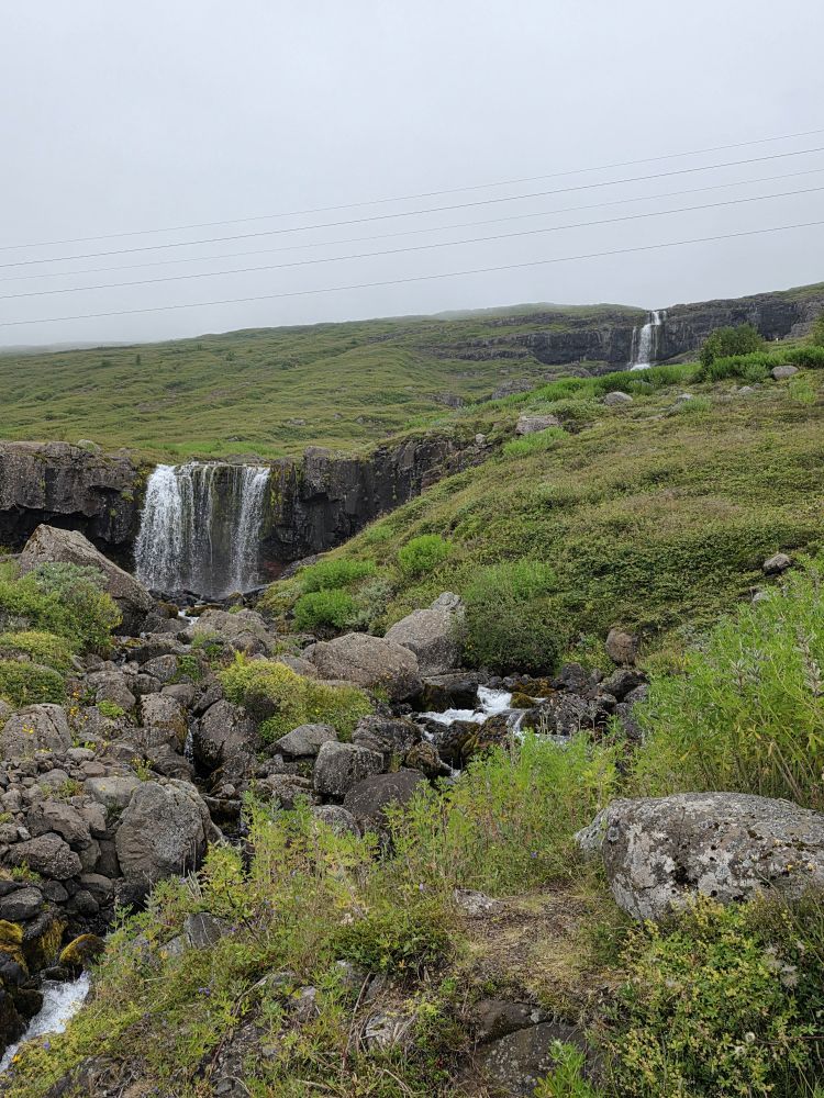 Armed with our Icelandic knowledge (which will help us how?) we intrepidly head out into the morning chill to go hike up to the Bleiksarfoss waterfall. We’d read a bunch of reviews of the trail – but we couldn’t figure out if the reviews were really for Bleiksarfoss or for this other waterfall, Bruarfoss, which is 90 miles away….thank you AI….NOT! – meaning we just did our own thing and navigated up toward the waterfall on our own – and with Google. Which also meant we had to bushwhack our way up a metal staircase completely overgrown with weeds and flowering bushes. Sort of fun actually!