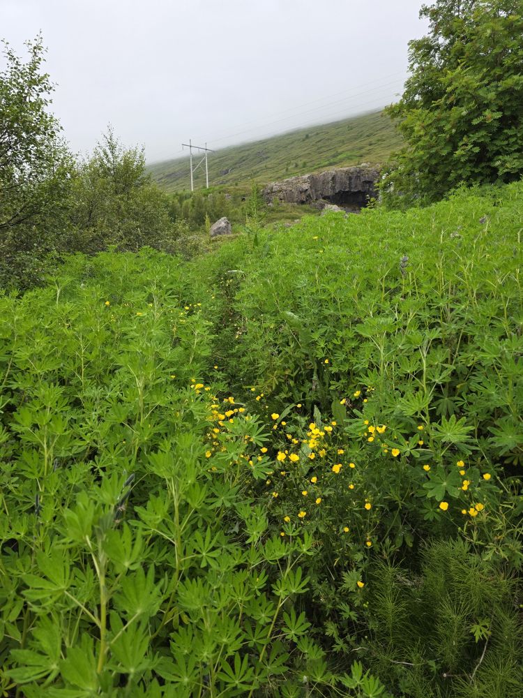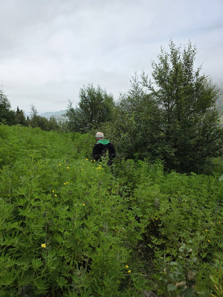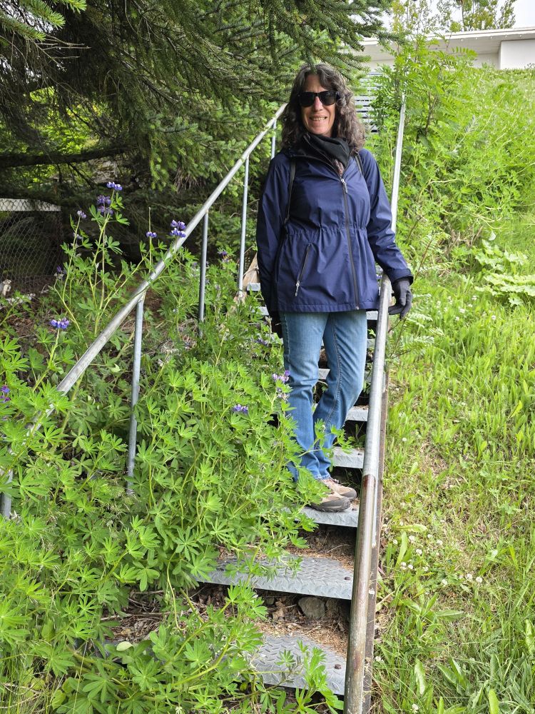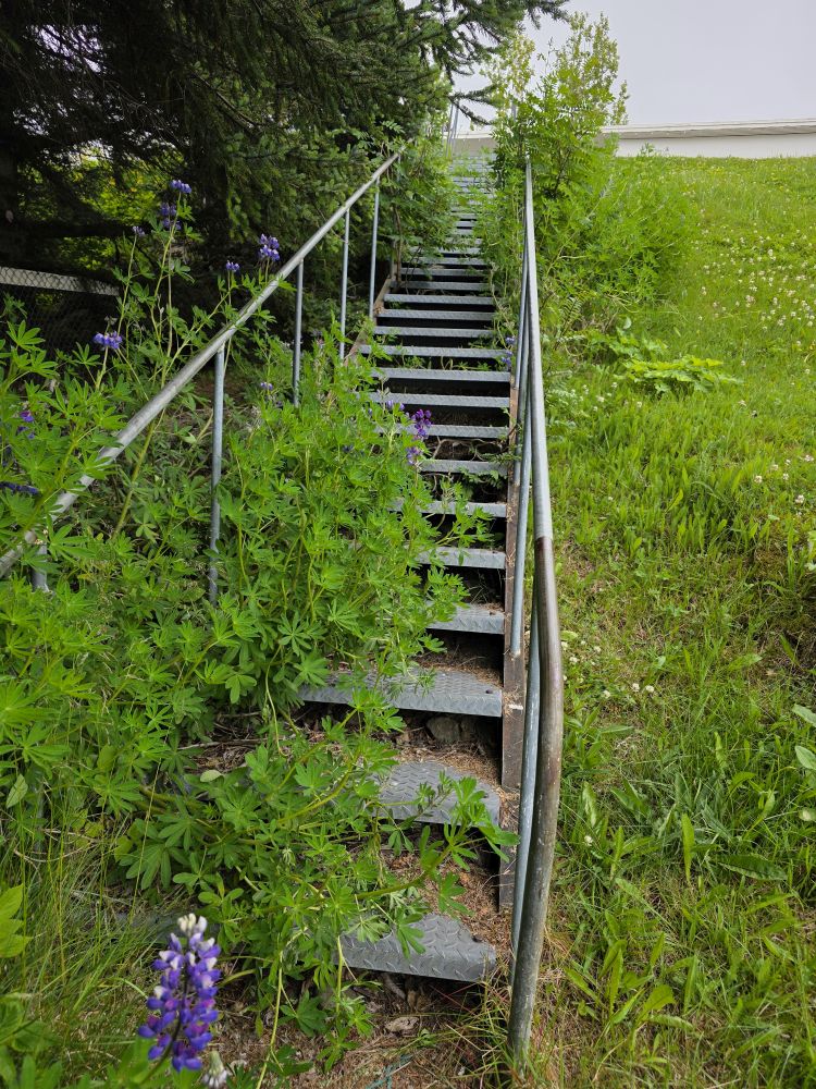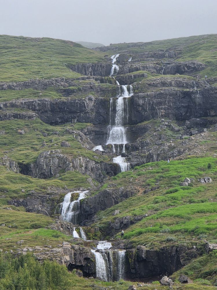 Armed with our Icelandic knowledge (which will help us how?) we intrepidly head out into the morning chill to go hike up to the Bleiksarfoss waterfall. We’d read a bunch of reviews of the trail – but we couldn’t figure out if the reviews were really for Bleiksarfoss or for this other waterfall, Bruarfoss, which is 90 miles away….thank you AI….NOT! – meaning we just did our own thing and navigated up toward the waterfall on our own – and with Google. Which also meant we had to bushwhack our way up a metal staircase completely overgrown with weeds and flowering bushes. Sort of fun actually!