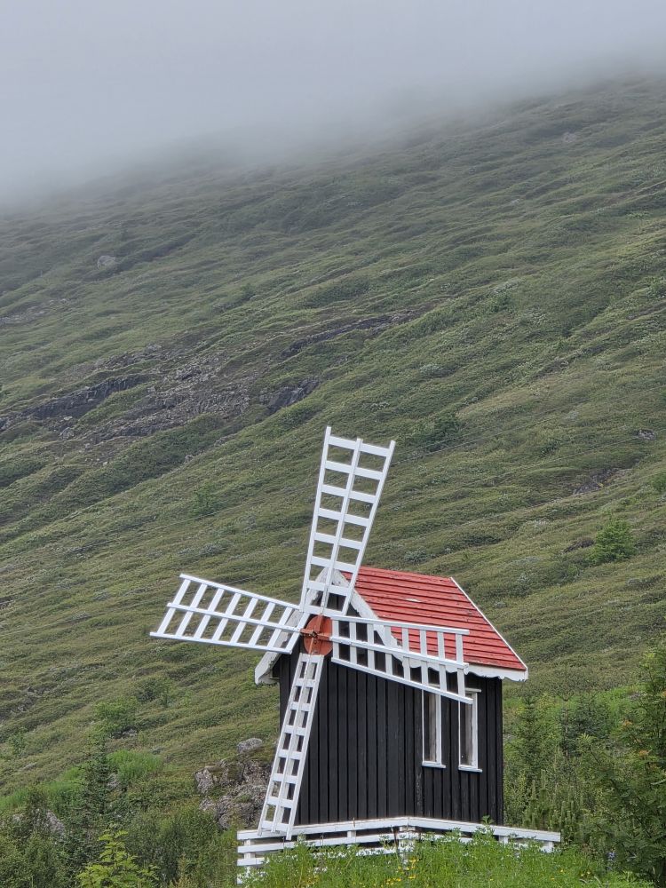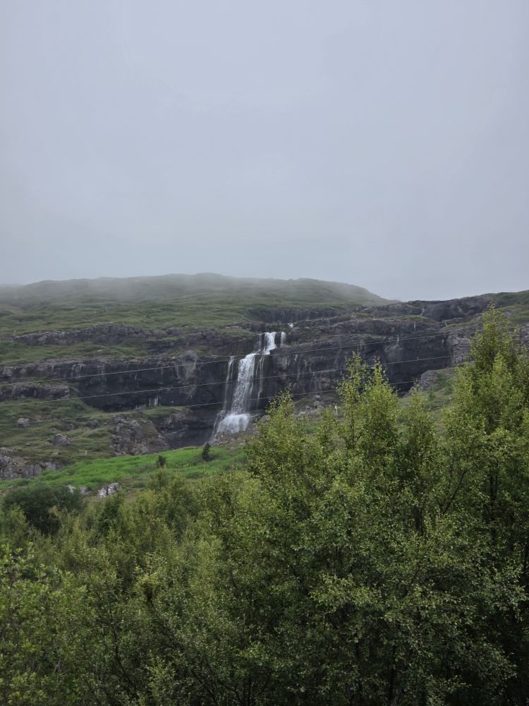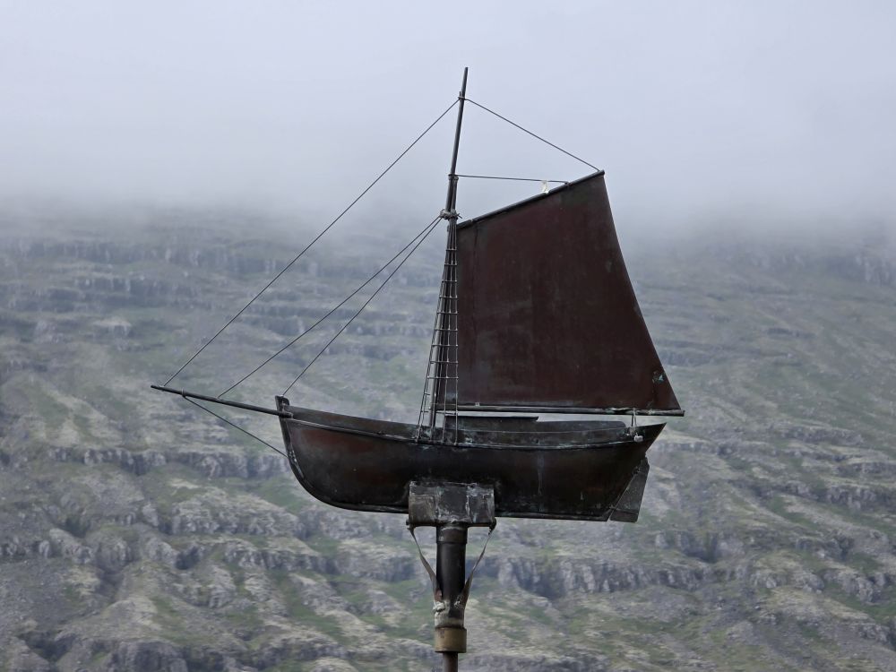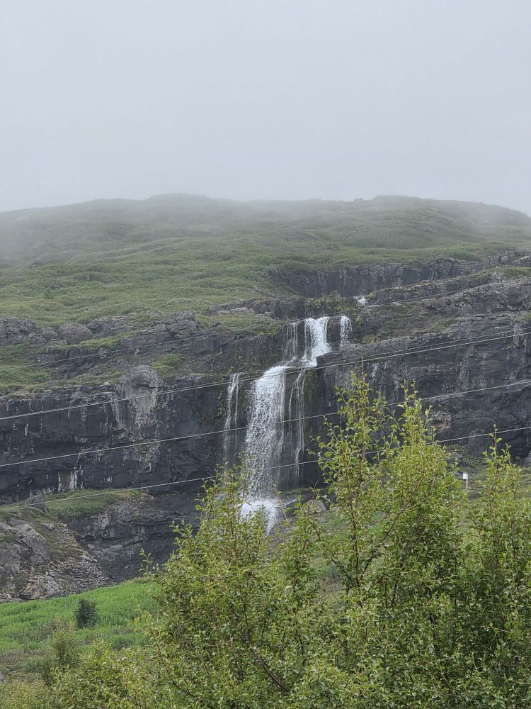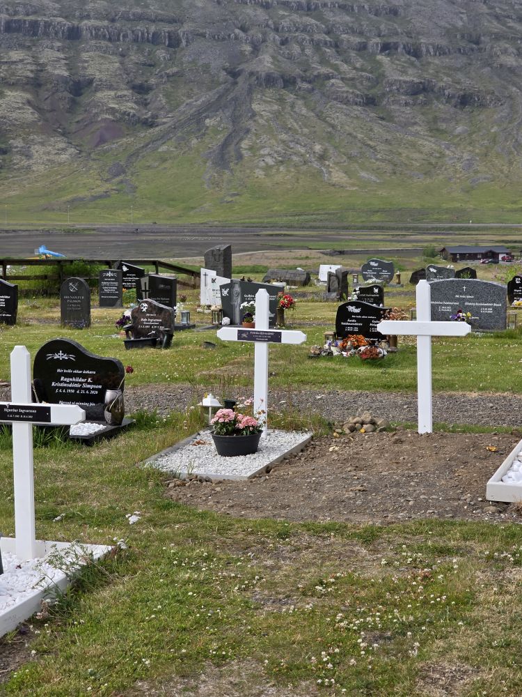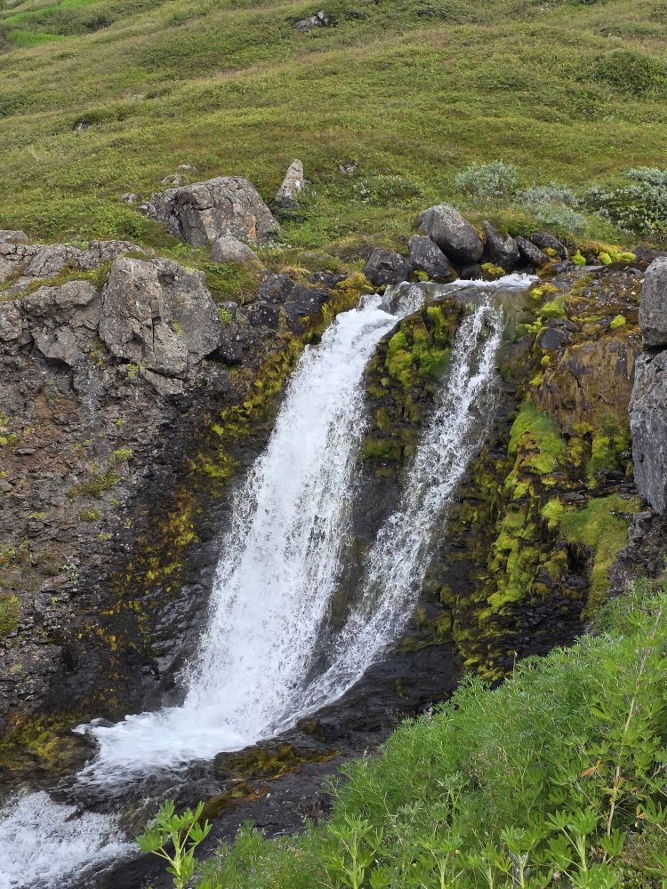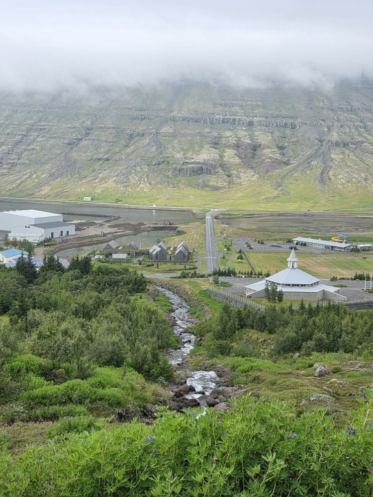 Back down at sea level, we walked over to the church at the bottom of the falls, climbing up on the Avalanche defense walls that have been built around the church where we could enjoy more stellar long views up to Bleiksarfoss. Ingenious really – two large rock walls in a V-shape to force any snow avalanche or landslides out and around the church, the community service building and the “new old people’s home” in the valley below the hillsides.