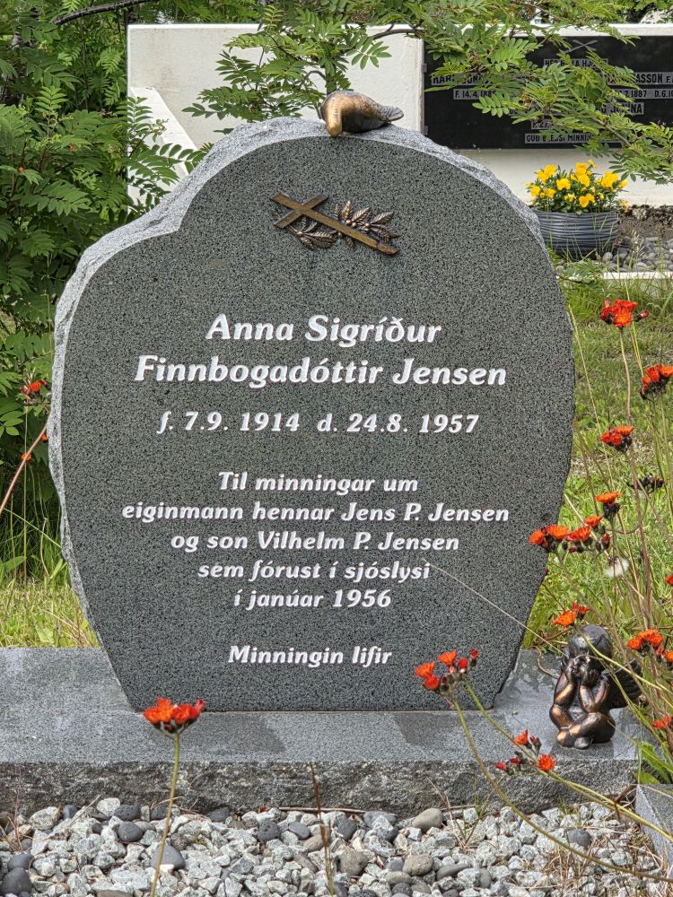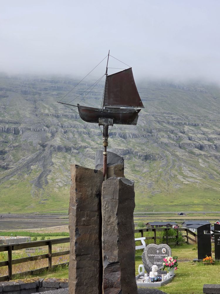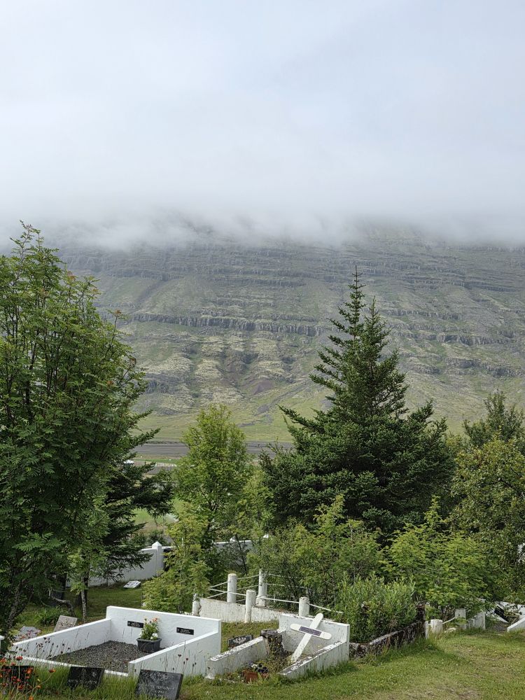 Our circle route takes us over to the cemetery, where allegedly there is another trail to get up to the waterfall, but we can’t find it. We think that information, AI driven of course, was also for the other waterfall miles away. Eh, no biggie, we’ve been there done that, so we explore the cemetery instead, with the seafarer’s monument and some beautiful granite headstones – one in particular in memory of the father and son who died in a boating accident, and the wife/mother who died 20 months later at the age of 43. We’re going with broken heart on this one. So sad.