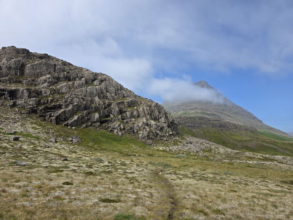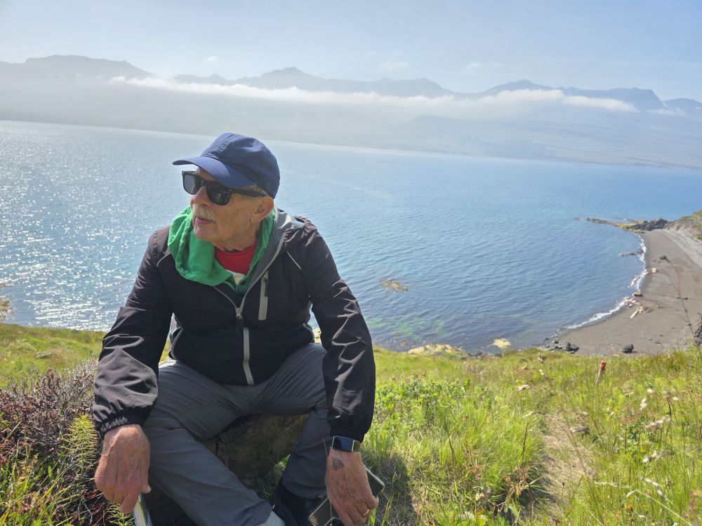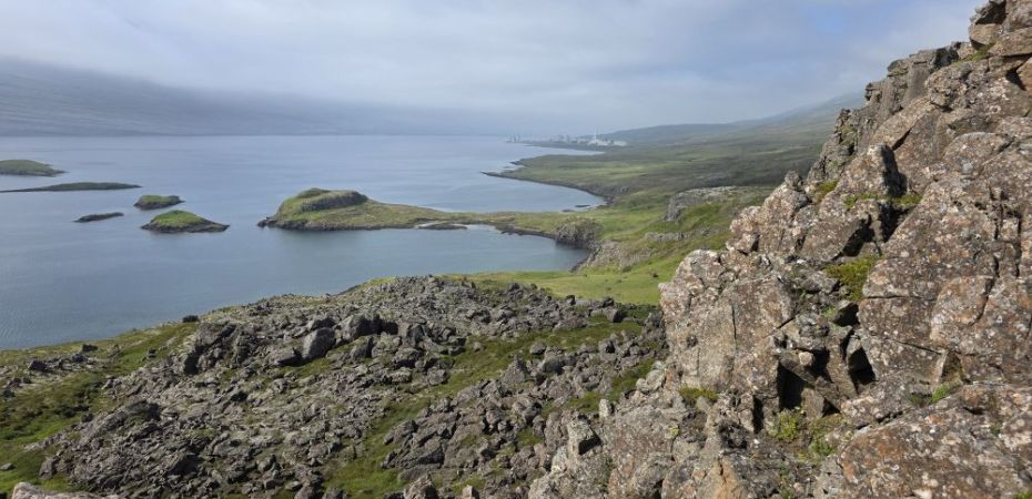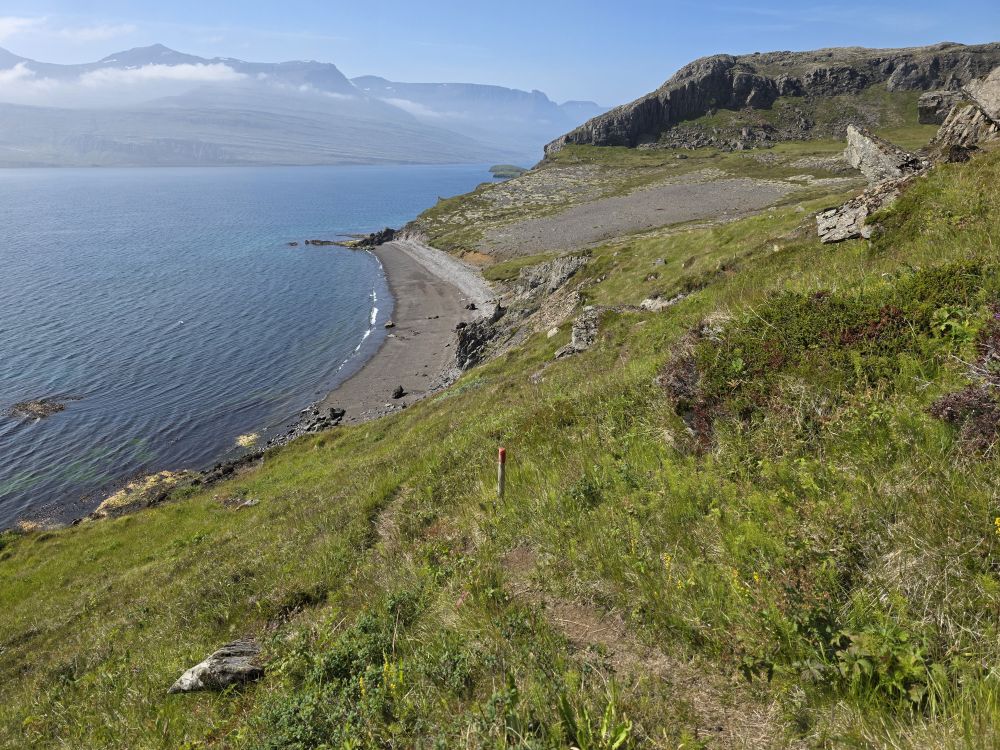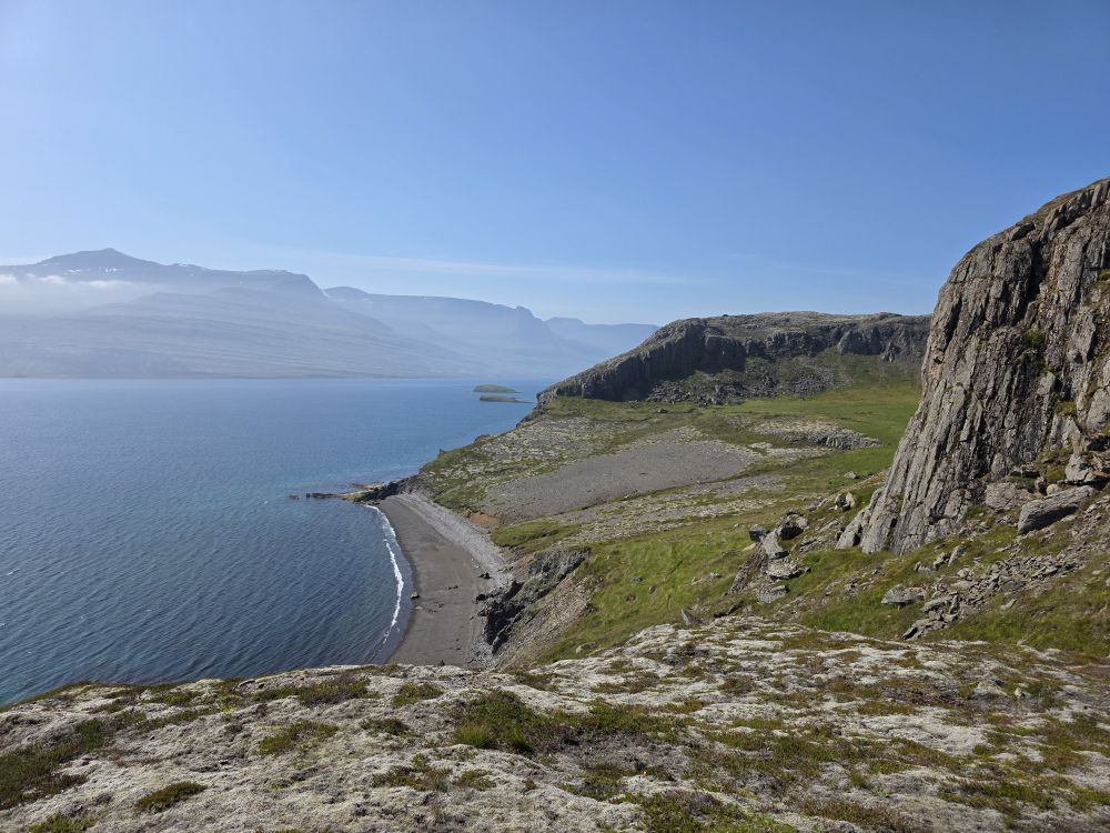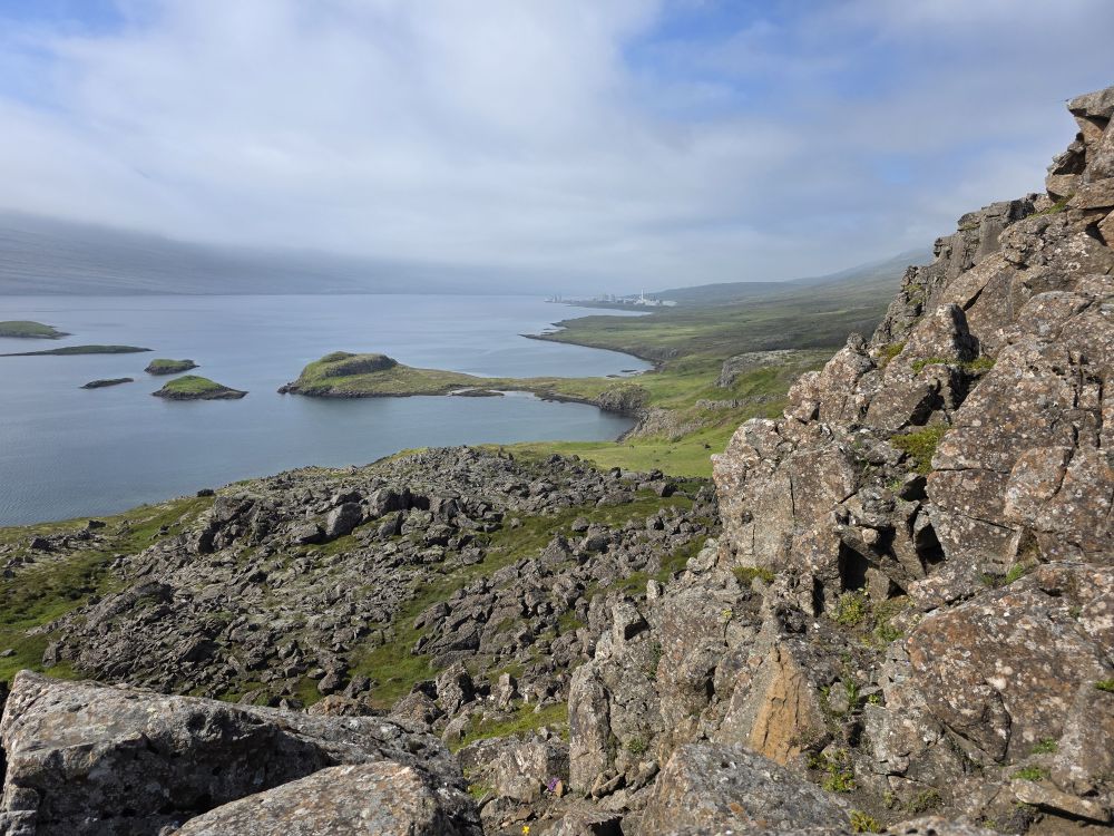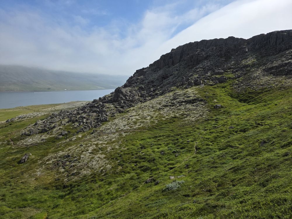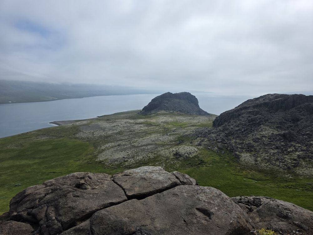 Rounding the corner behind the rocks, we are treated with a fabulous view of a branch of the Reyðarfjörður bay, one of the deepest fjords in country and over 30 km long. Here we take a break while Anna pulls out her totally awesome little portable water heater and makes us the best cup of coffee – made even better by the company and the view. Too much fun.