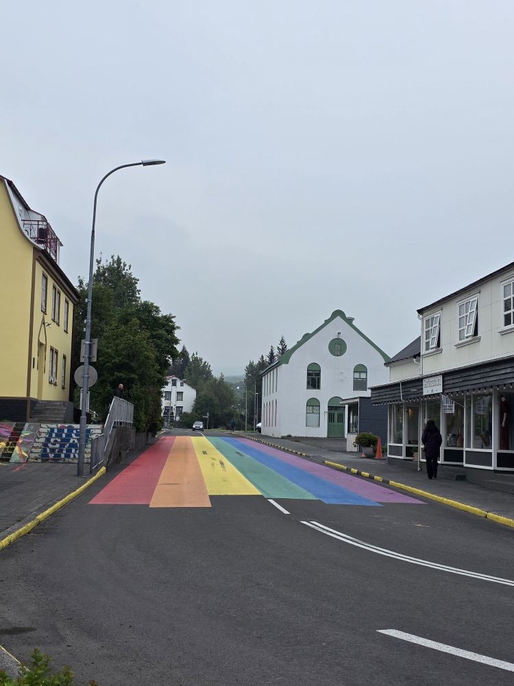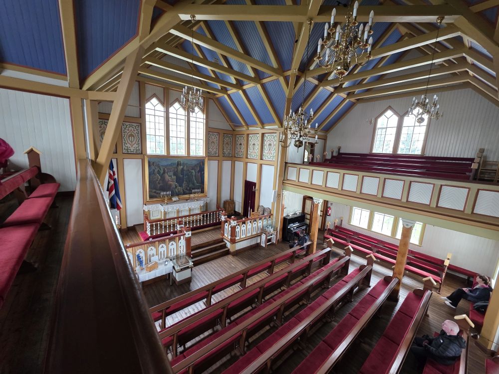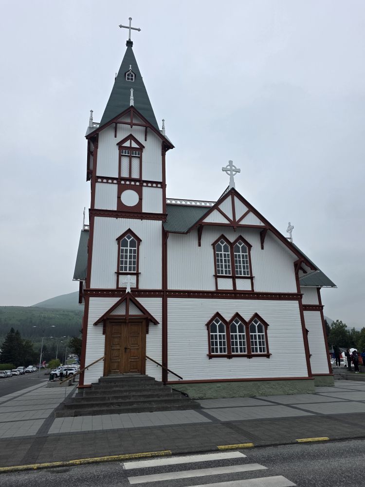 Done with Whale skeleton watching, we head over the Husavikurkirkja – the wooden church built in 1907 in the form of a cross with wood imported from Norway – which is pretty and simple with its contrasting blue ceiling and red velvet pews. Then to the rainbow street a few blocks away and that’s the extent of the town and our wanderings!