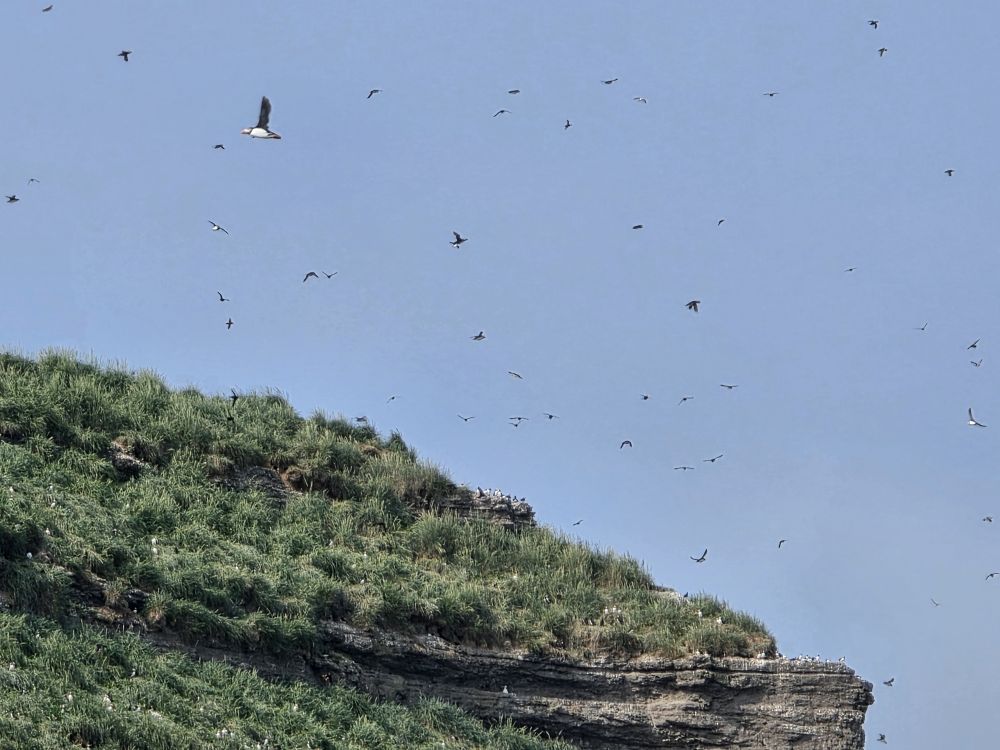 The tour is totally fabulous and wonderful, and freezing!!!! But in our gear it is nice and toasty warm as we make our way out to Puffin Island, one of the largest puffin rookeries in the world. These little guys are everywhere and so fun to watch. And yeah, you have to really look hard in these photos, because, well, they aren’t so easy to capture on camera! But look at their cute little red feet when they fly. And when they take off en masse, there are so many of them in the sky, it’s amazing. The island has been owned by a local family for years, keeping it protected for the puffins.