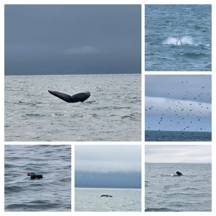We are back on the ship by 11 for a quick lunch before meeting our tour at 12:30 and walking back down the pier to the harbor fronting the city. We meet our boat captain and guides, who give us insulated wet suits to wear – both for the cold and lifesaving protection should the unthinkable occur (let’s not even go there!) – which most of don as we head out of the harbor for our 3-hour whale watching tour. (Again, let’s not go there with the 3-hour tour, Gilligan!)