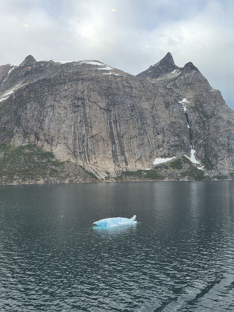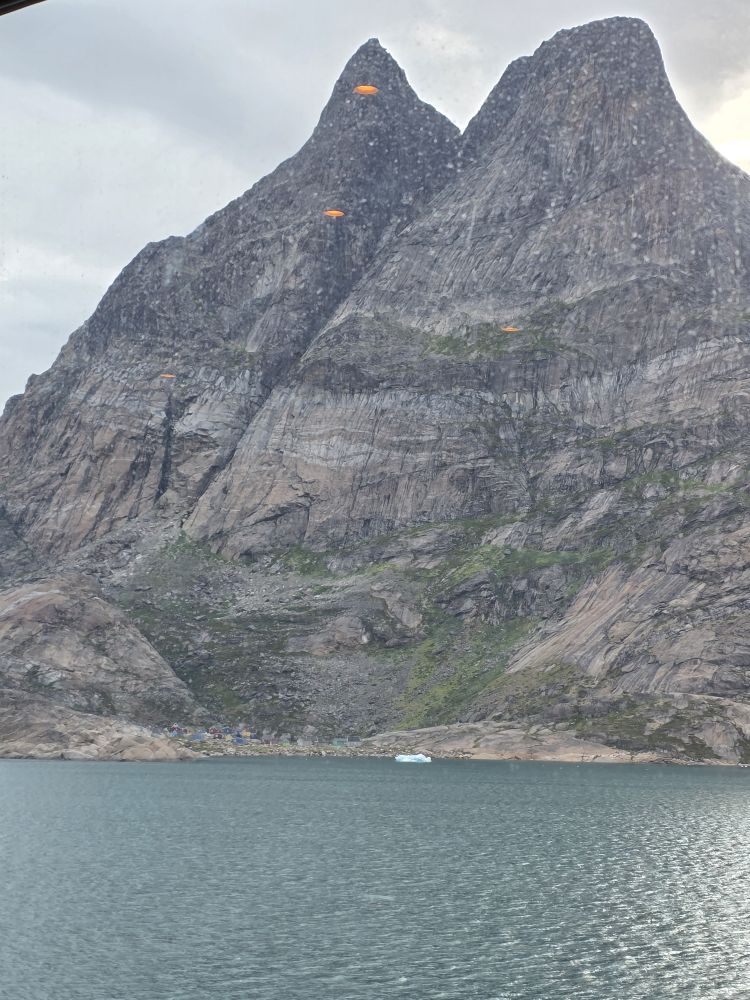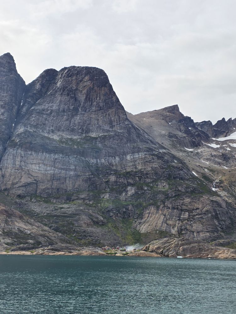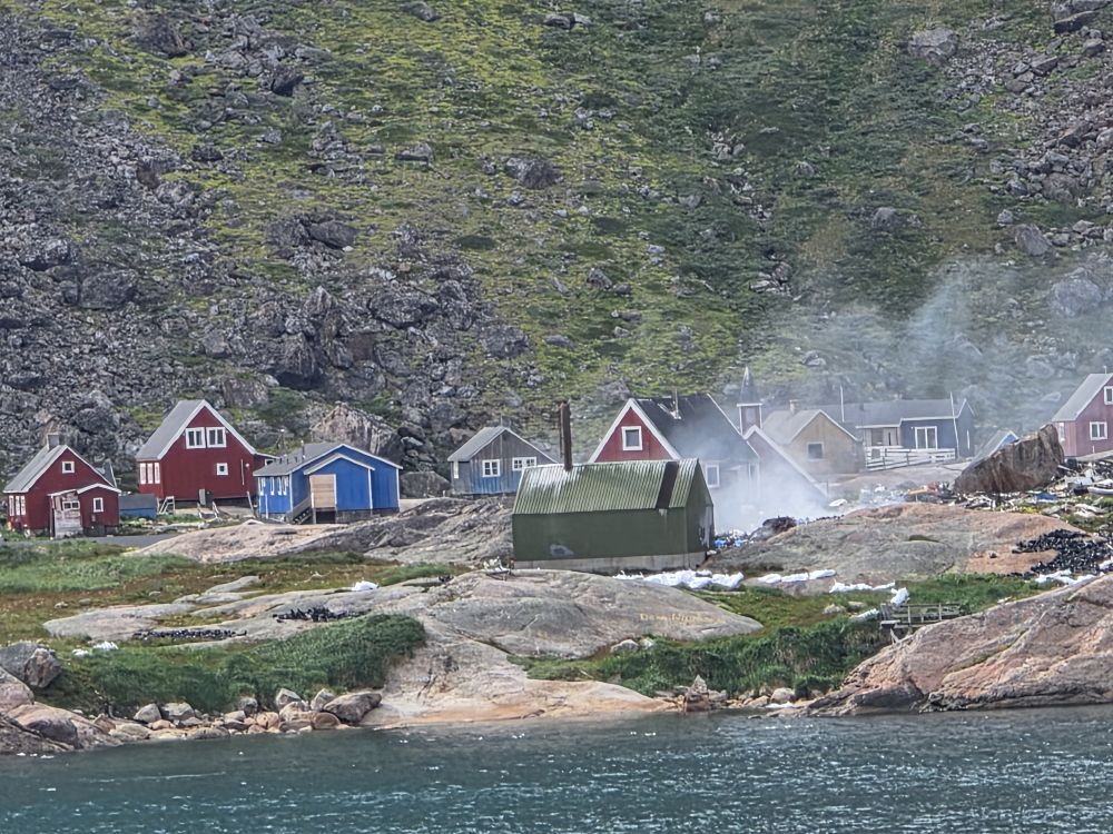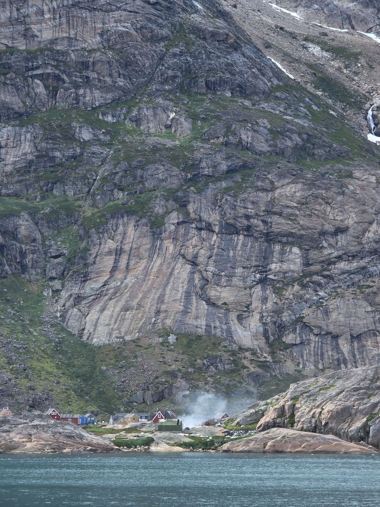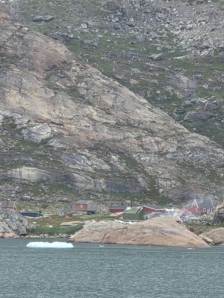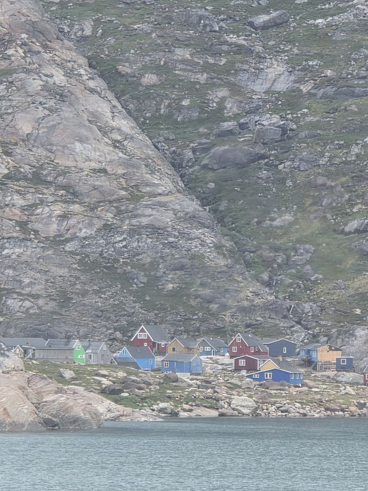 As we prepare, we pass this little town called Aappilattoq, completely isolated out in the fjord. A little speedboat has been going in and out of the fjord and we realize that is the only link to this little teeny outpost here at the base of the craggy cliffs. It is just crazy. 200 people, a church, a school. Amazing the life out here.