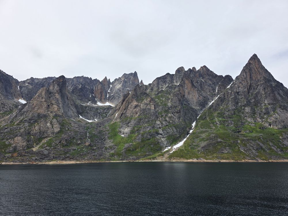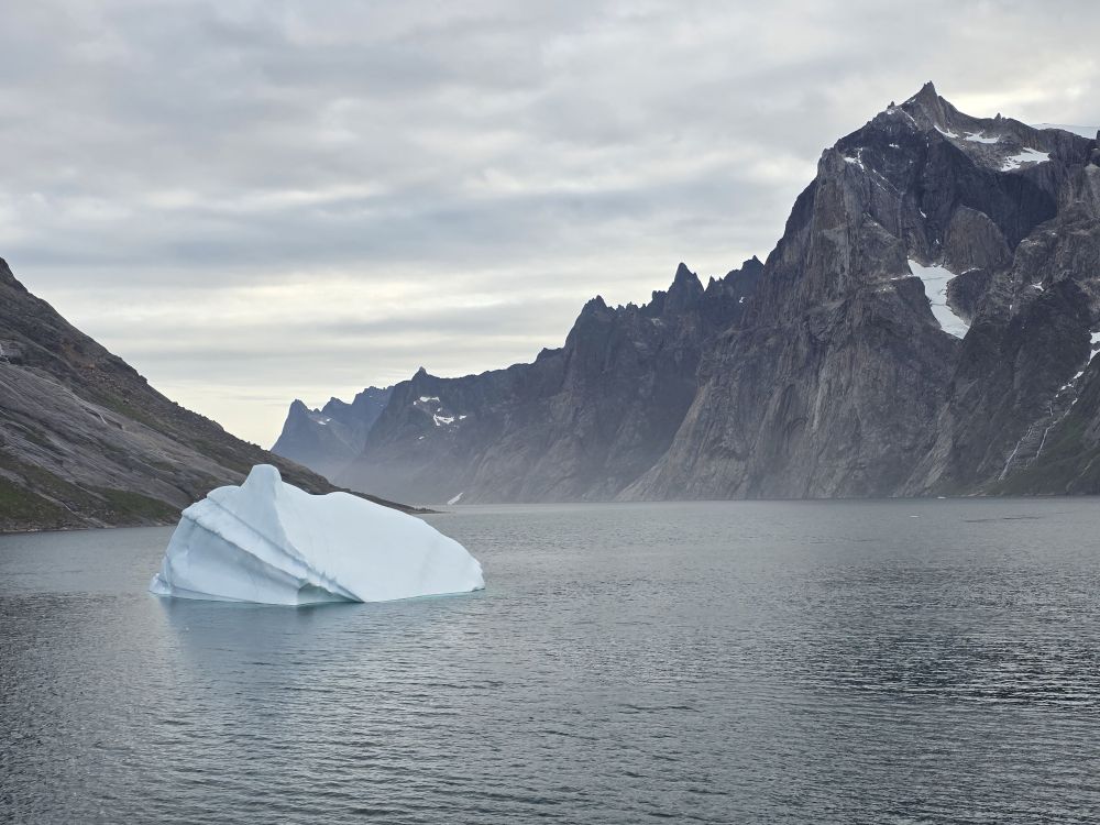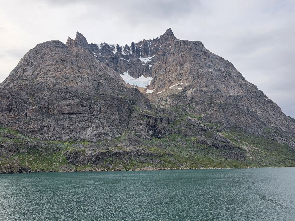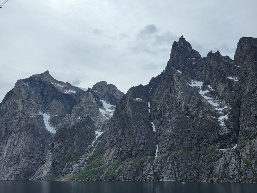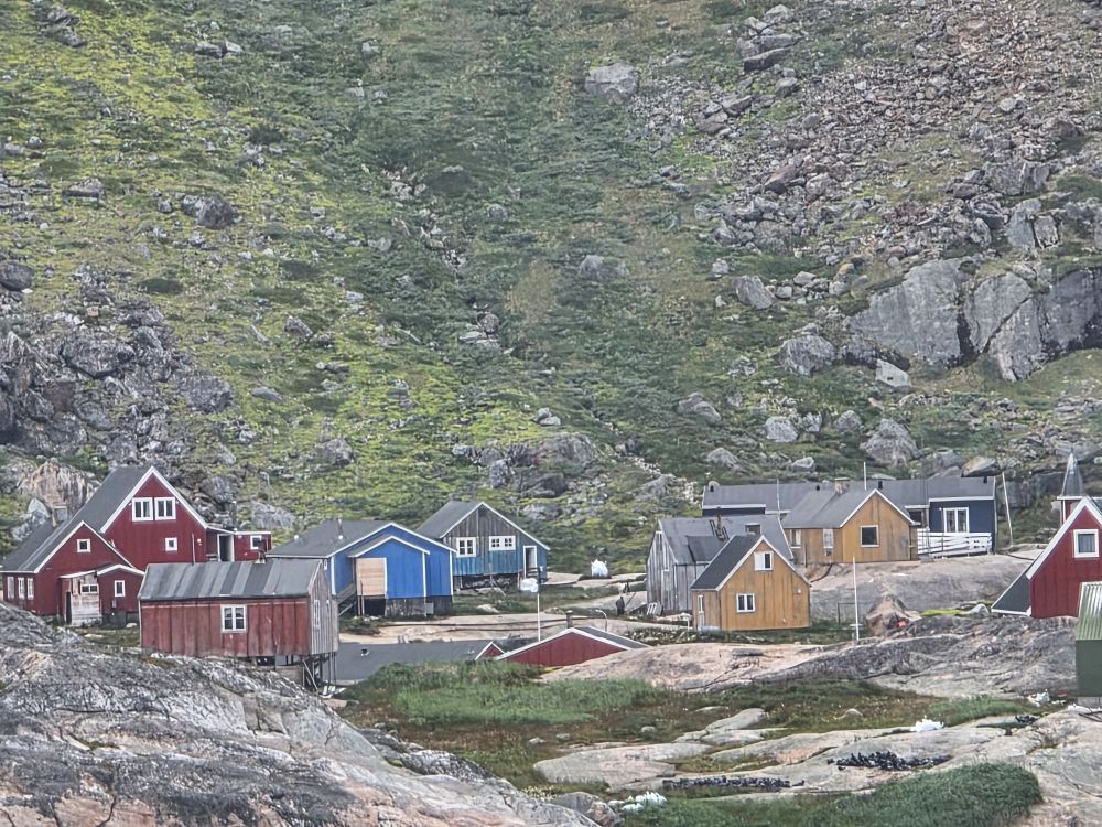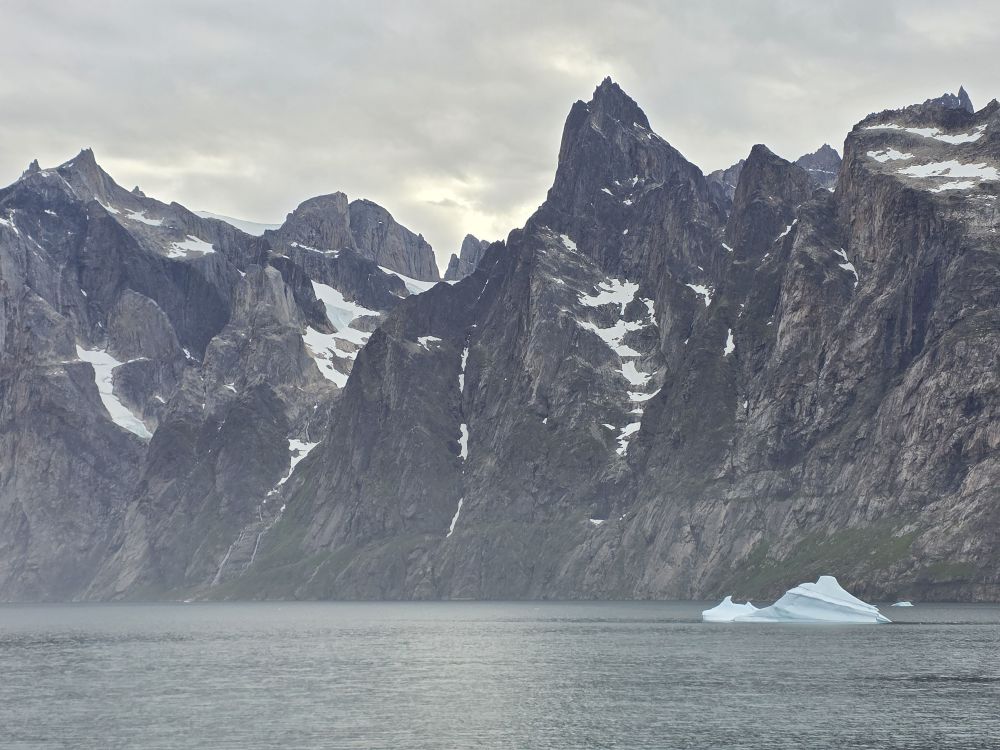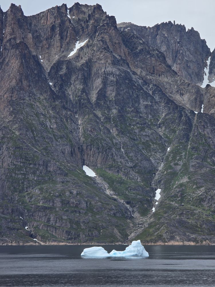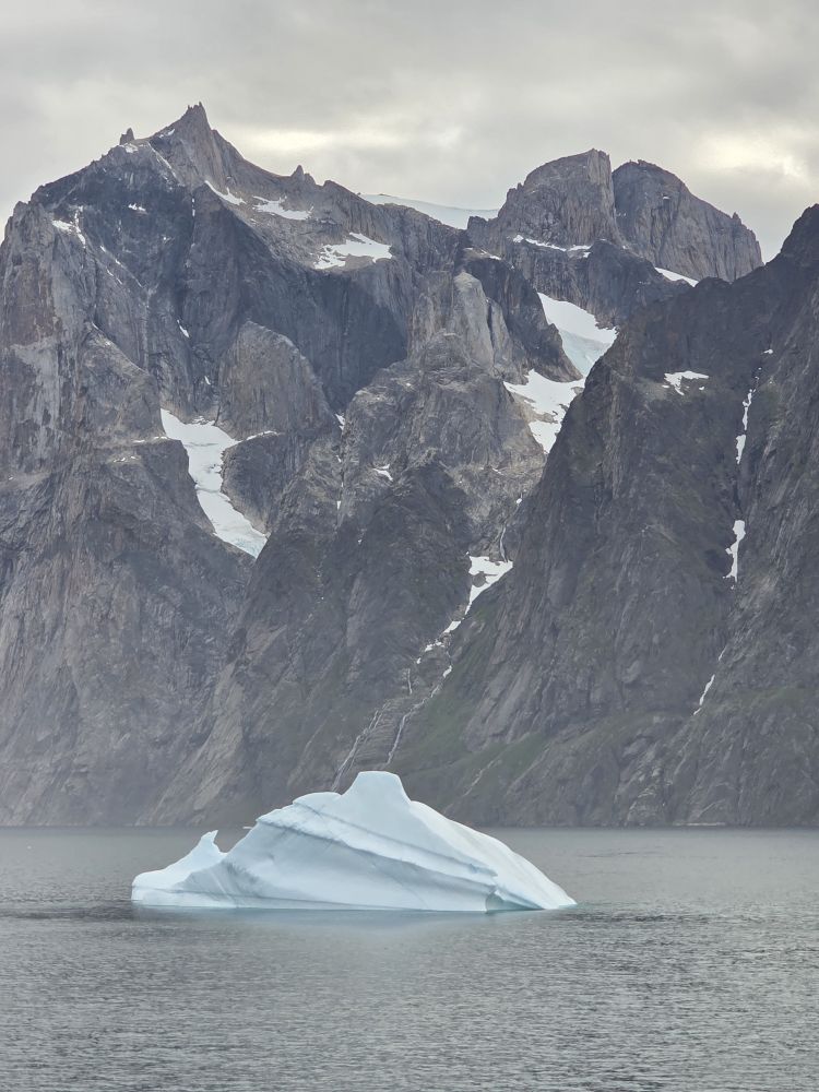 As we prepare, we pass this little town called Aappilattoq, completely isolated out in the fjord. A little speedboat has been going in and out of the fjord and we realize that is the only link to this little teeny outpost here at the base of the craggy cliffs. It is just crazy. 200 people, a church, a school. Amazing the life out here.