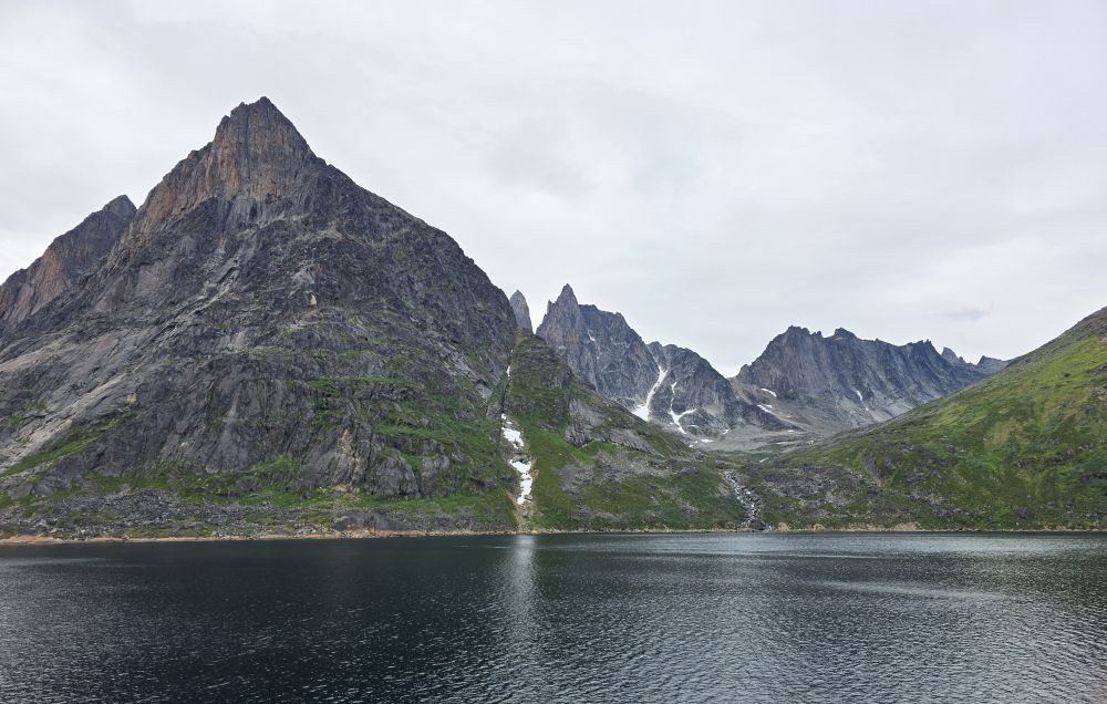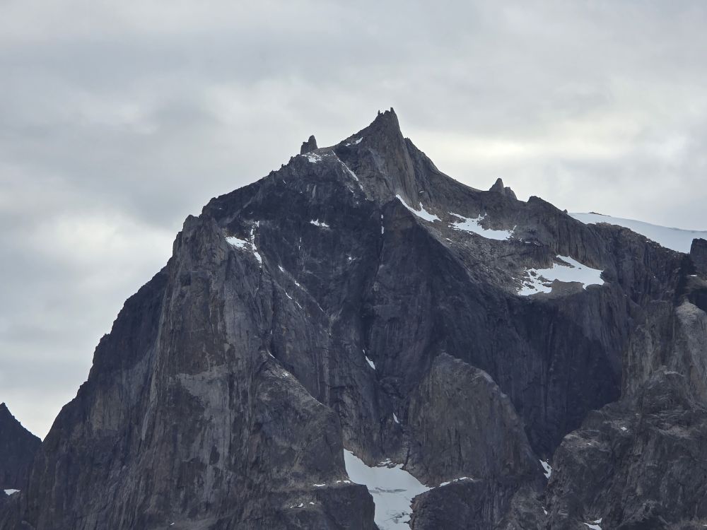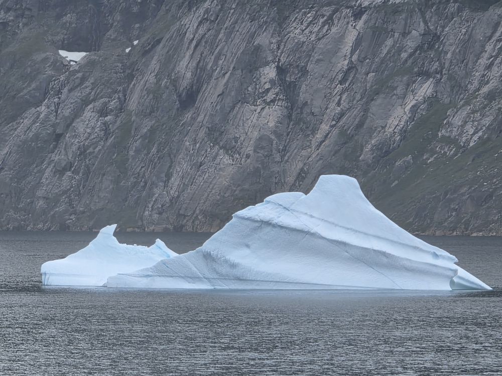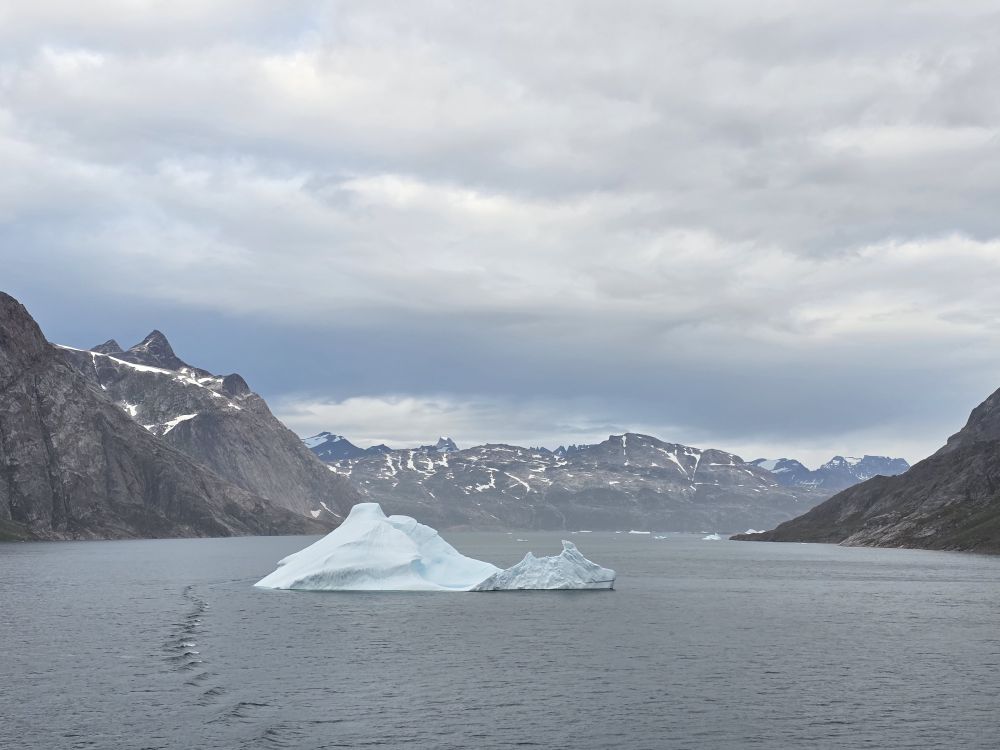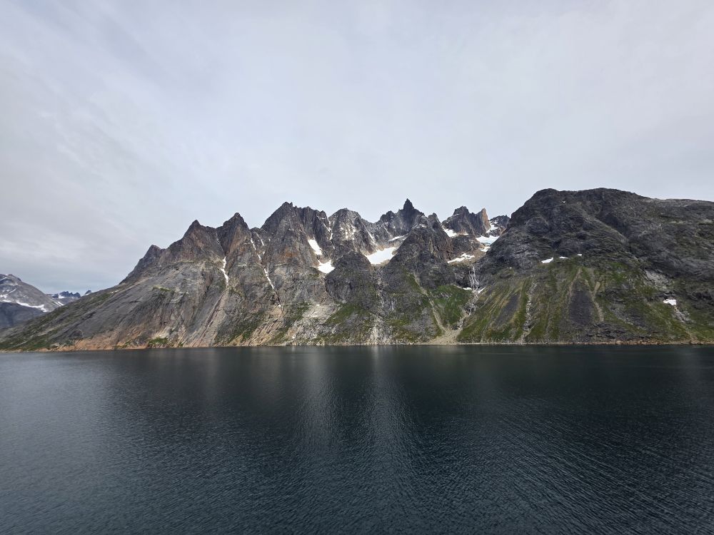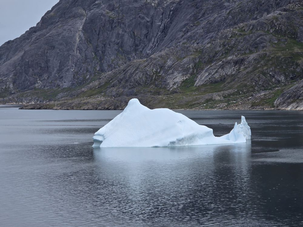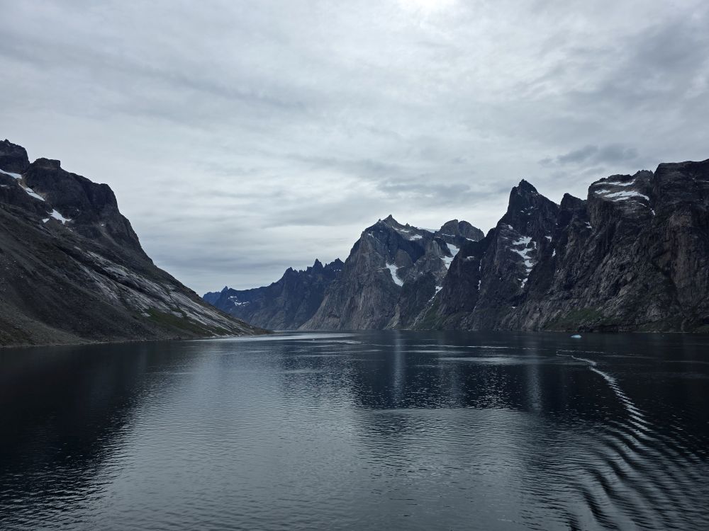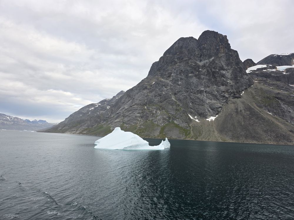 As we prepare, we pass this little town called Aappilattoq, completely isolated out in the fjord. A little speedboat has been going in and out of the fjord and we realize that is the only link to this little teeny outpost here at the base of the craggy cliffs. It is just crazy. 200 people, a church, a school. Amazing the life out here.