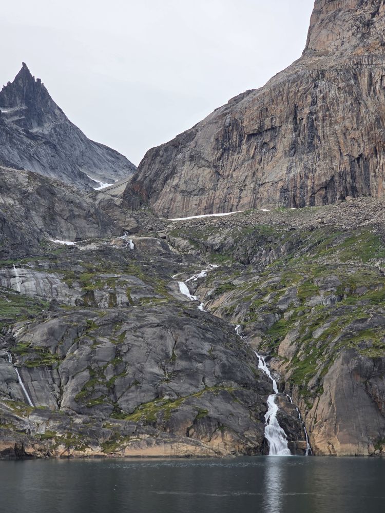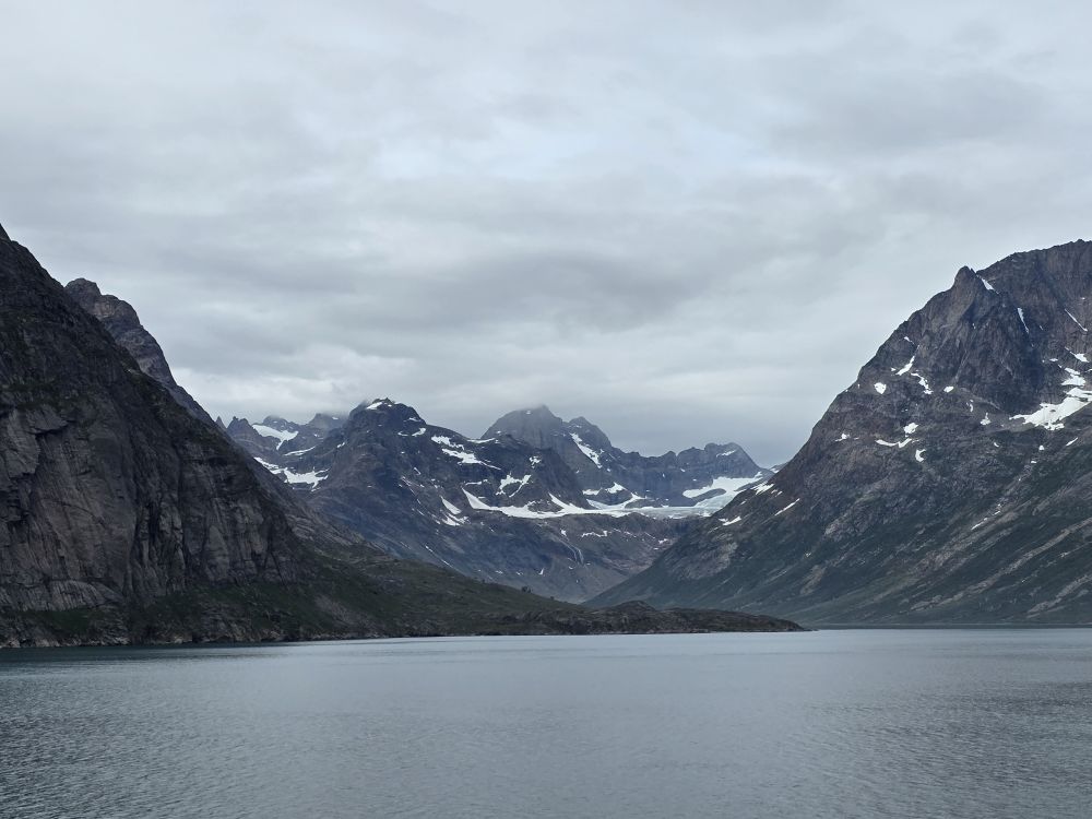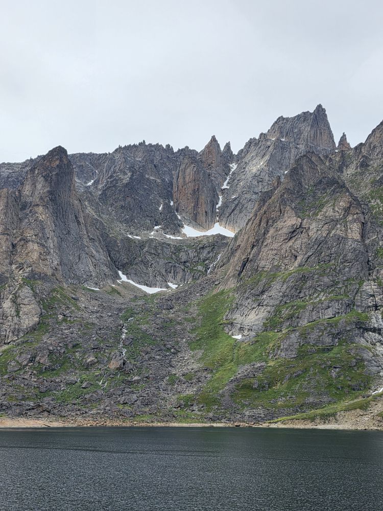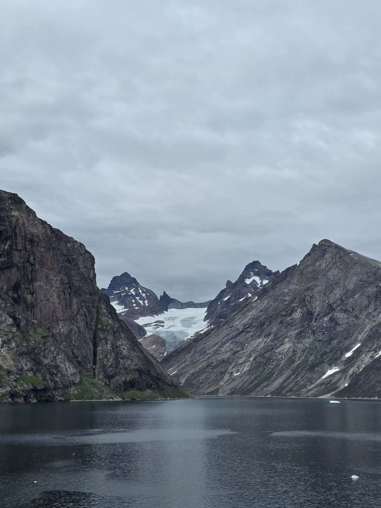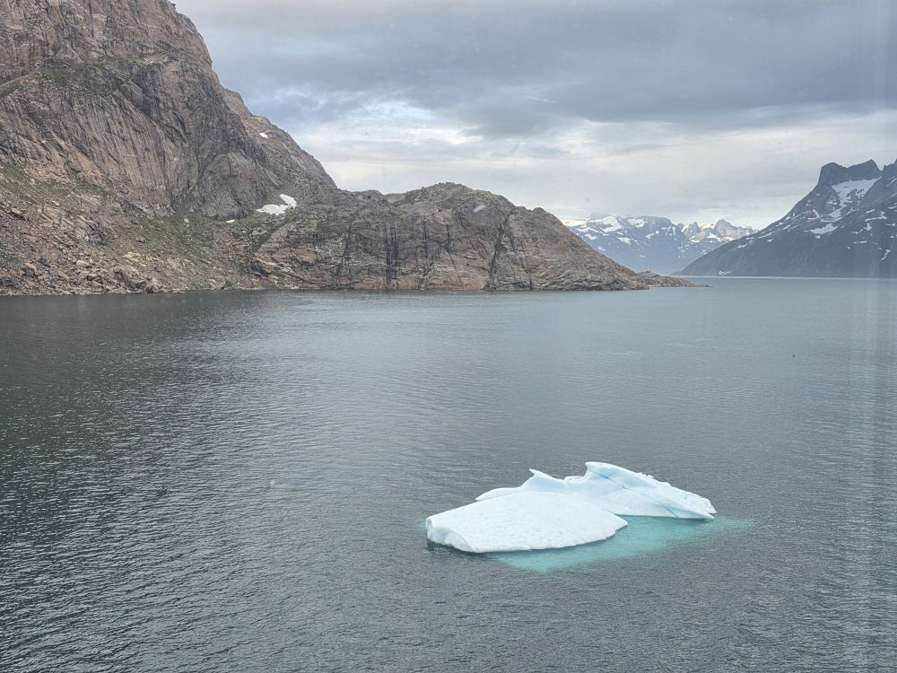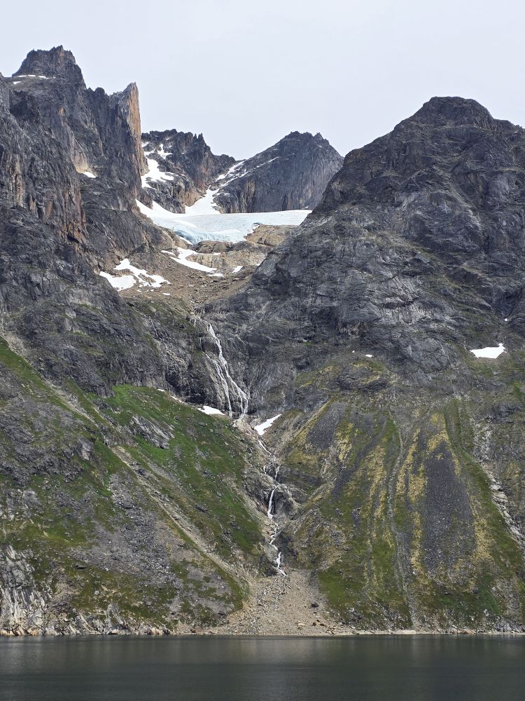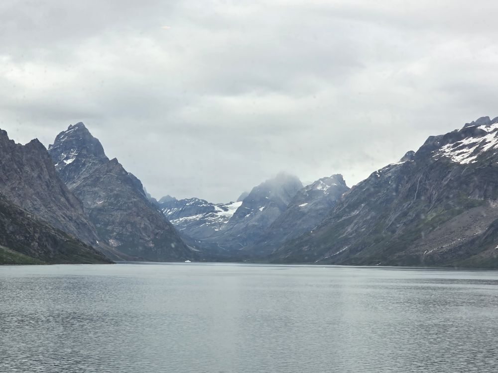 As we prepare, we pass this little town called Aappilattoq, completely isolated out in the fjord. A little speedboat has been going in and out of the fjord and we realize that is the only link to this little teeny outpost here at the base of the craggy cliffs. It is just crazy. 200 people, a church, a school. Amazing the life out here.