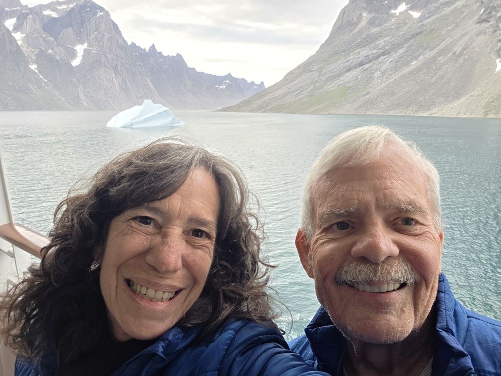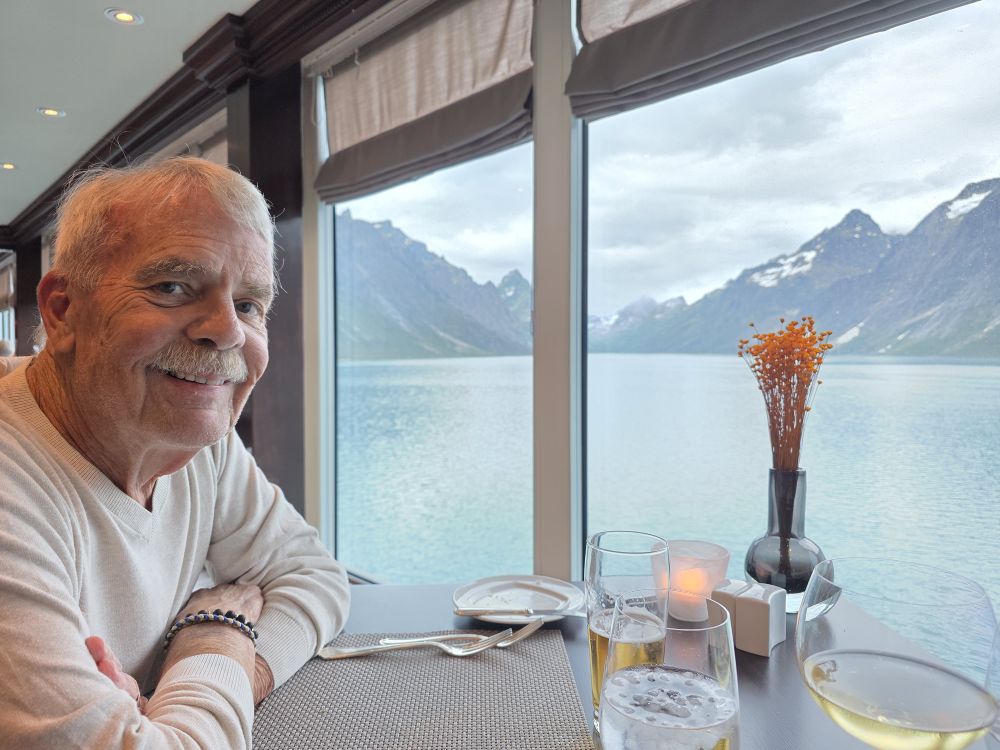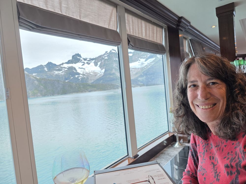 Up in the restaurant, Jeanie greets us and apologizes as she puts us at a little 2 top against the wall. There are no window tables available. That’s fine for us, we can still see outside, what do we care. After getting our drinks, though, Jeanie comes back and tells us she is “transferring” us to the window table that was just vacated. How nice was that? So we spent a lovely, long dinner watching the incredible scenery, passing the little town again, getting great pictures from up high, and having our pictures taken with the iceberg that is floating by. Totally fun dinner.