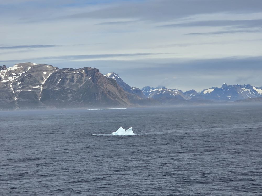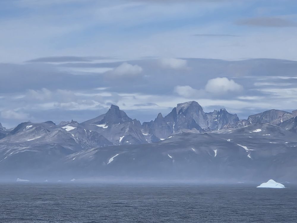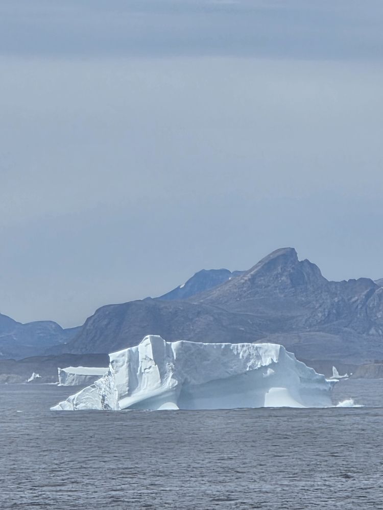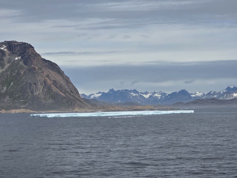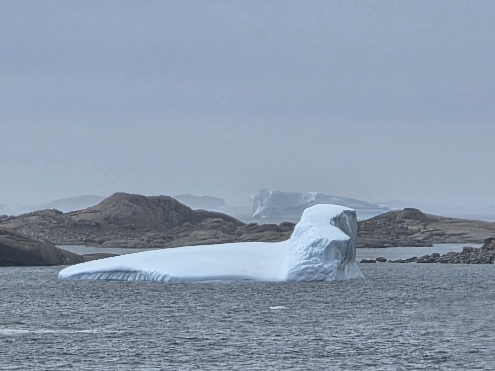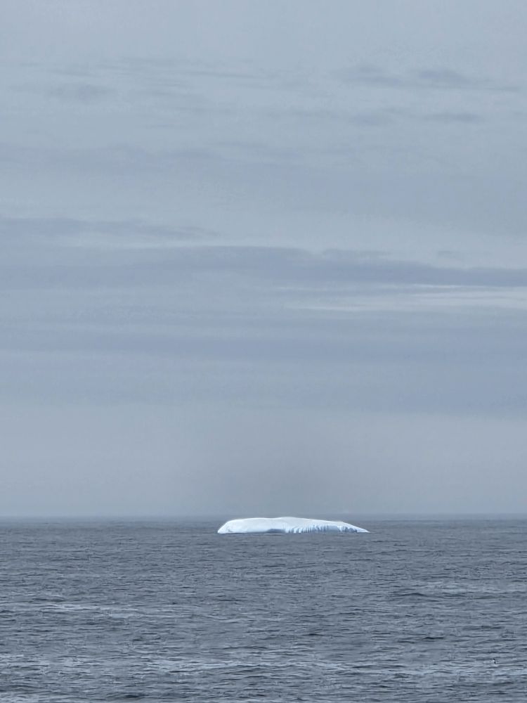 Around 1pm, we start to see land – gorgeous snowcapped peaks out there in the distance along with awesome icebergs. Wedges, tabulars, pinnacled. They all start showing up throughout the afternoon as we get closer and closer to the entrance of the Sound.