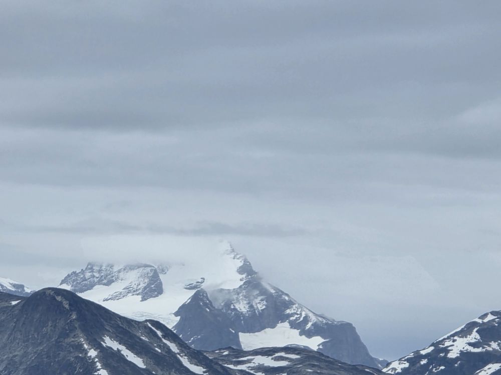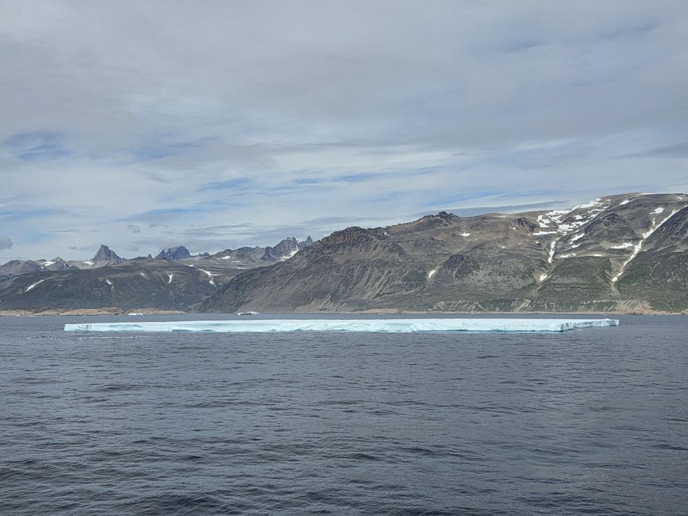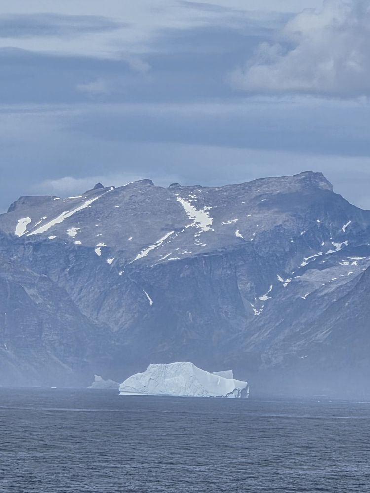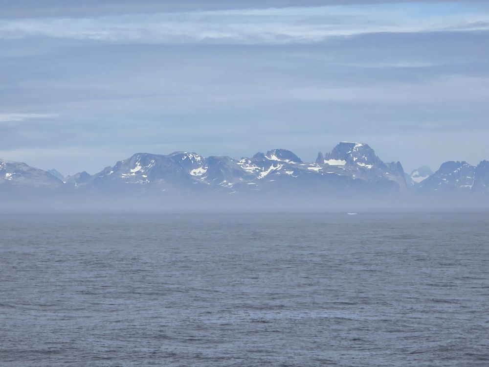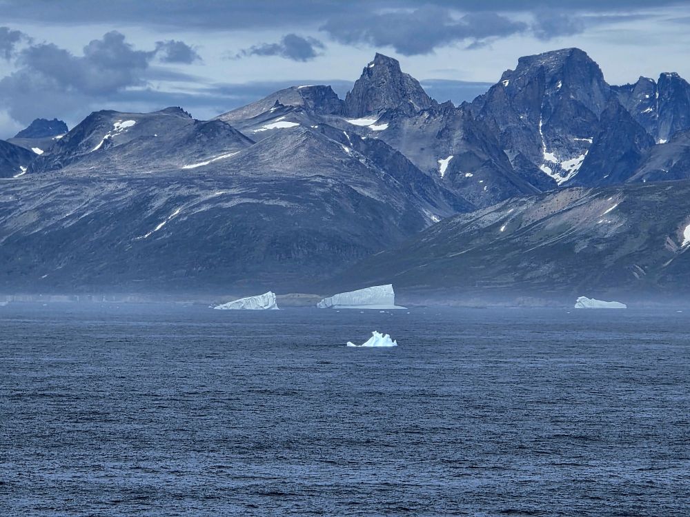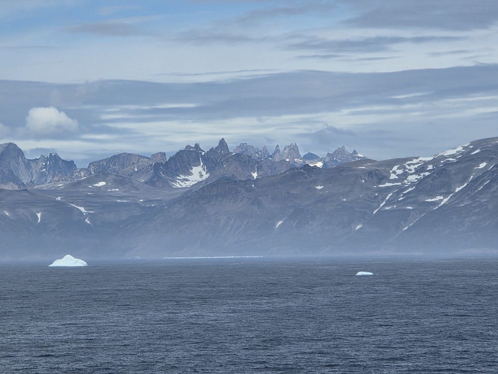 Around 1pm, we start to see land – gorgeous snowcapped peaks out there in the distance along with awesome icebergs. Wedges, tabulars, pinnacled. They all start showing up throughout the afternoon as we get closer and closer to the entrance of the Sound.