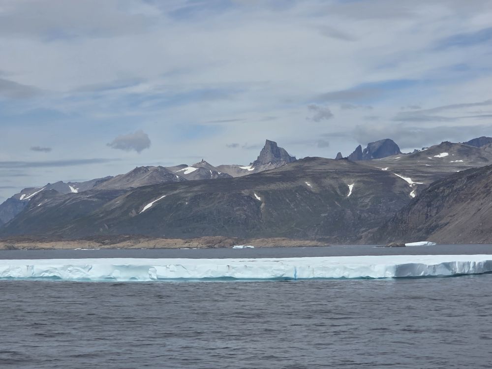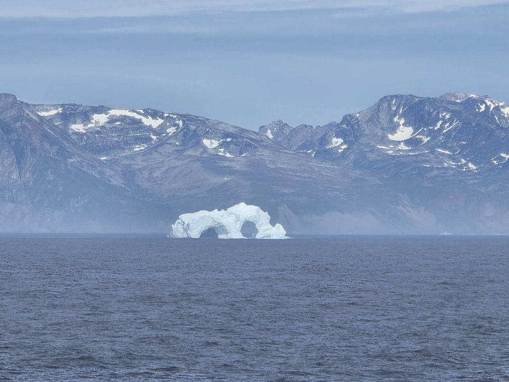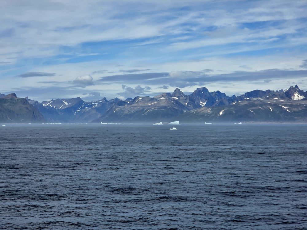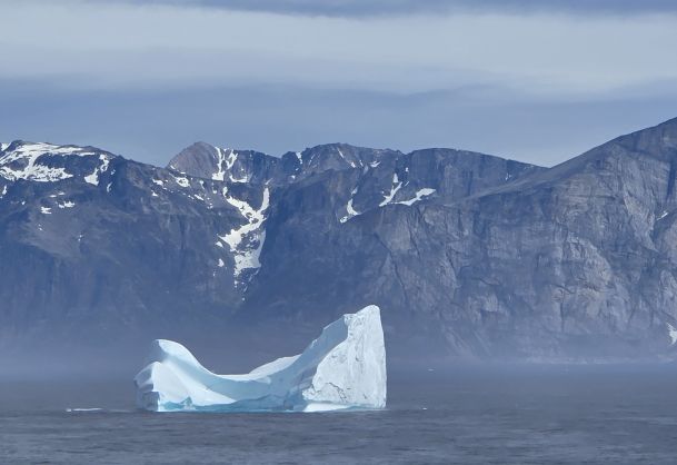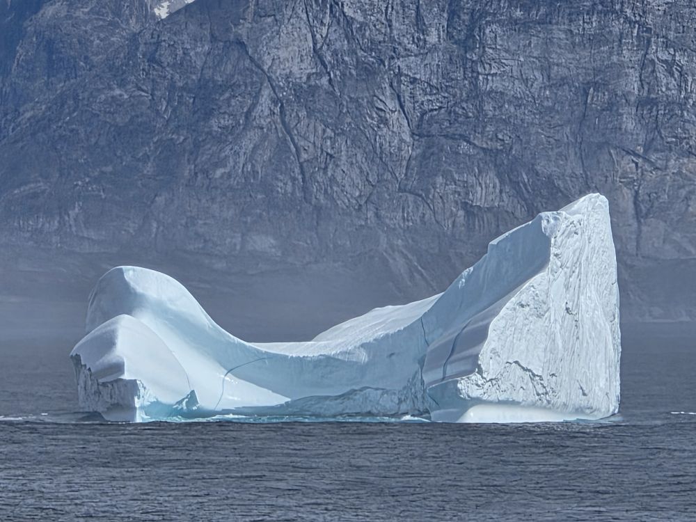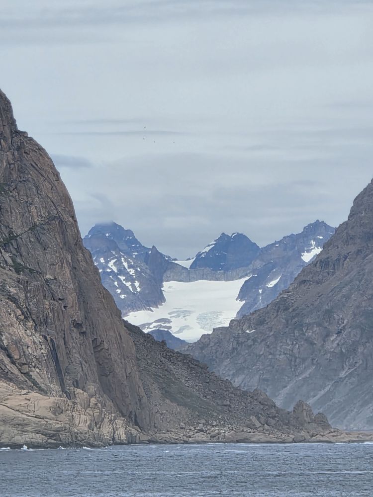Around 1pm, we start to see land – gorgeous snowcapped peaks out there in the distance along with awesome icebergs. Wedges, tabulars, pinnacled. They all start showing up throughout the afternoon as we get closer and closer to the entrance of the Sound.