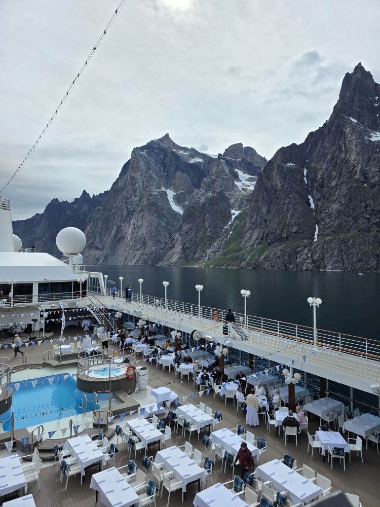 It is so peaceful and beautiful and quiet – almost mystical and reverent. But remember White Night? Well, it is all set up, and people are starting to appear in their puffy coats, grabbing tables. To be fair, down on the pool deck, it isn’t quite as cold as up here on 10 where the wind is whipping, but still. We hang out long enough to watch the set up, take more stunning photos, then head down to the warmth and comfort of our cabin to get ready for Prime C. But still, in this gorgeous pristine environment, it seems almost sacrilege to have a huge, loud party on the deck, blasting Tonight’s Gonna Be A Good Night and line dancing and conga lines. Maybe we are jaded? Or just over White Night? Could be…..