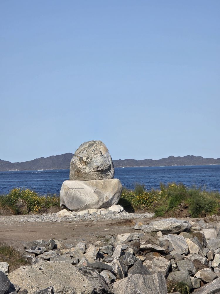 Even with all our wanderings, we are still too early for the National museum, so we waste time taking some photos of the outside of the old buildings housing the museum, the train oil production display (a huge industry here at one time), and then some interesting rock sculpture/statue and old wooden boat along the shoreline. Then we just sat on the front step of the museum, in the sun, waiting for opening time.